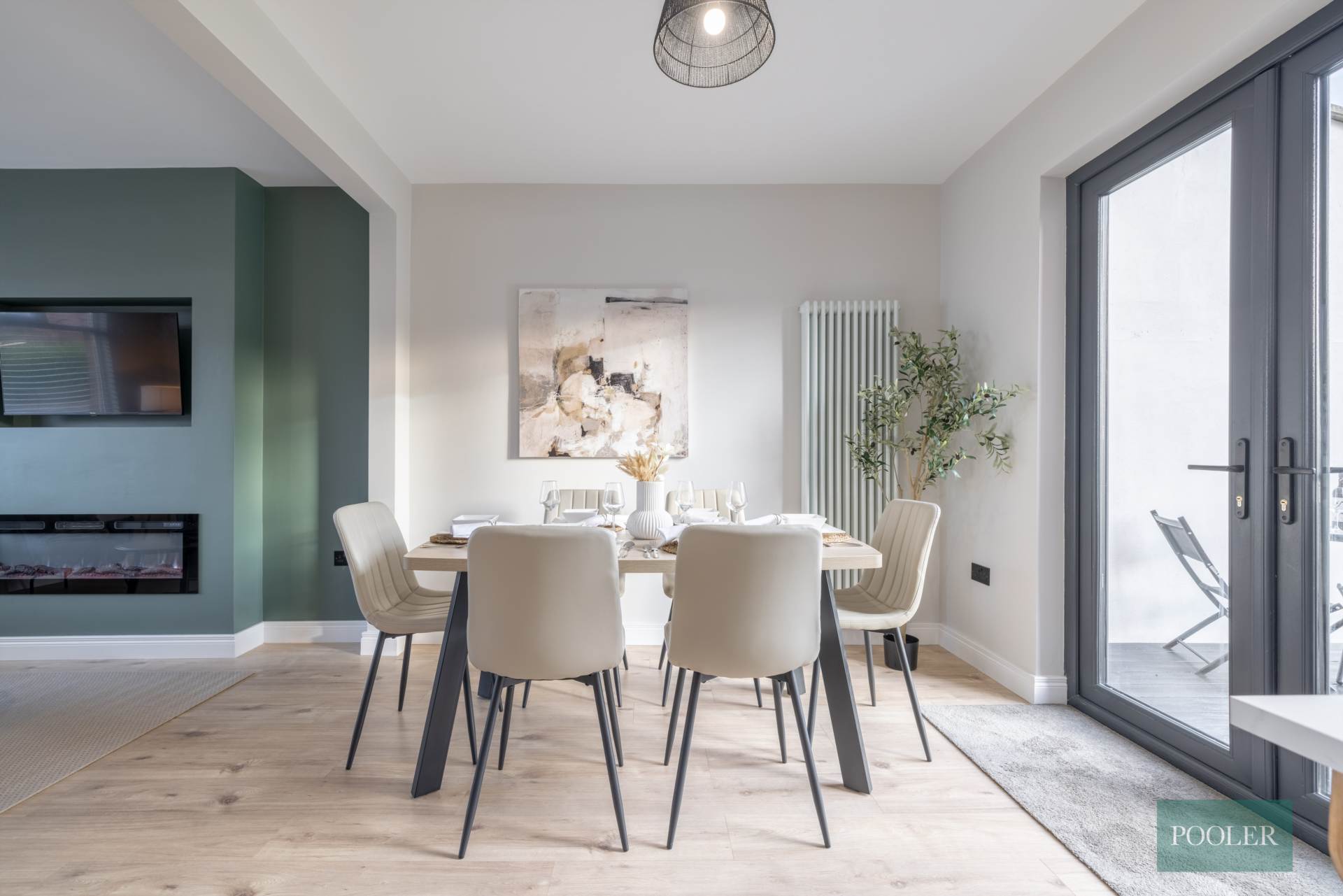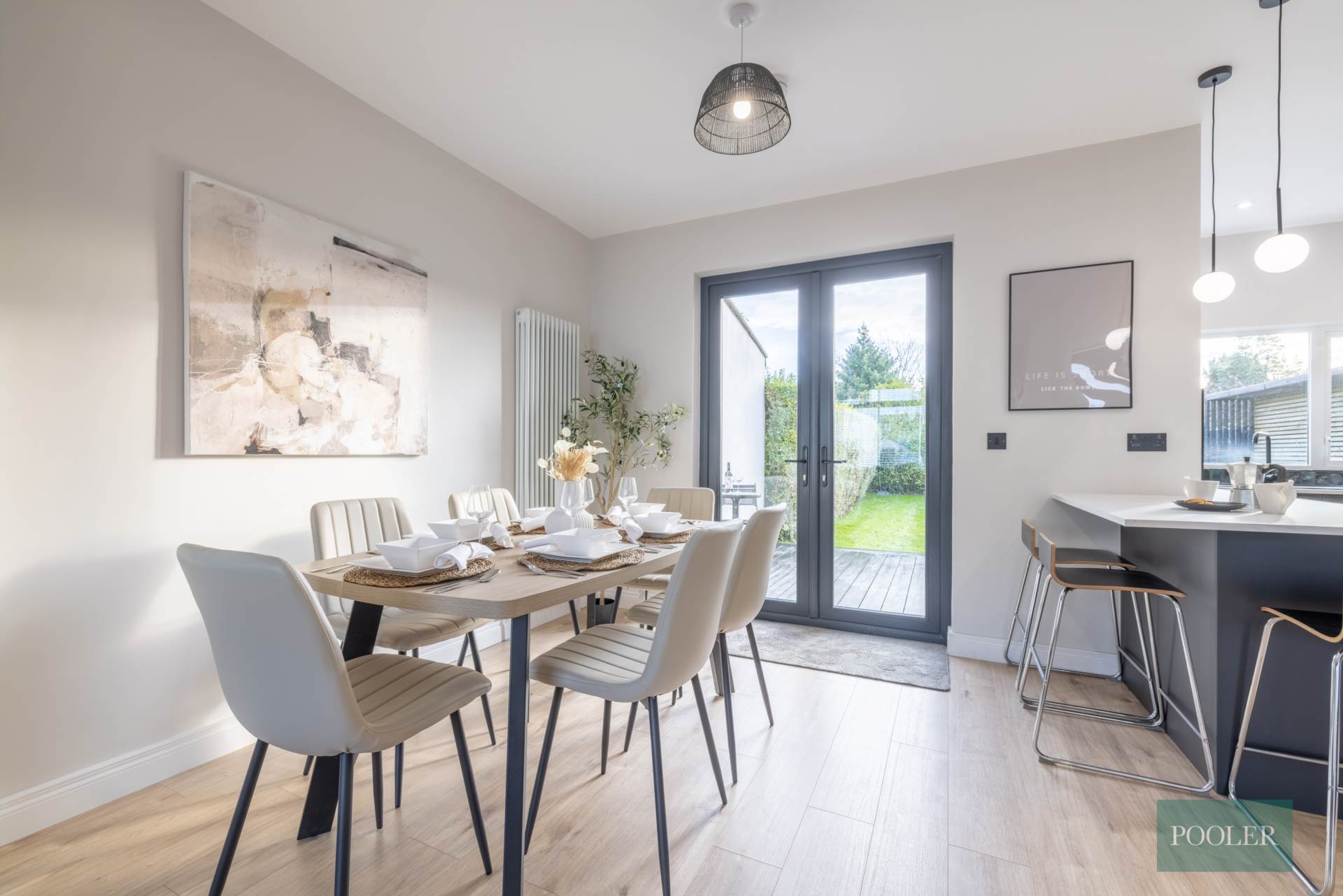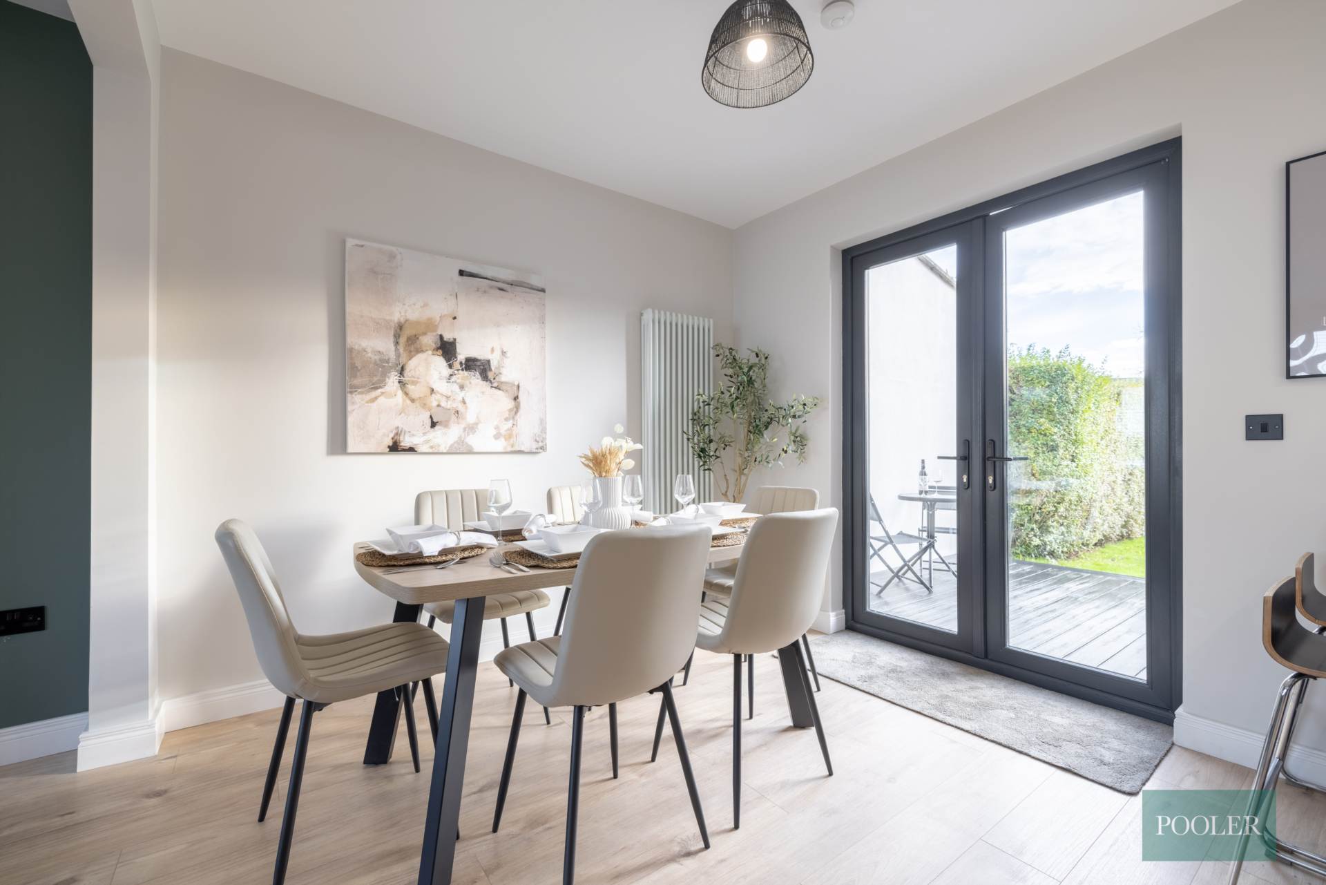 Dining - Dropped lighting, vertical radiator, timber laminate floor and black Frence doors to garden