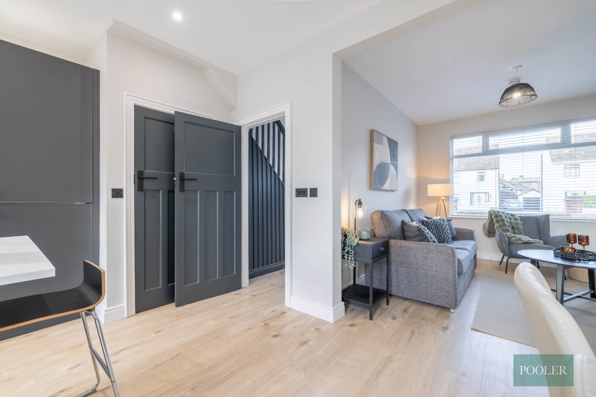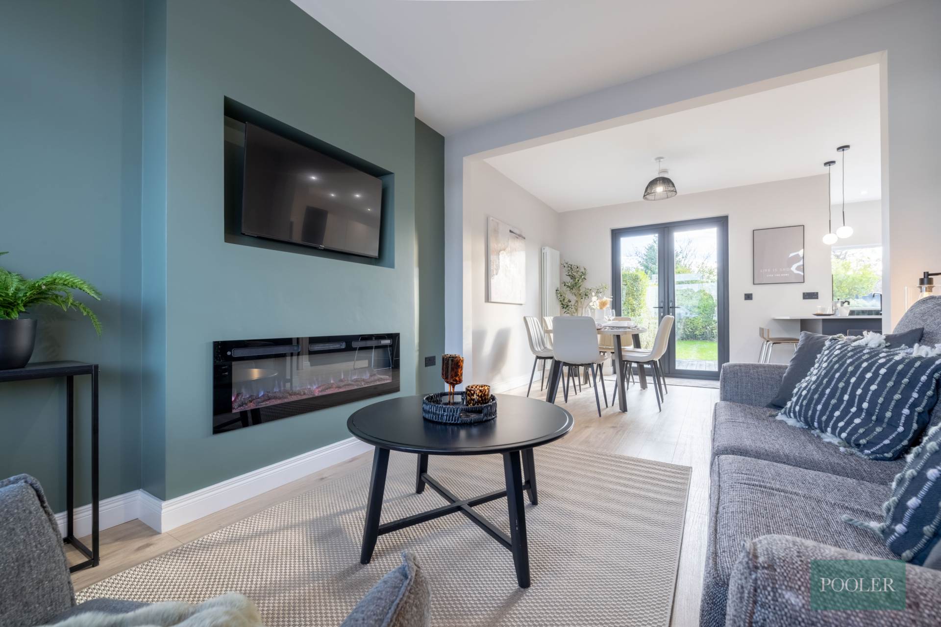 Inside, the property opens into an elegant entrance hall featuring bespoke timber detailing, setting the tone for the high-quality finish throughout. To the front, the living room provides a warm and inviting space, enhanced by a feature electric fire. A convenient downstairs W.C. adds practicality for modern family living.