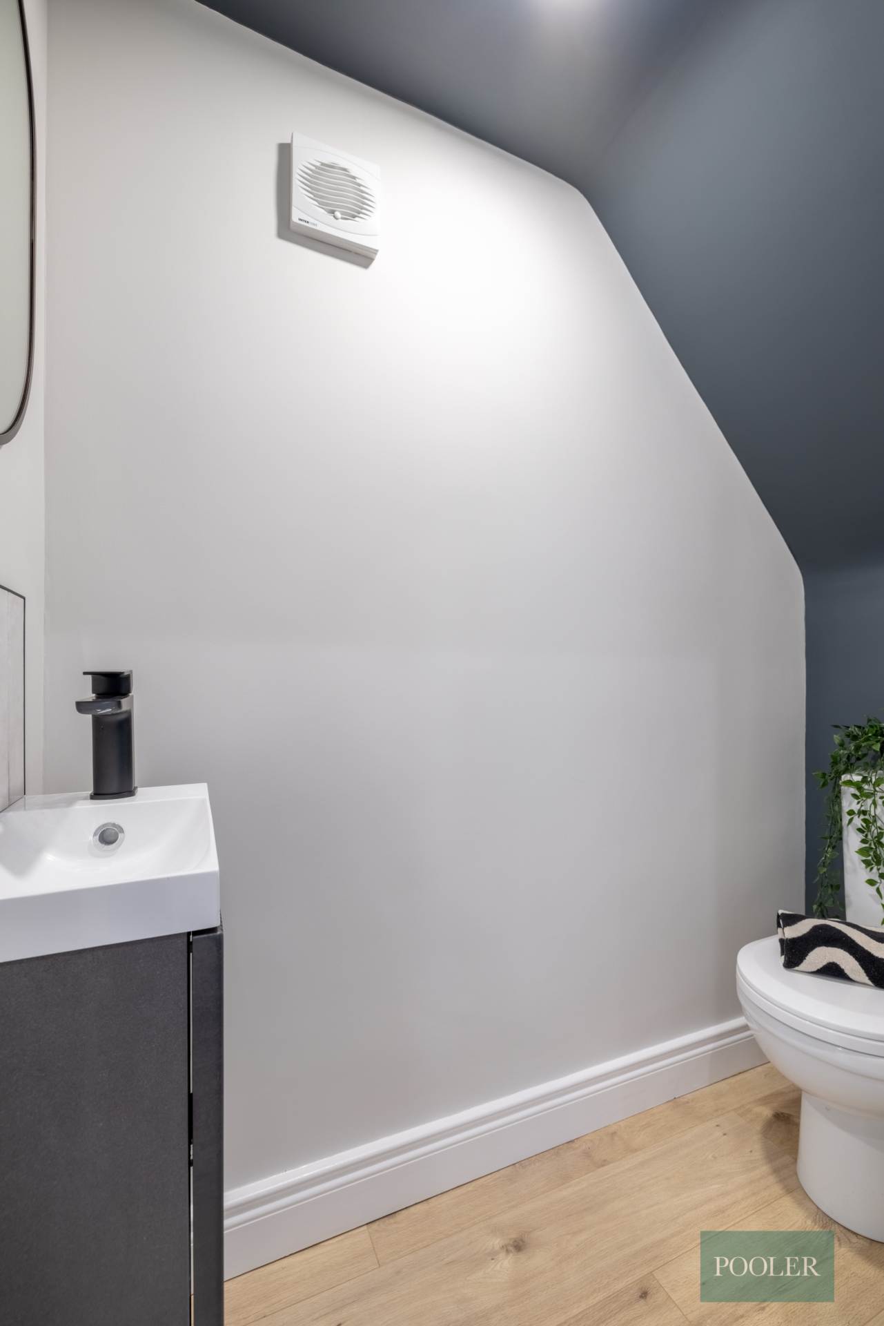 Wash hand basin in vanity unit with black tap, W.C., timber laminate floor and extractor fan