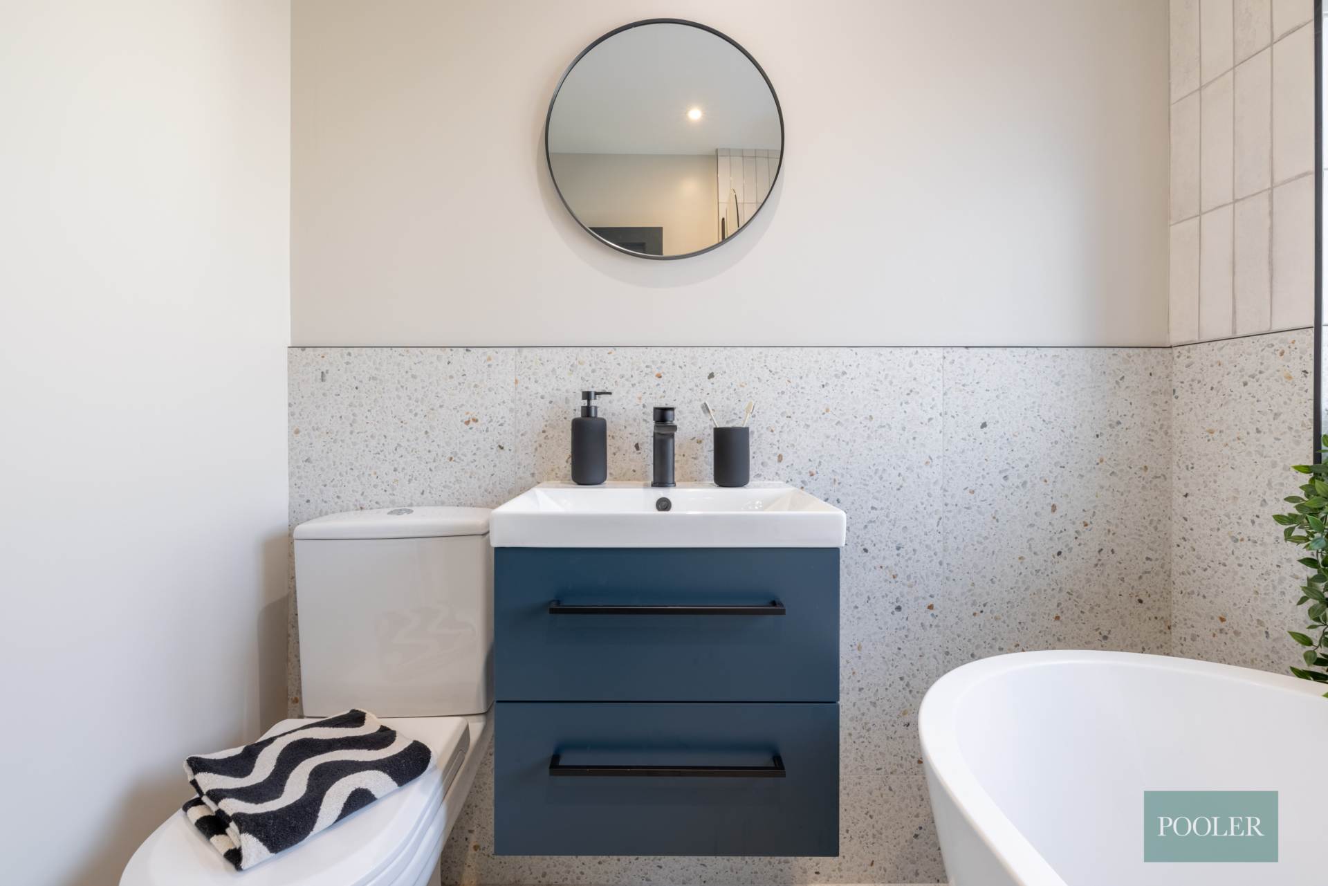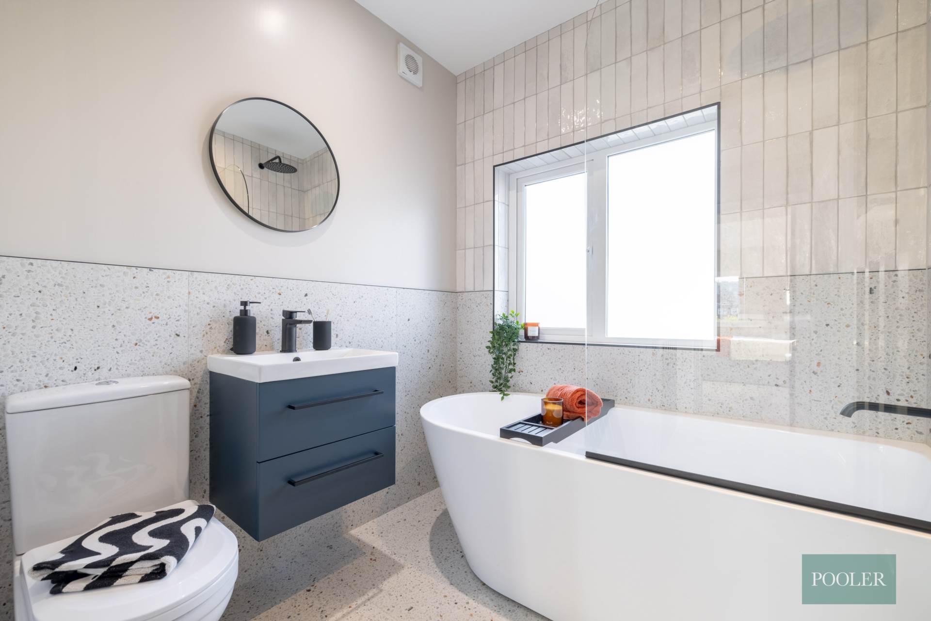 Newly fitted bathroom - Modern bath with concealed thermostatic shower, black rainfall head and taps, recess for storage, wash hand basin in navy two drawer, wall hung vanity unit with black mixer tap, W.C., stylish contemporary wall tiling, terrazzo style floor tiling, recessed spotlights and extractor fan
