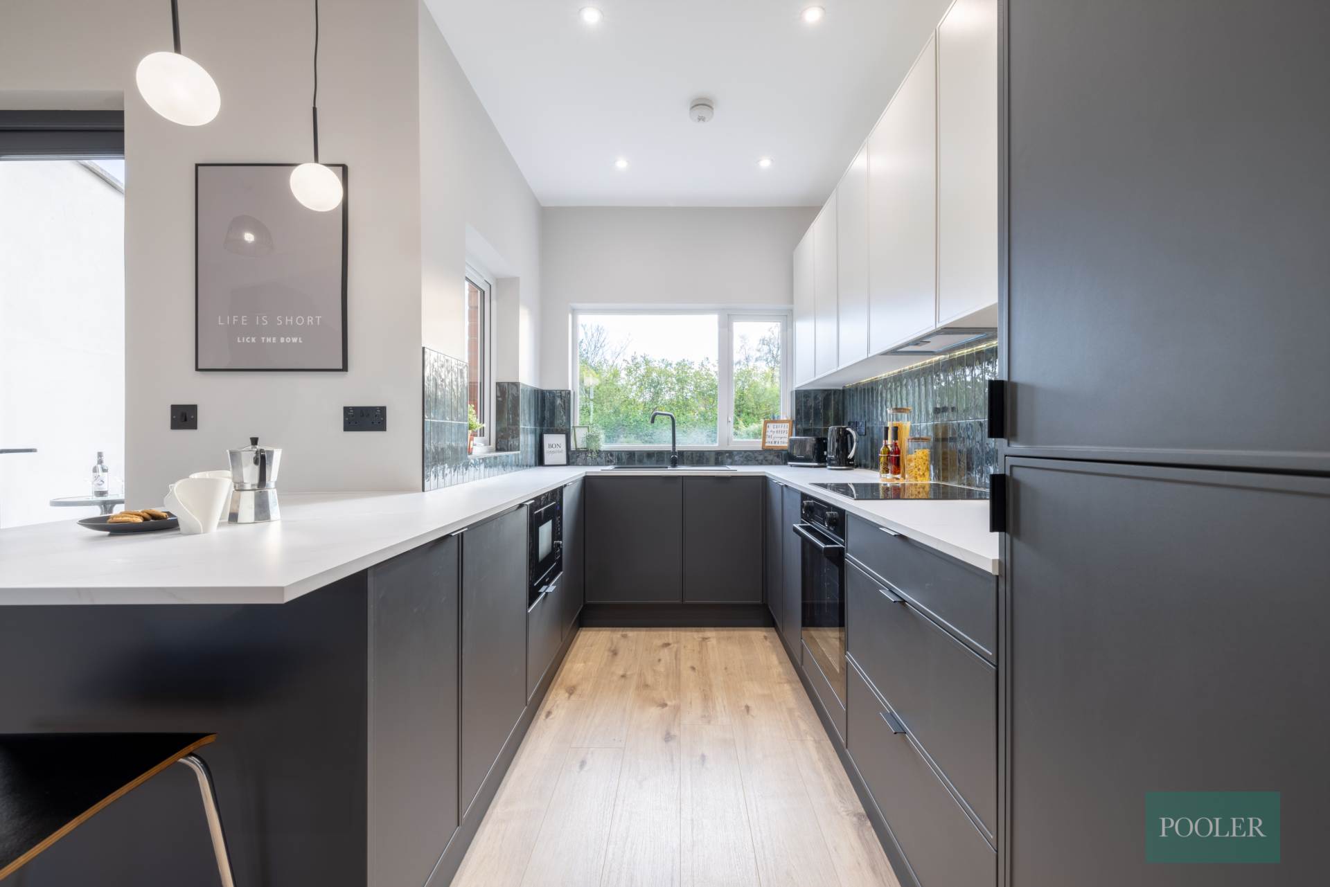 Kitchen - Newly fitted range of high and low level units in anthracite and white grey super matt finish, integrated black oven, integrated microwave, integrated fridge freezer, integrated slimline dishwasher, recess for integrated washing machine, black sink and mixer tap, glazed wall tiling, recessed spotlights and timber laminate floor