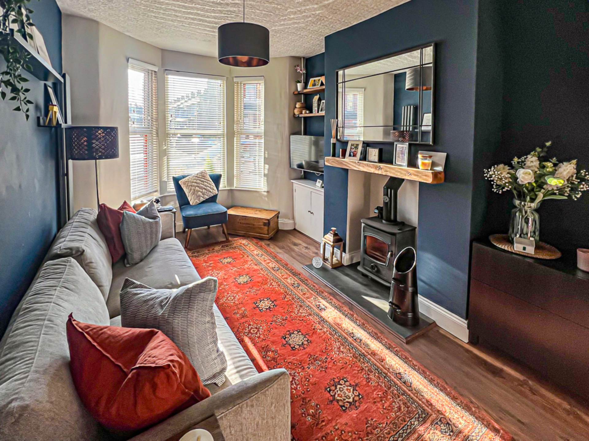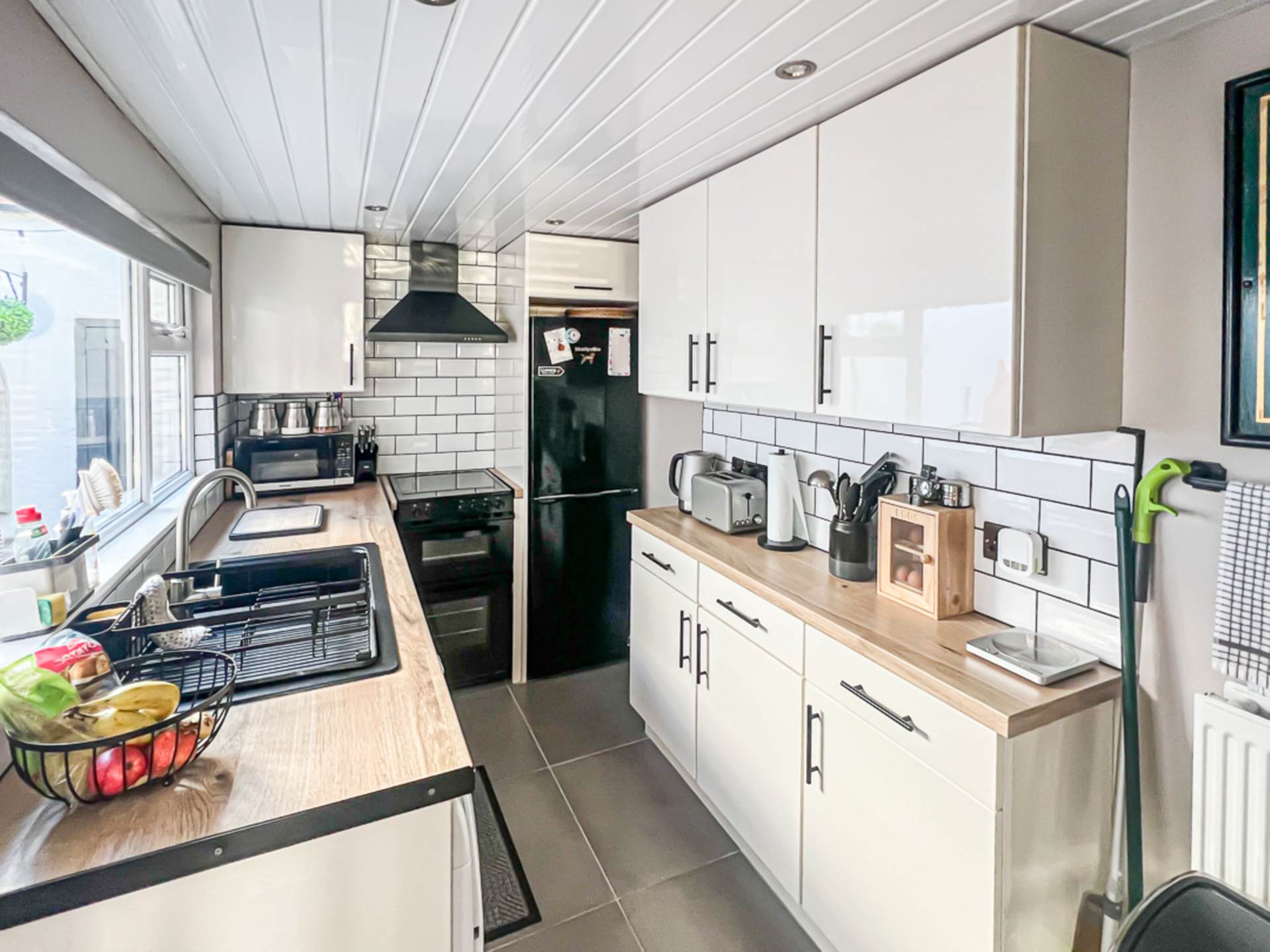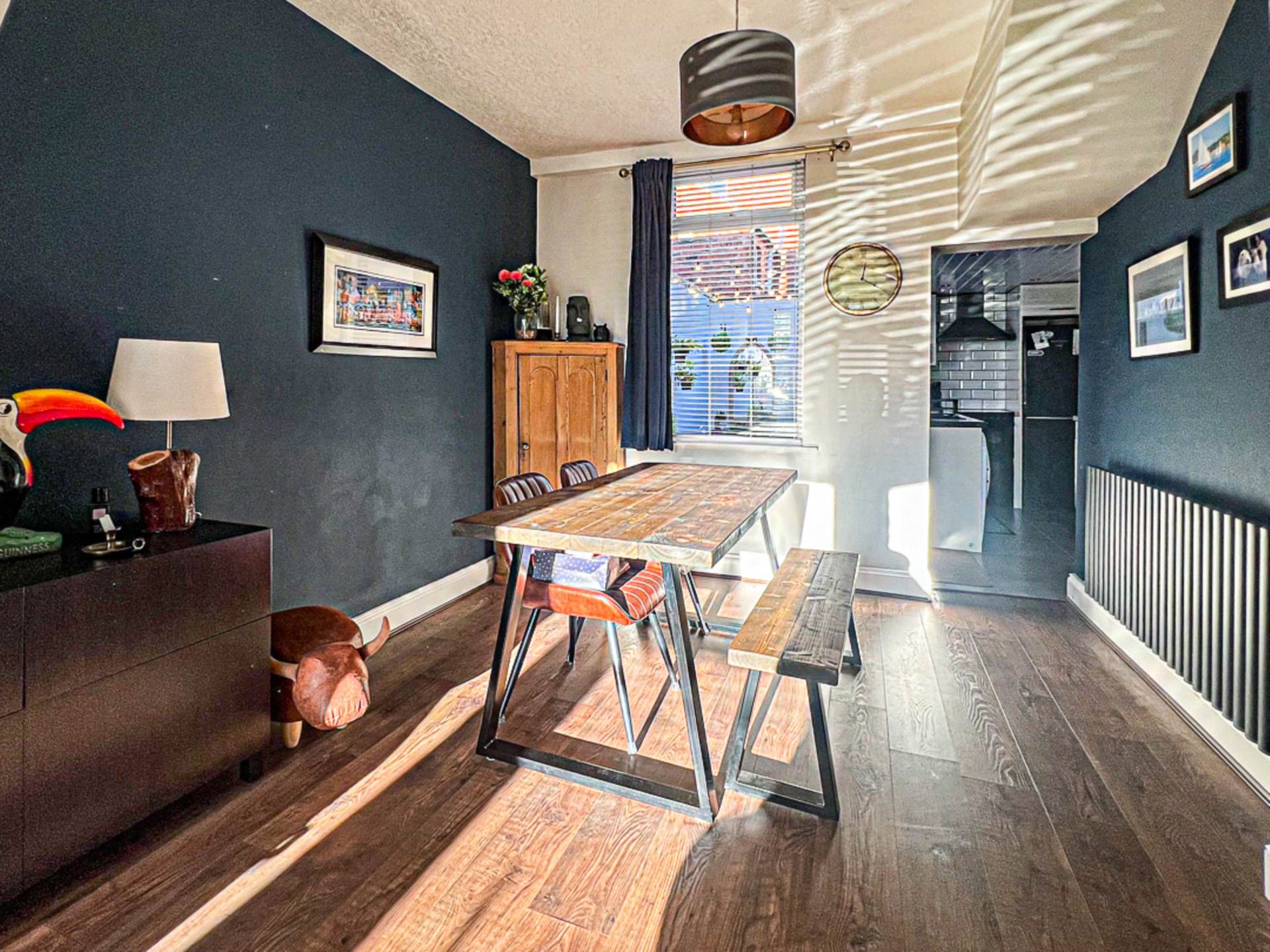 Inside, the property features an inviting entrance hall with decorative tiled flooring, leading to a spacious through lounge complete with bay window and a multi-purpose burner perfect for cosy evenings. The modern kitchen is well-appointed and provides direct access to a charming enclosed rear yard, ideal for relaxing or entertaining.