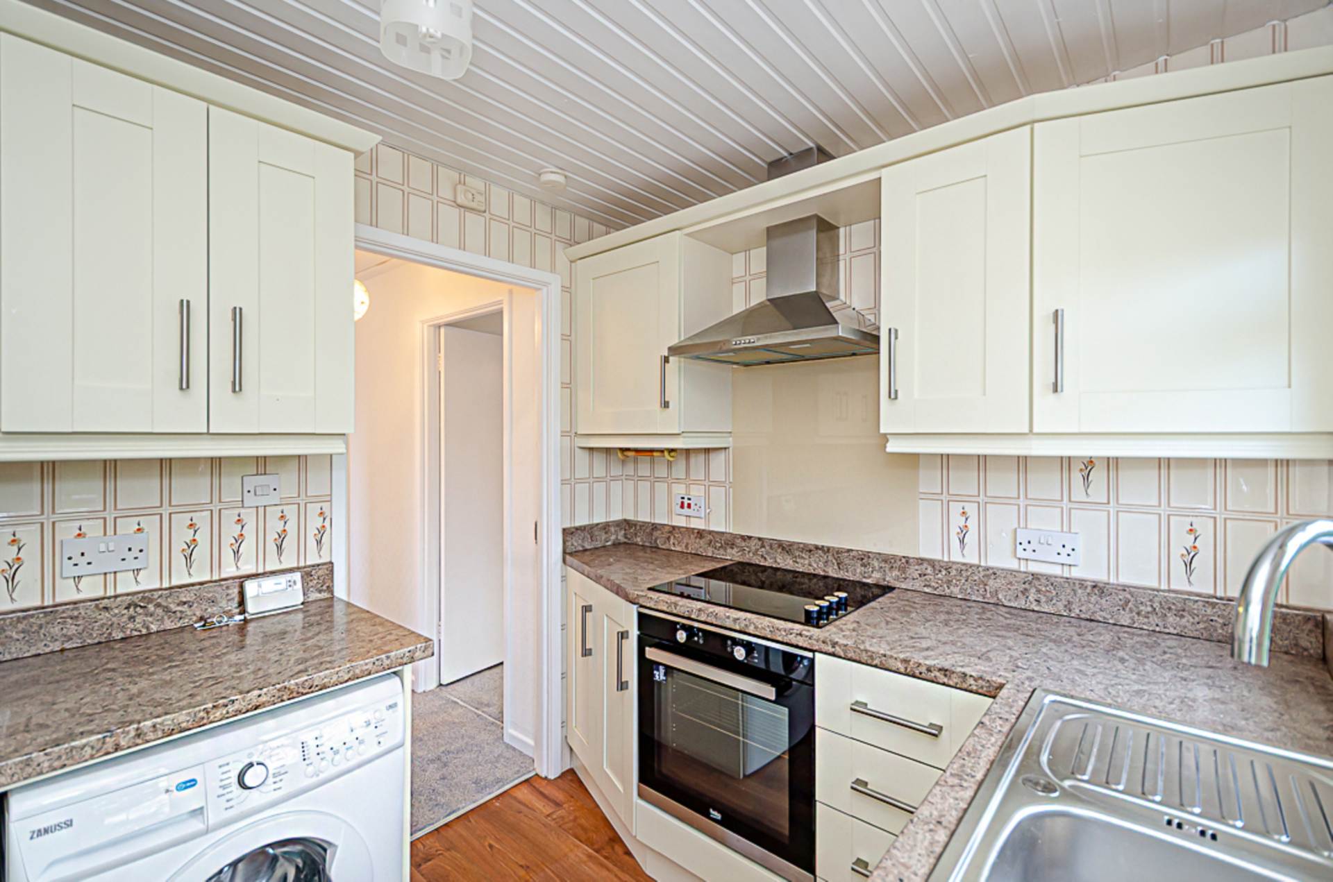 Kitchen - 9'8" (2.95m) x 7'1" (2.16m)Range of high and low level units, electric oven, ceramic hob, stainless steel extractor canopy, integrated fridge freezer, part tiled walls, timber panelled ceiling and plumbing for washing machine