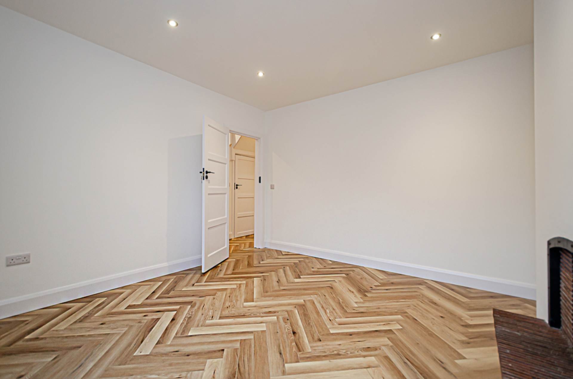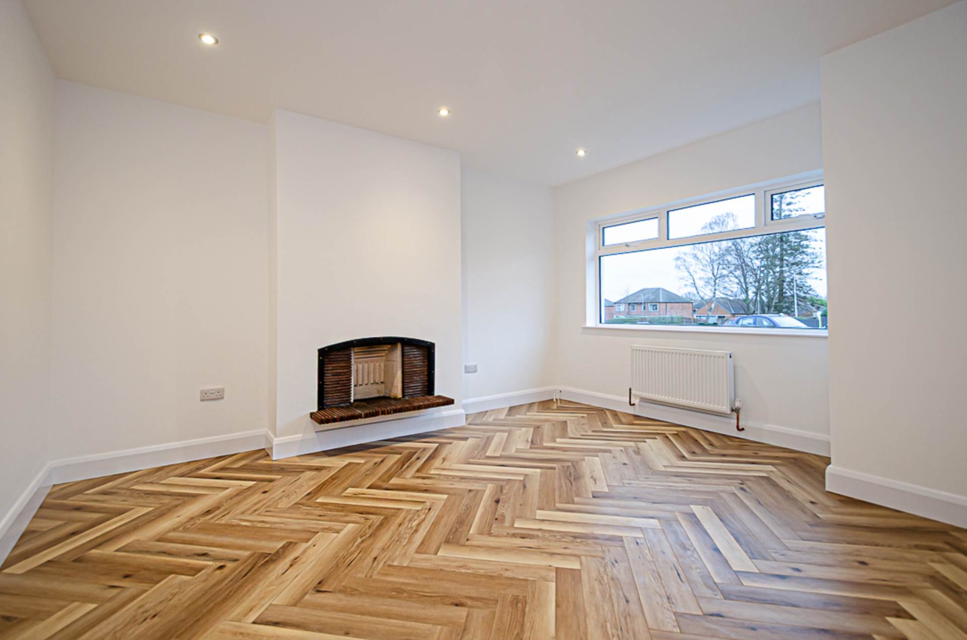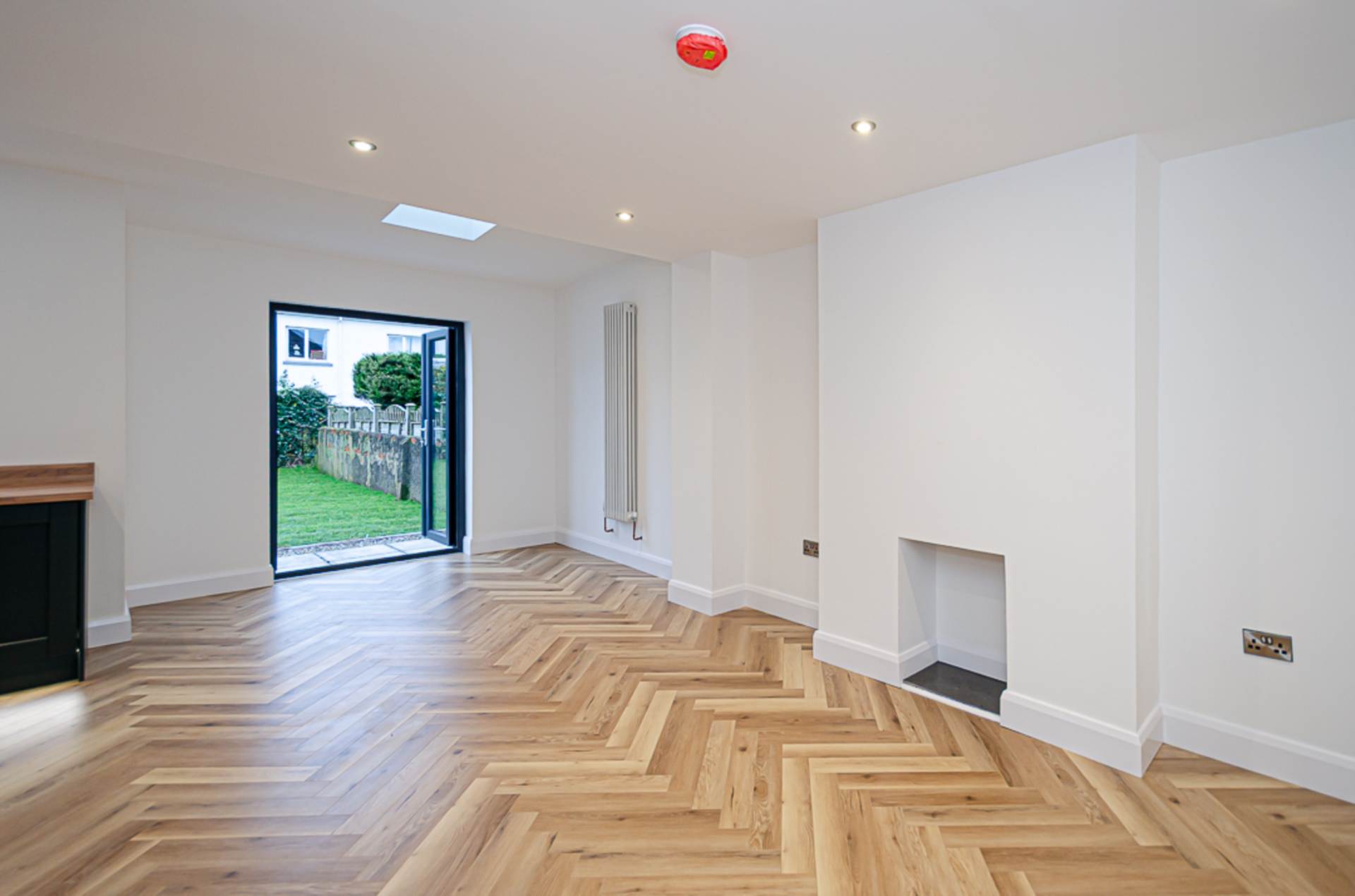 To the front of the property, the living room boasts a charming bay window and continues the elegant herringbone flooring, offering a warm and inviting space for relaxation.