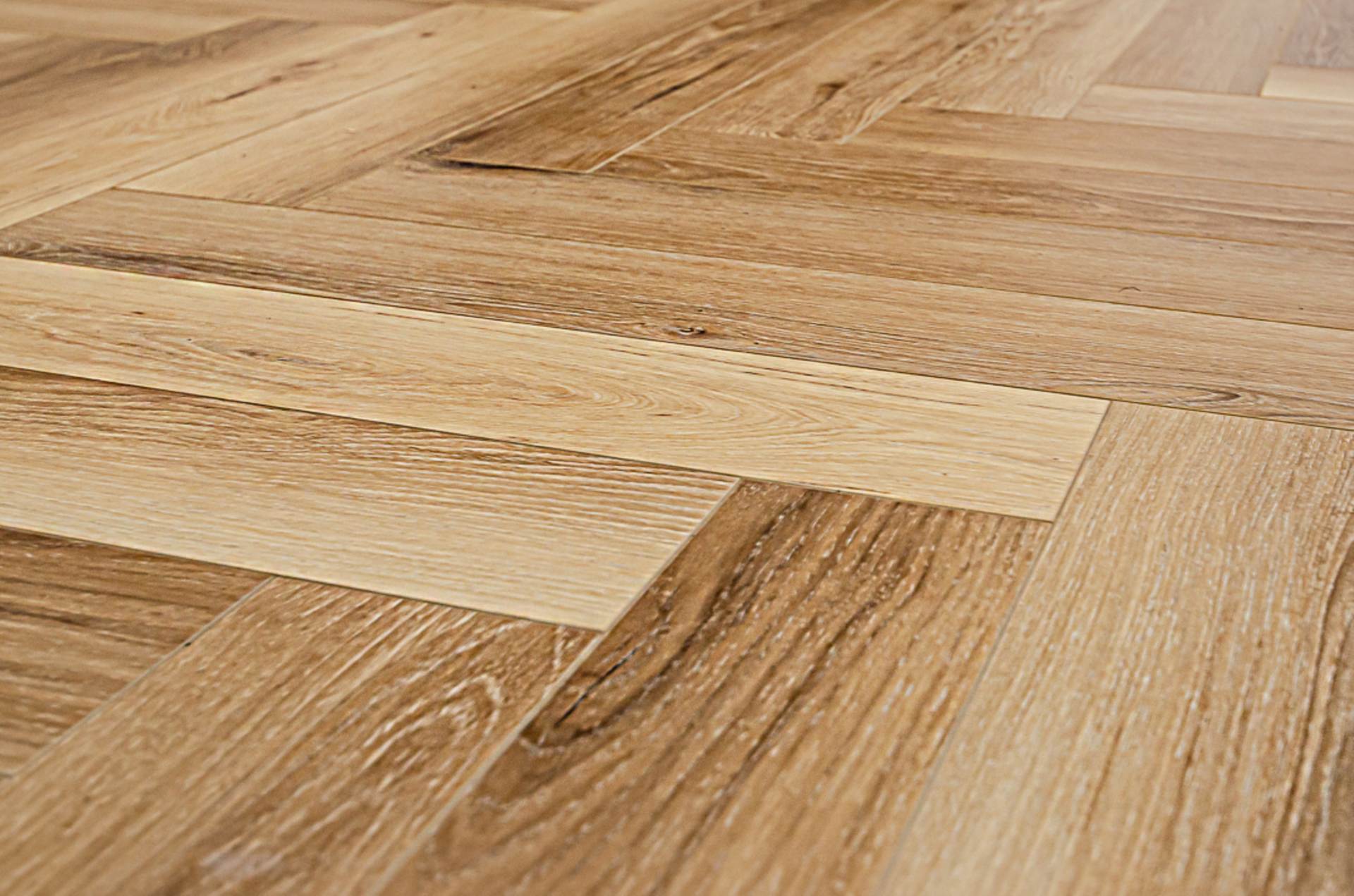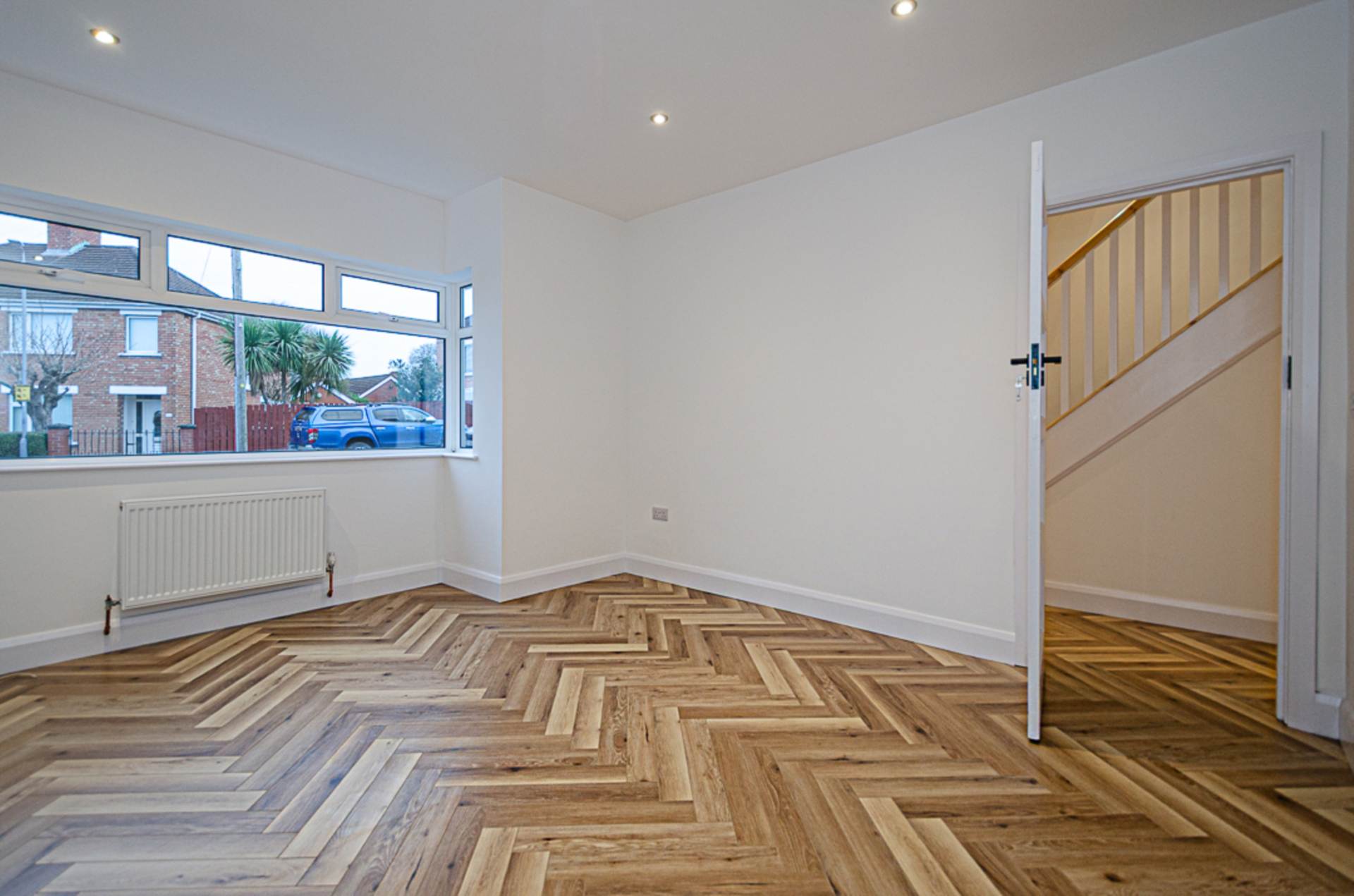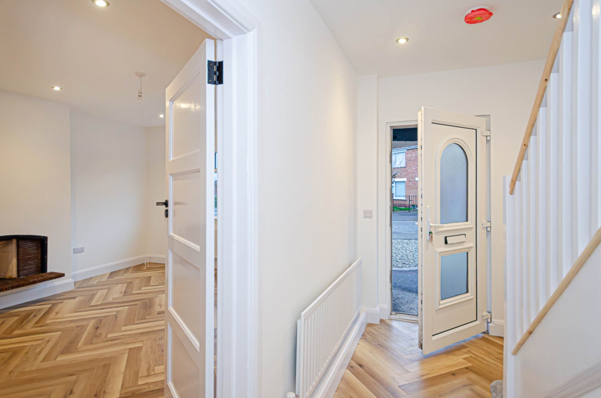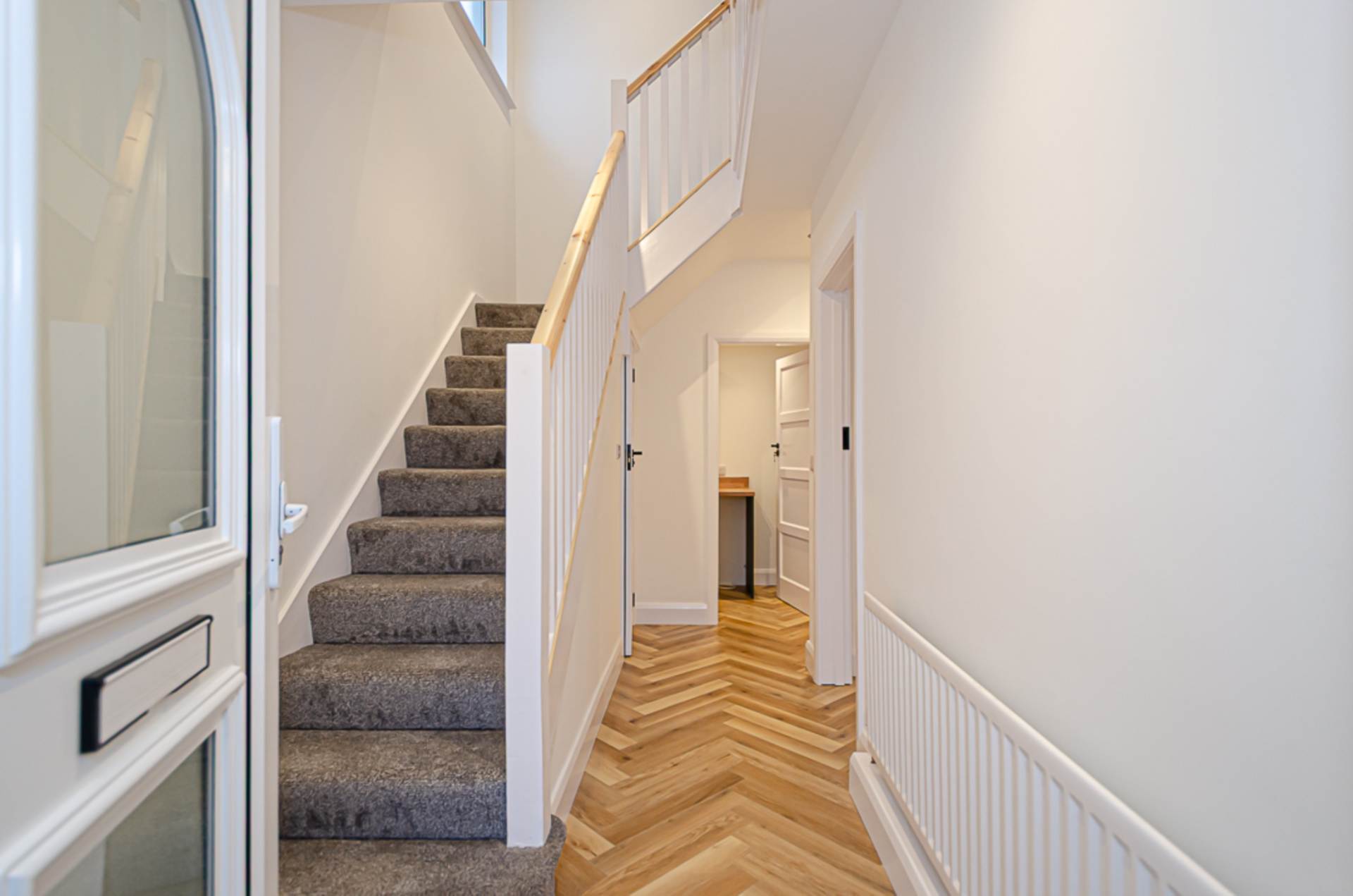 To the front of the property, the living room boasts a charming bay window and continues the elegant herringbone flooring, offering a warm and inviting space for relaxation.