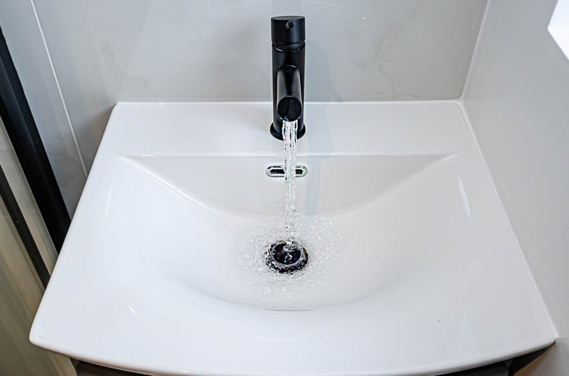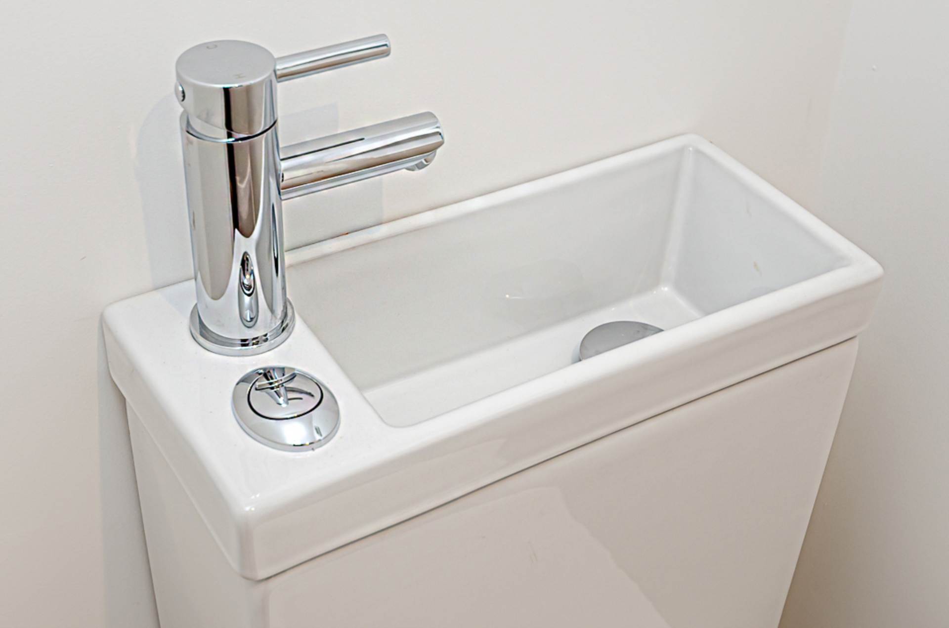 Downstairs W.C.Combined W.C. and wash hand basin, black electric towel rail radiator, extractor fan, and herringbone timber laminate floor