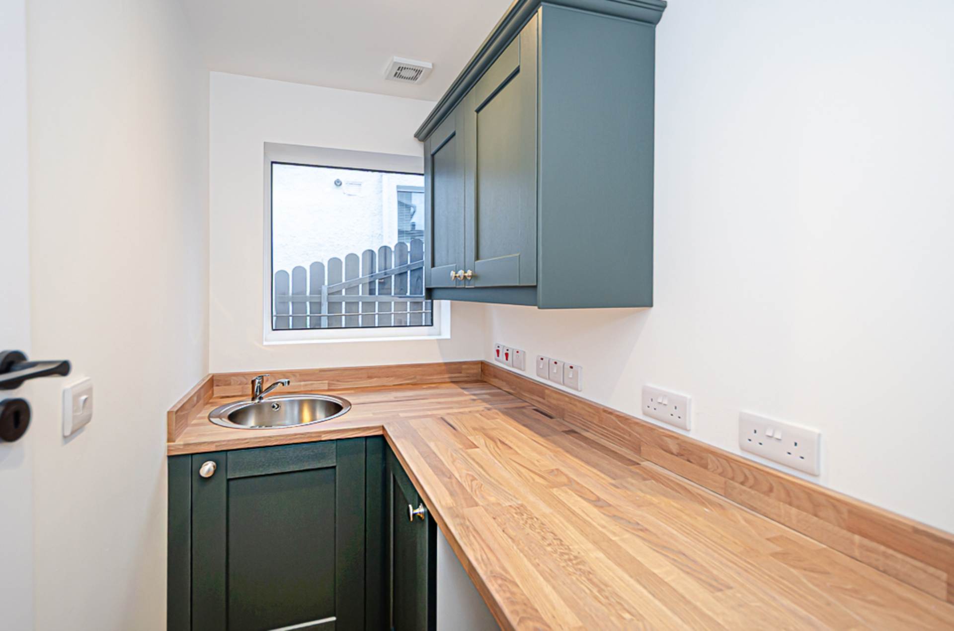 Utility area - 8'1" (2.46m) x 3'1" (0.94m)Range of high and low level units matching kitchen, stainless steel circular sink, recessed spotlights, extractor fan and plumbing for washing machine