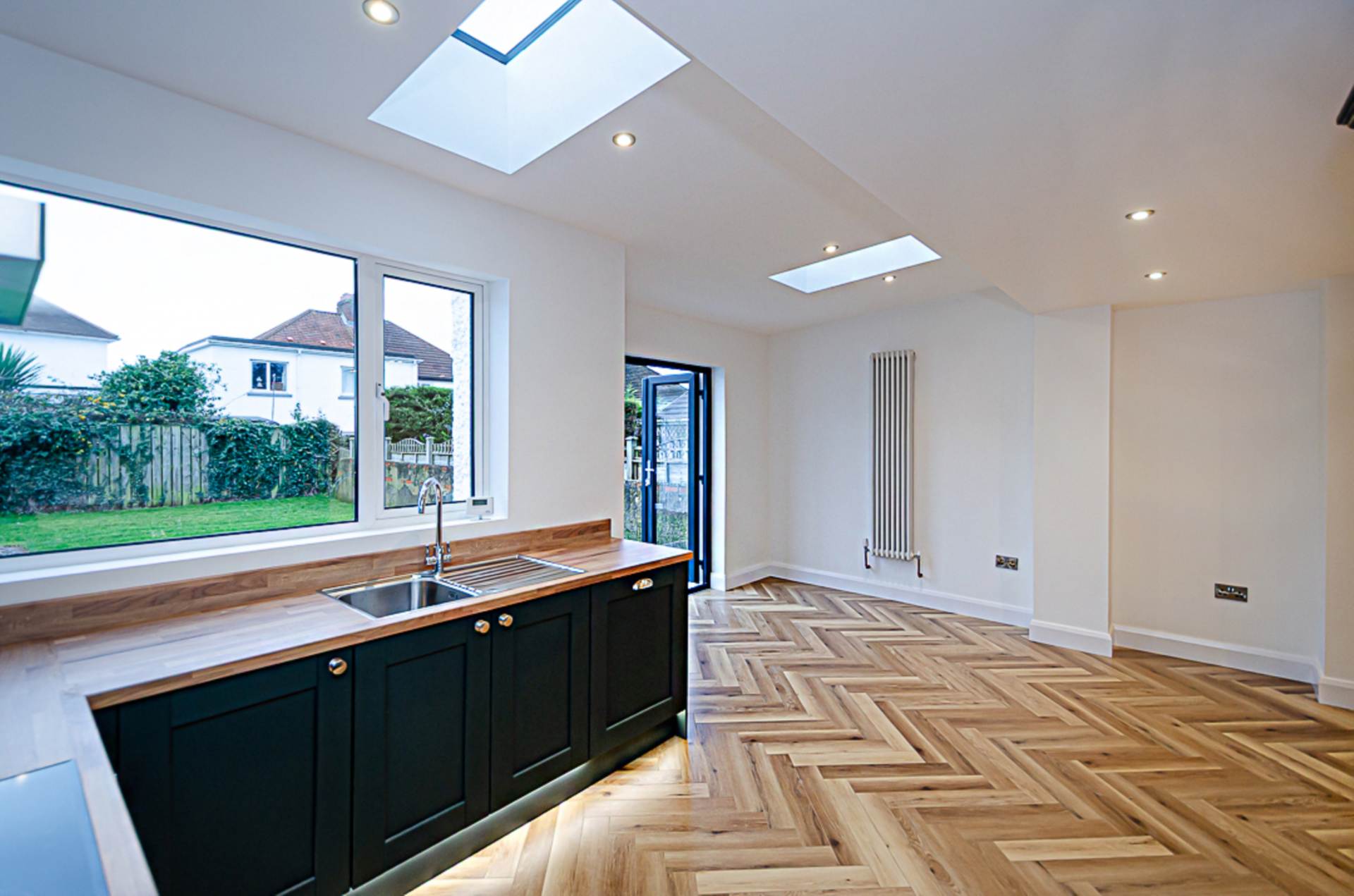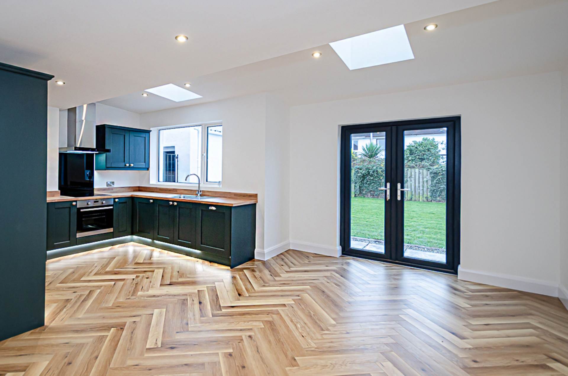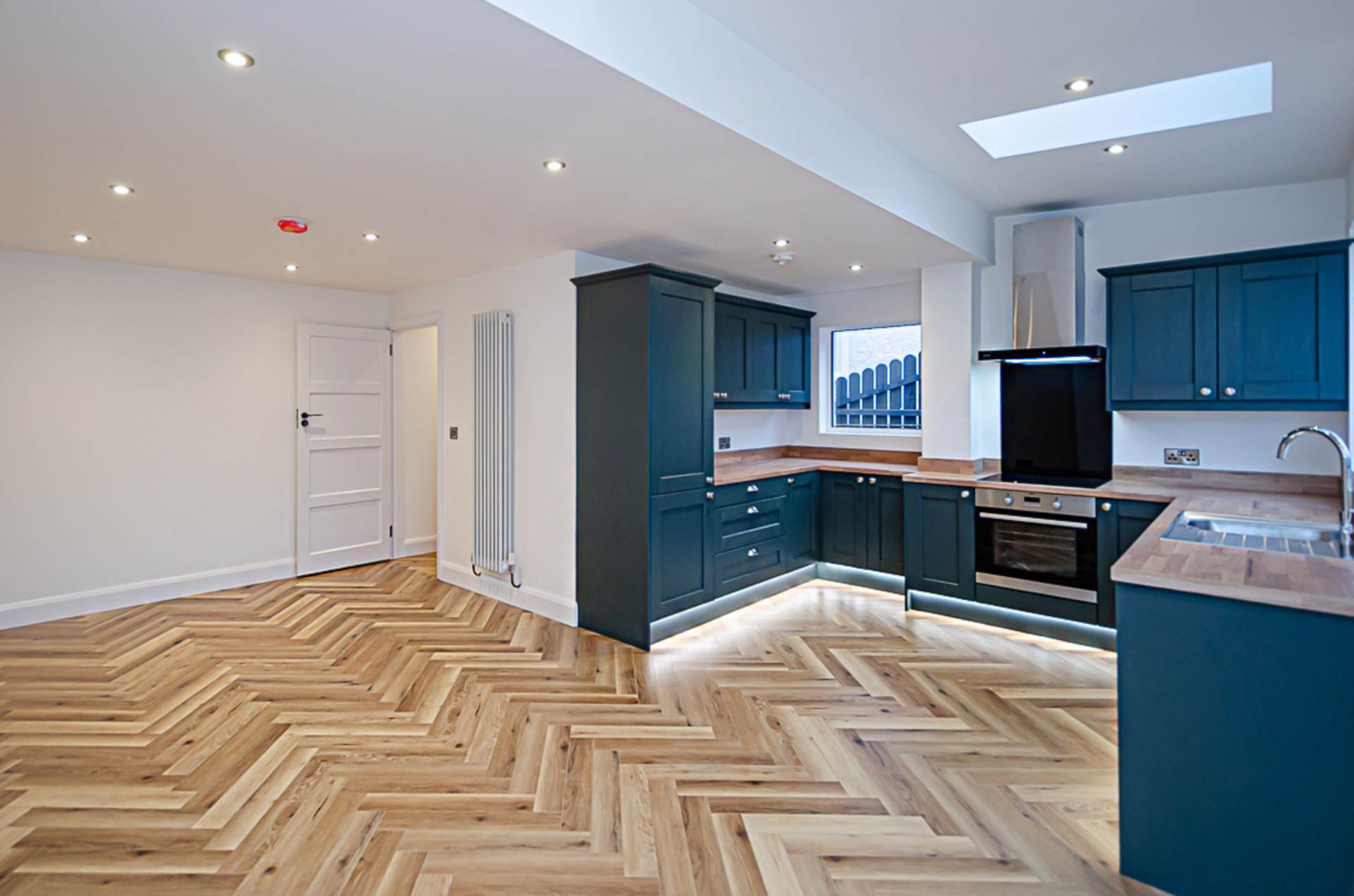 Open plan kitchen/dining room - 21'5" (6.53m) x 18'7" (5.66m)Newly fitted kitchen in olive green finish with range of high and low level units, integrated oven, ceramic hob with black glass splash back, black and silver extractor canopy, integrated fridge freezer, integrated dishwasher, herringbone timber laminate floor, recessed spotlights, kickboard lighting, and two roof lights.
