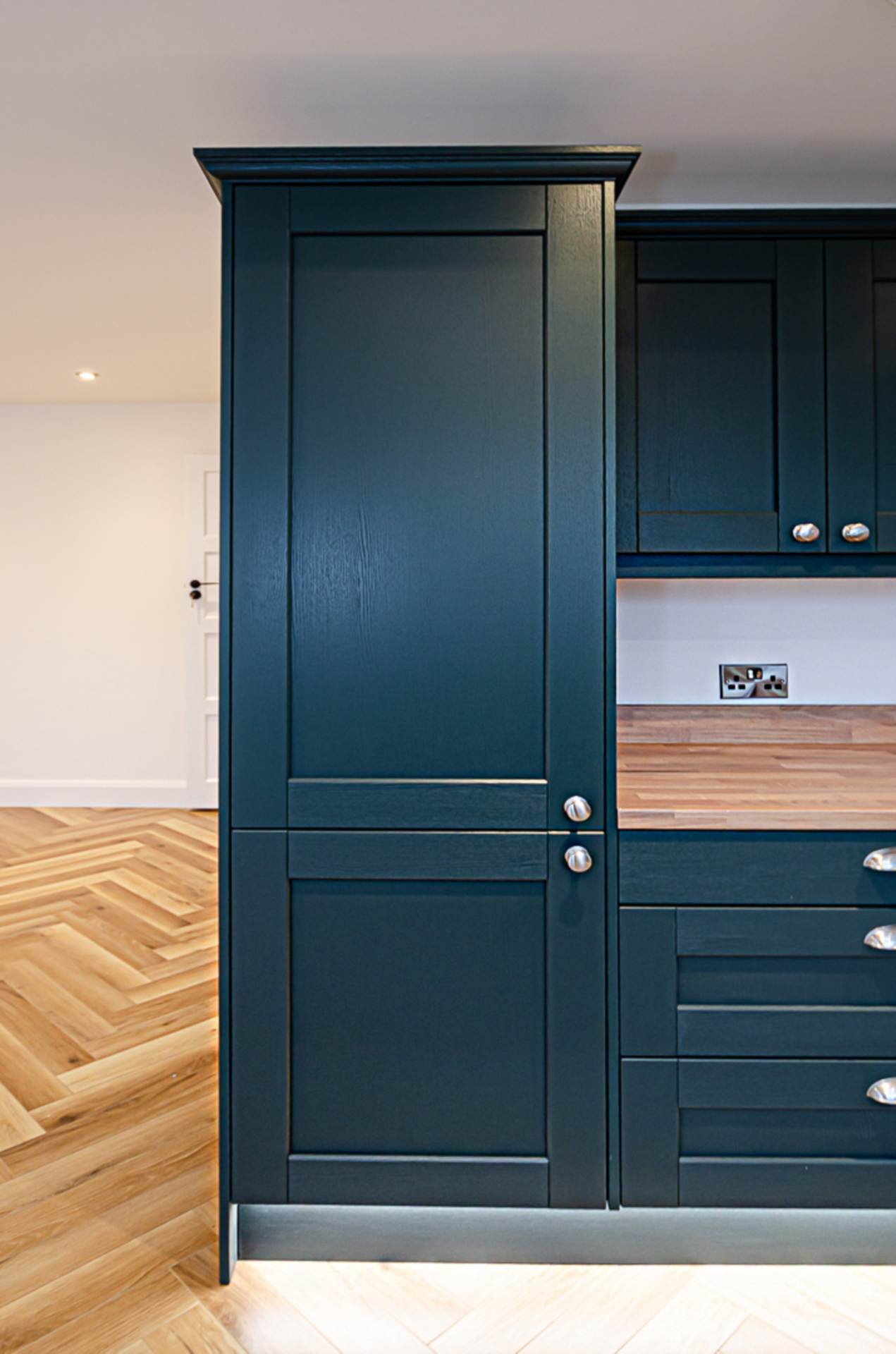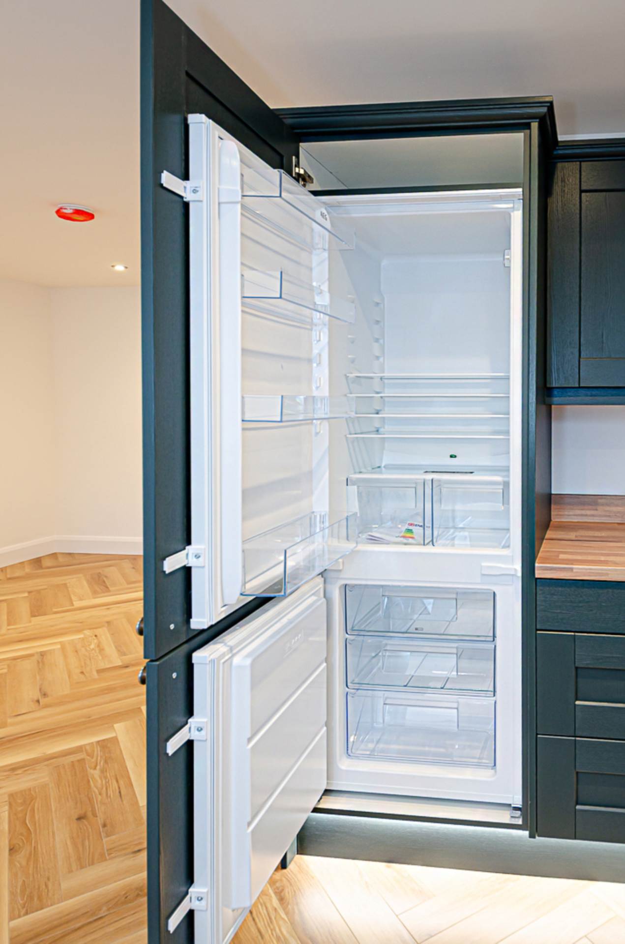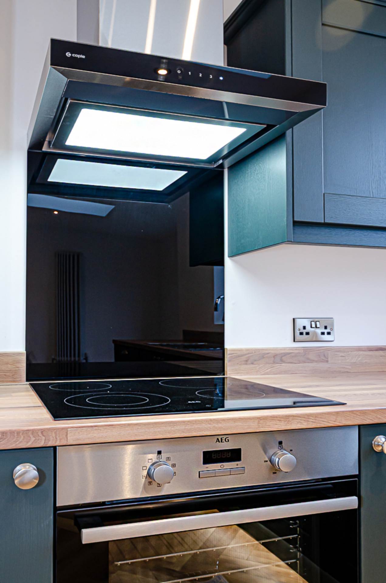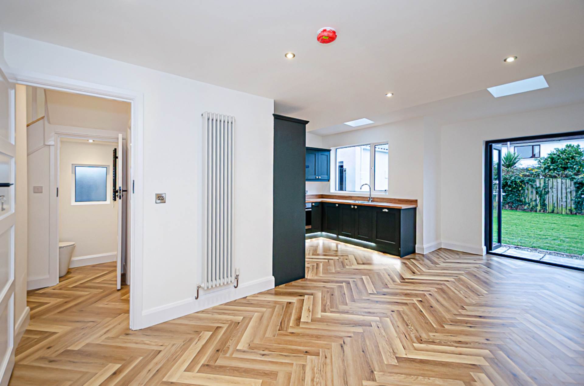 Open plan kitchen/dining room - 21'5" (6.53m) x 18'7" (5.66m)Newly fitted kitchen in olive green finish with range of high and low level units, integrated oven, ceramic hob with black glass splash back, black and silver extractor canopy, integrated fridge freezer, integrated dishwasher, herringbone timber laminate floor, recessed spotlights, kickboard lighting, and two roof lights.