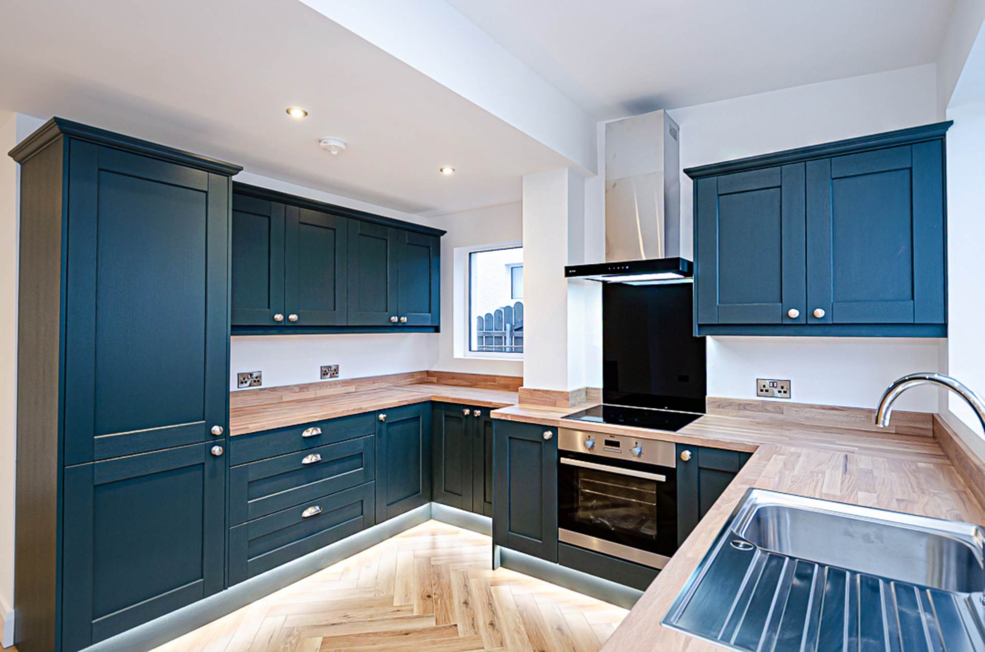 The accommodation begins with a welcoming entrance hall incorporating a convenient downstairs W.C. The heart of the home is the stunning newly fitted kitchen, finished in an on-trend olive green and featuring a comprehensive range of high- and low-level units. Integrated appliances include an oven, ceramic hob with sleek black glass splashback, black and silver extractor canopy, fridge freezer and dishwasher. The space is further enhanced by herringbone timber-effect laminate flooring, recessed spotlights, ambient kickboard lighting and two roof lights, flooding the room with natural light. A separate utility room provides additional practicality and storage.