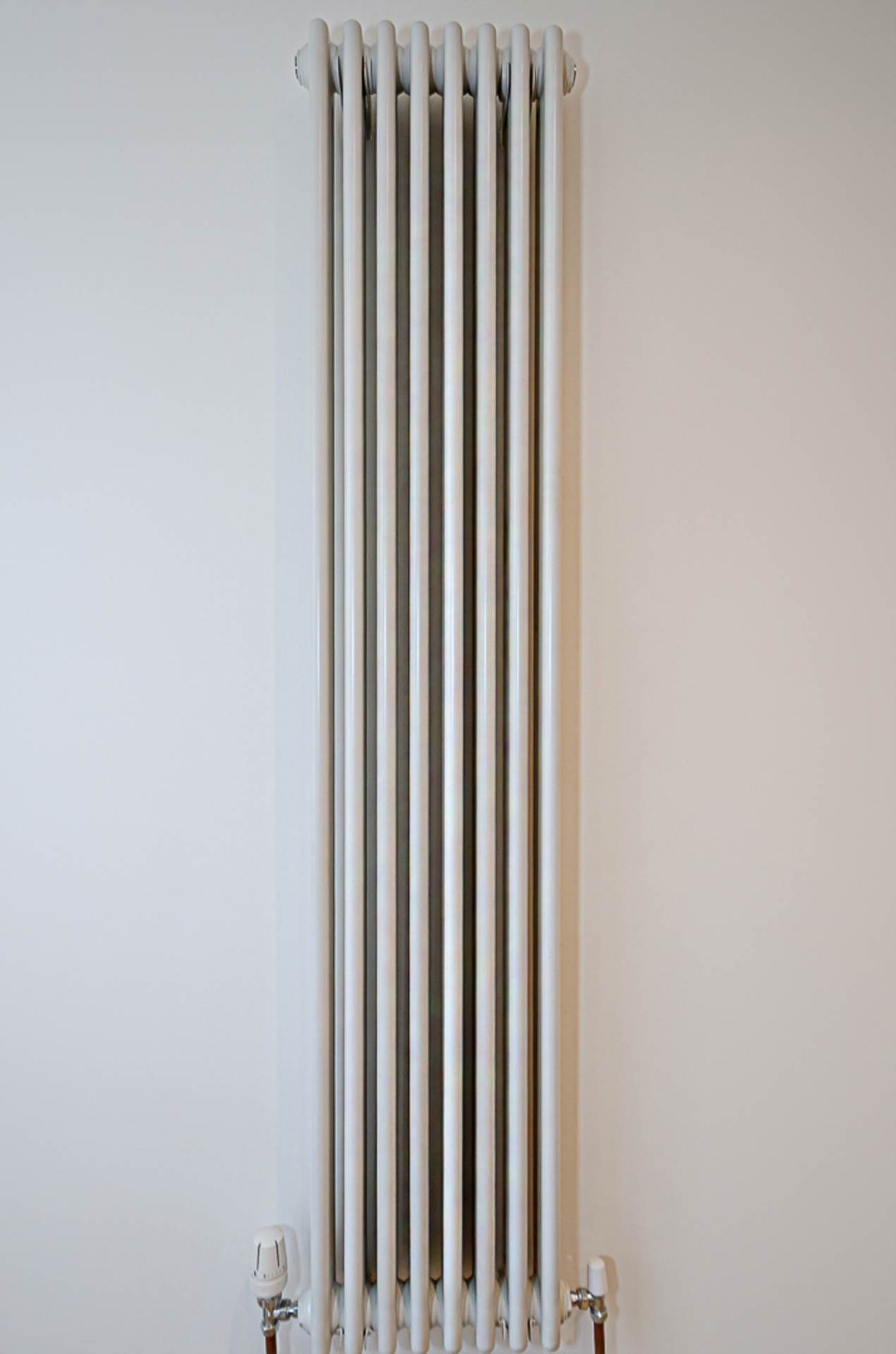 Dining area with hole in the wall fireplace, vertical radiators and brushed steel electrical fittings