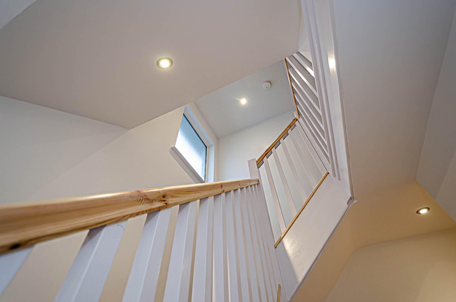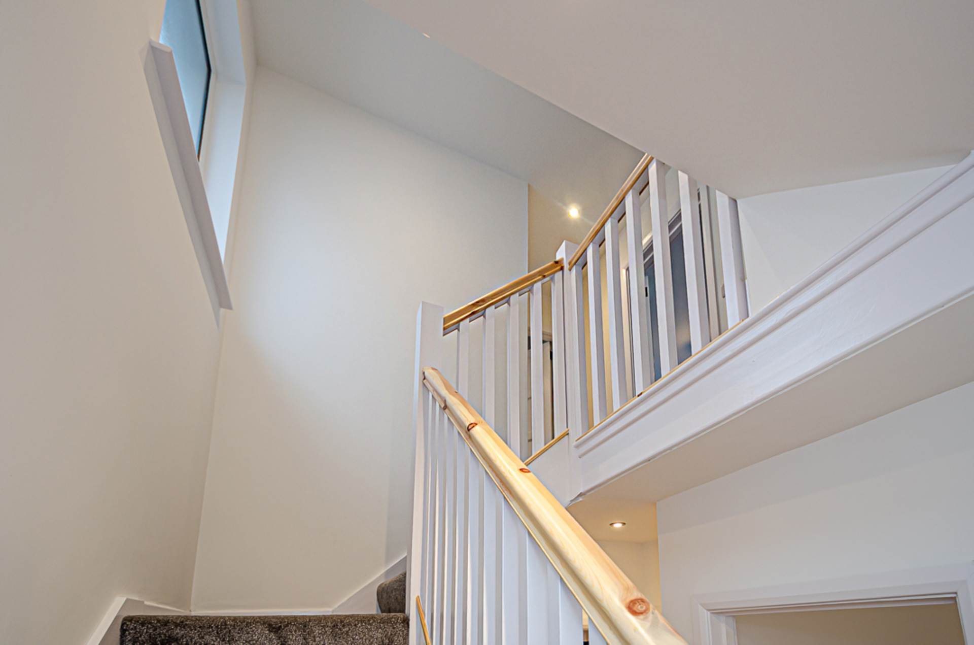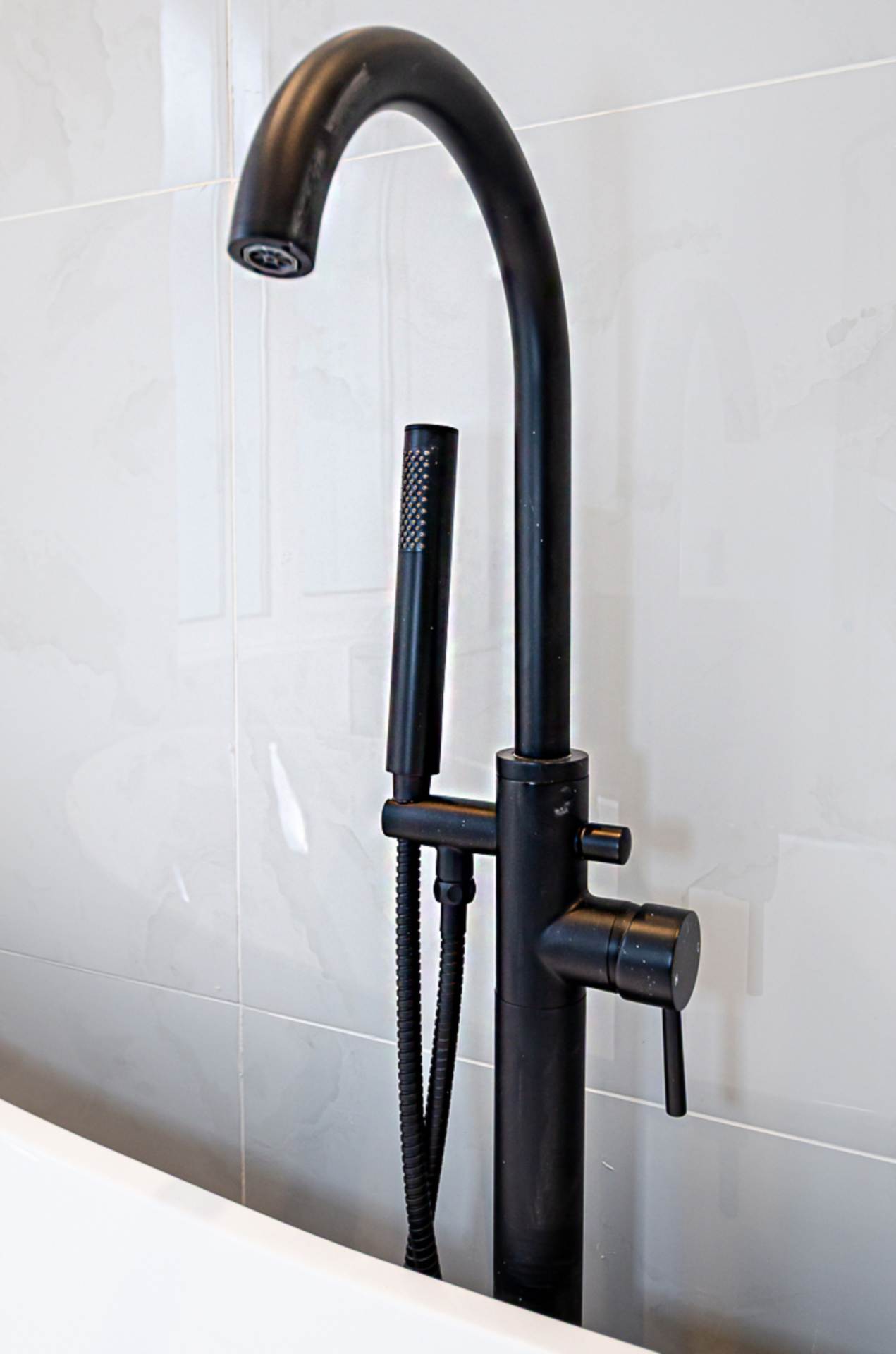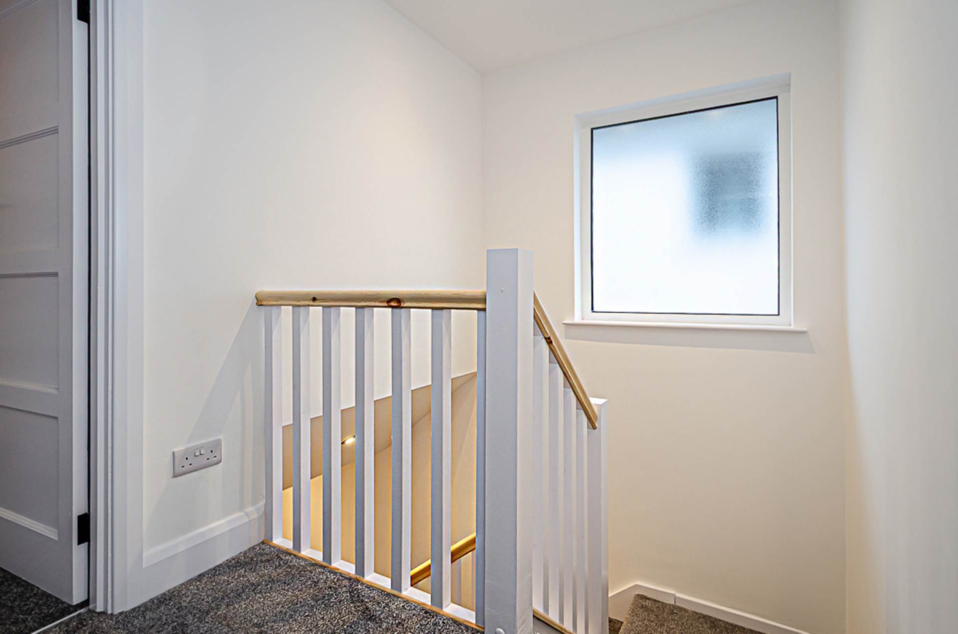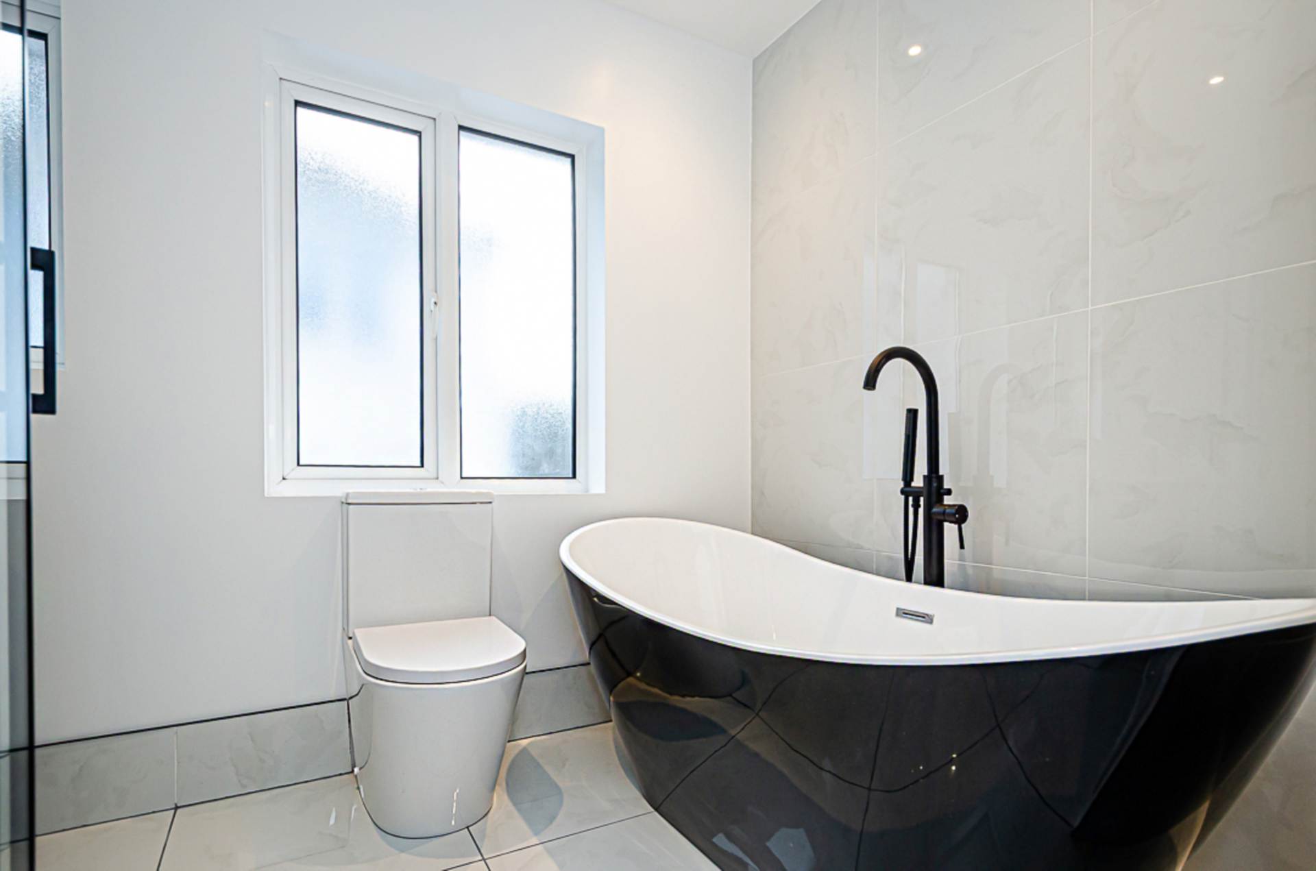 Upstairs, there are three generously proportioned bedrooms, all well presented and versatile for family living or home working. The luxurious four-piece bathroom is finished with a striking modern aesthetic, featuring a black freestanding bath with chrome fittings and a statement black freestanding tap, a wash hand basin set within a two-drawer vanity unit with black tap, W.C., and a corner shower cubicle with black tray and thermostatic shower with dual shower heads. The bathroom is fully tiled to walls and floor with matching upstands, and further benefits from recessed spotlights, extractor fan, a contemporary black towel-rail radiator, and a neatly concealed gas boiler.