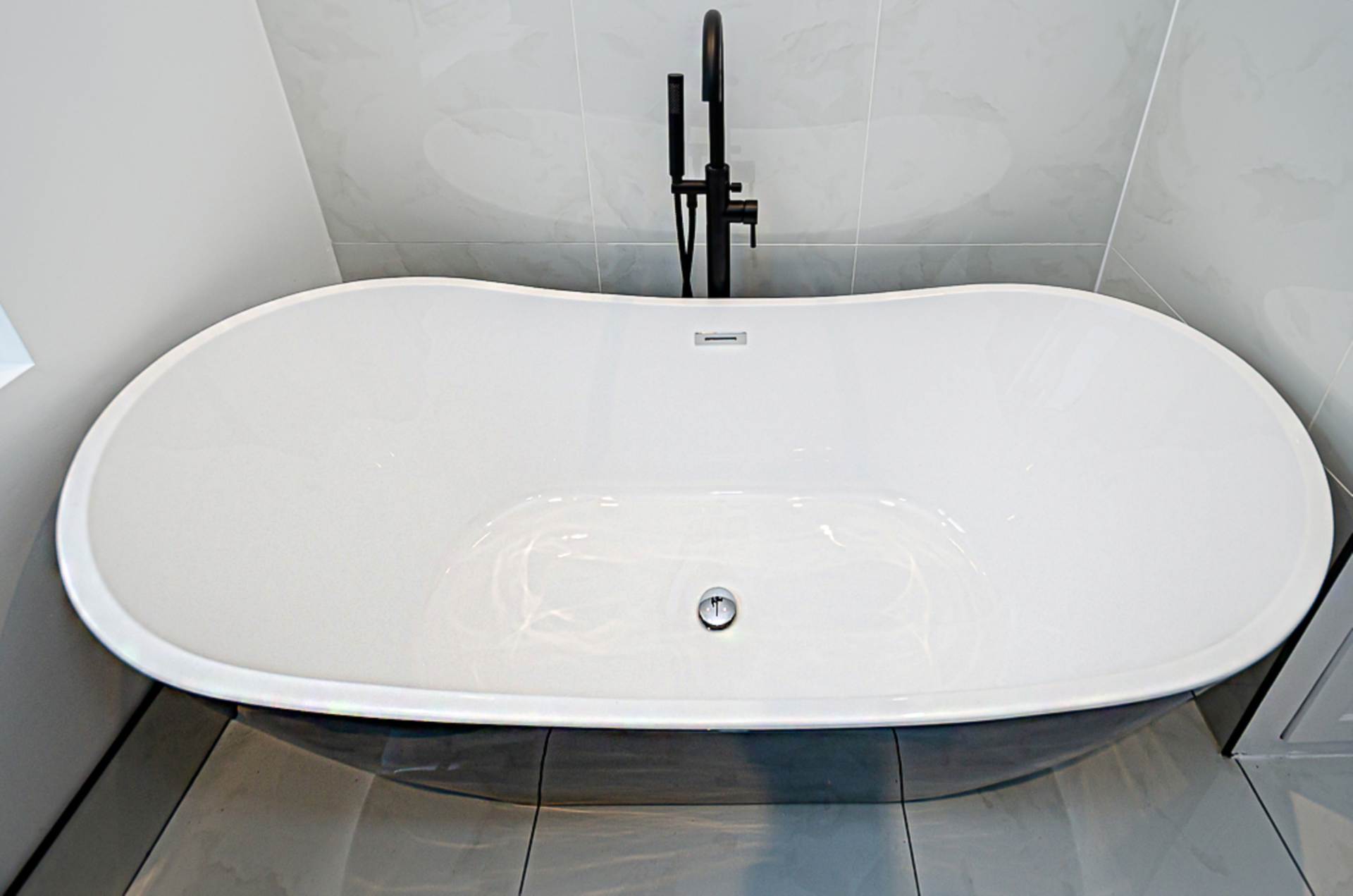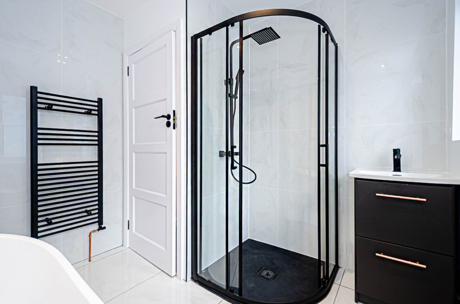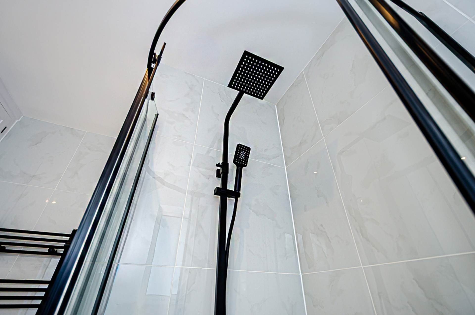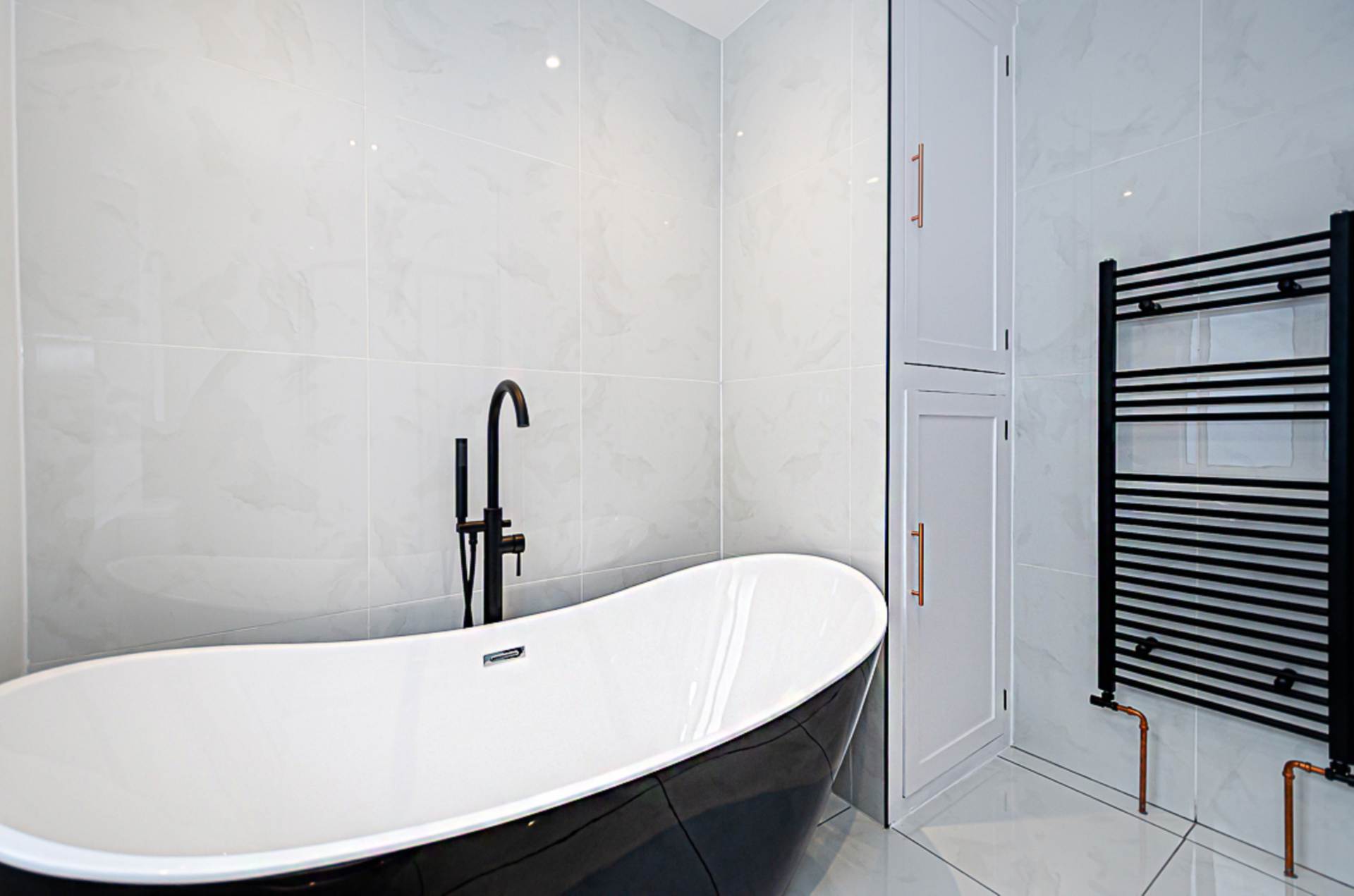 Bathroom - 8'8" (2.64m) x 8'2" (2.49m)Luxury four piece bathroom - black freestanding bath with chrome fitting and black freestanding tap, wash hand basin two drawer vanity unit with black tap, W.C., corner shower cubicle with black shower tray and black thermostatic shower, dual shower heads, modern fully tiled walls, floor and upstand, black towel rail radiator, recessed spotlights, extractor fan, and gas boiler in cupboard