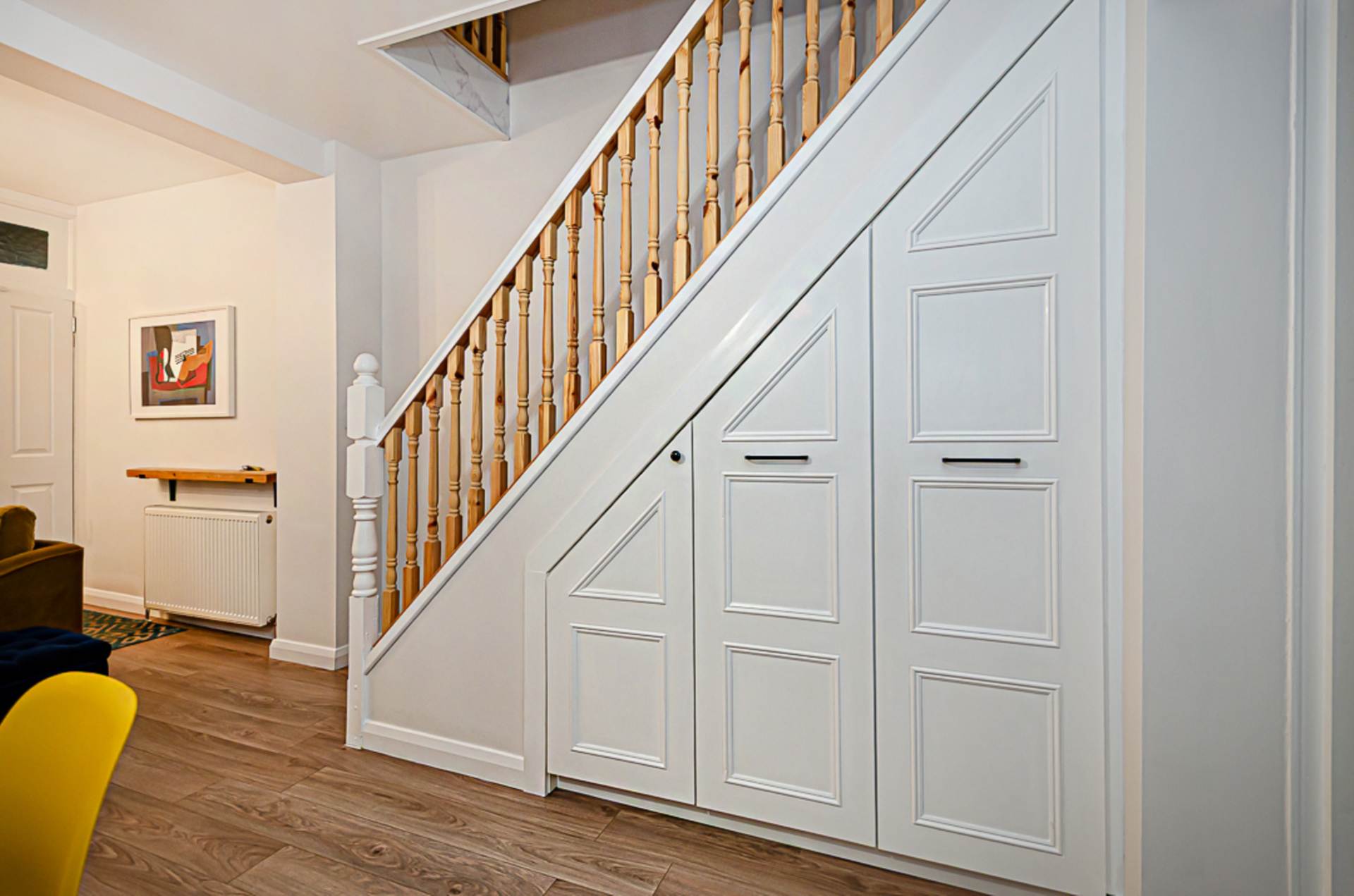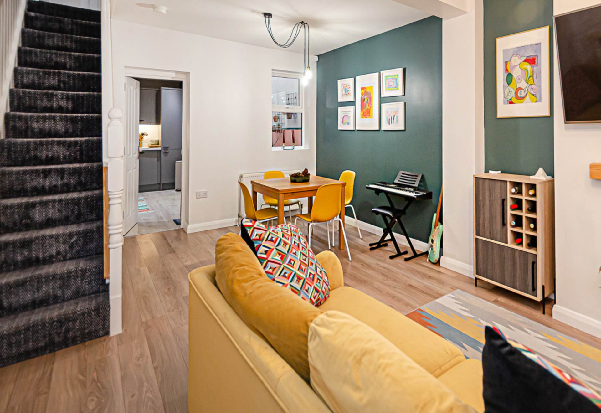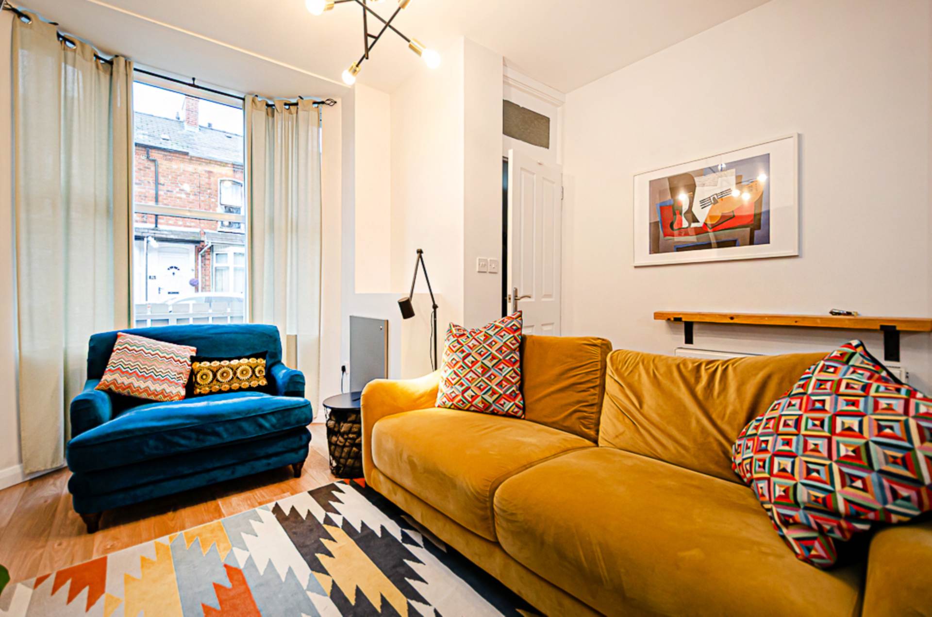 - Open plan living area with bay window and bespoke storage