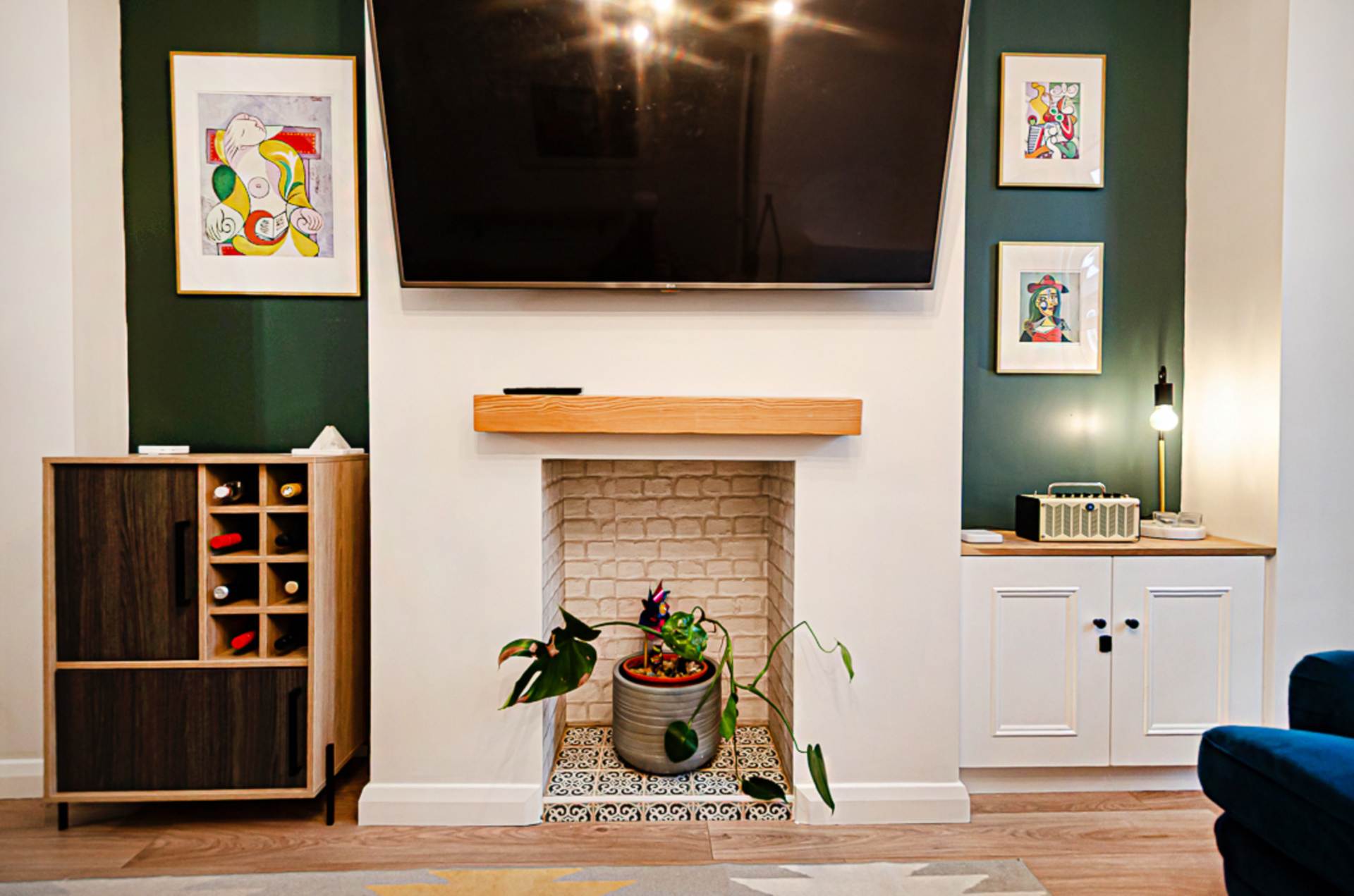 Through lounge - 24'1" (7.34m) x 12'6" (3.81m)Hole-in-the-wall fireplace with tiled hearth and timber mantle, bespoke storage under stairs, bay window, timber laminate floor and antique style lighting