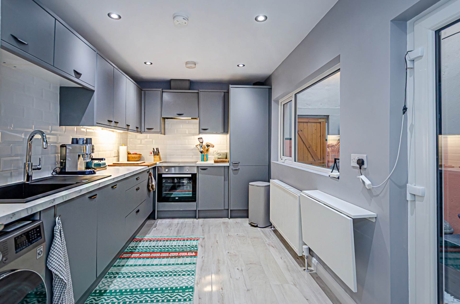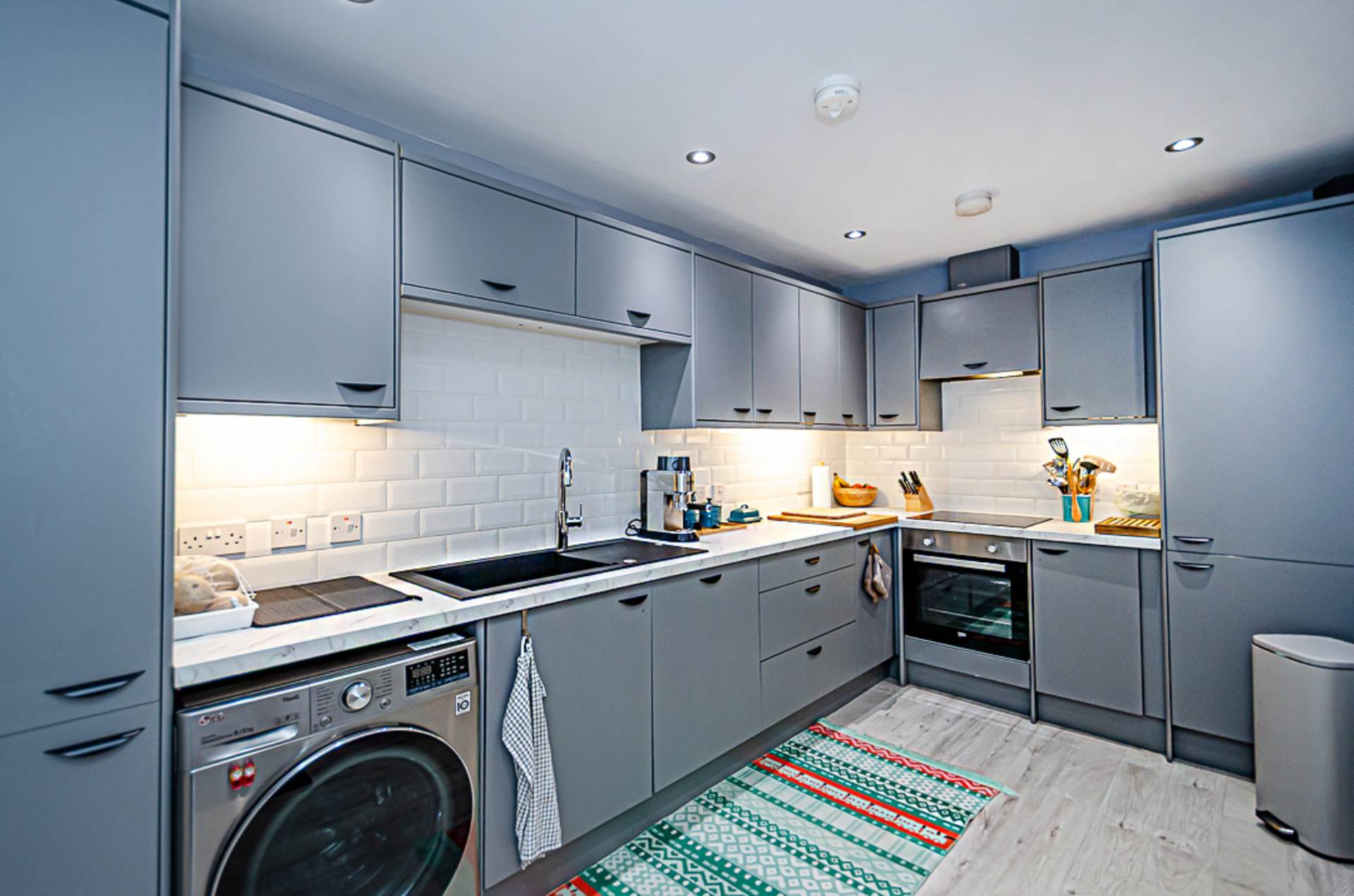 Kitchen - 13'11" (4.24m) x 7'10" (2.39m)Range of high and low level fitted units in grey finish, stainless steel oven, ceramic hob, concealed extractor canopy, black sink with with chrome tap, integrated fridge freezer, integrated dishwasher, part tiled walls, timber laminate floor, down lighters, recessed spotlights, fold down breakfast table, and gas boiler in cupboard