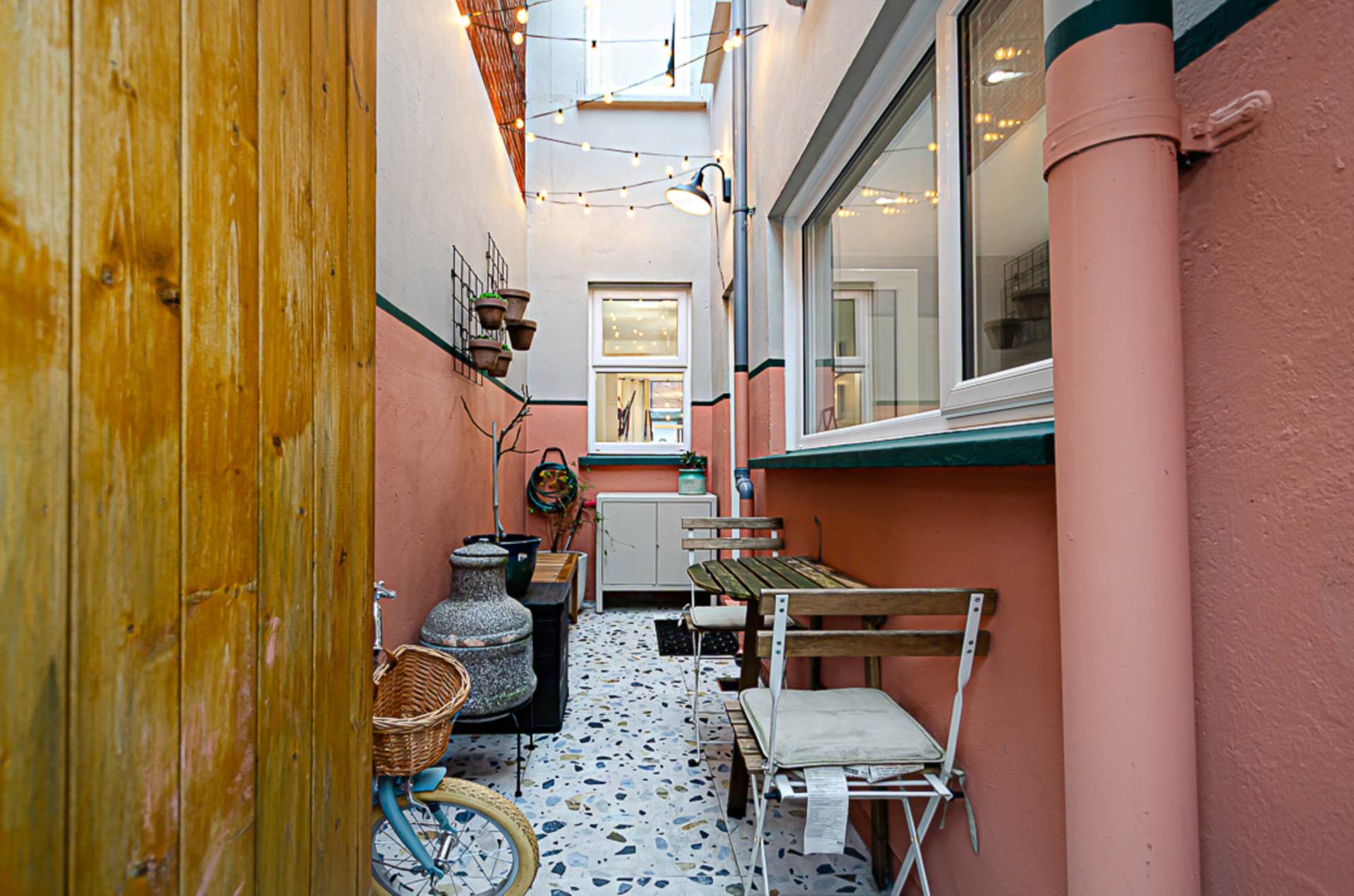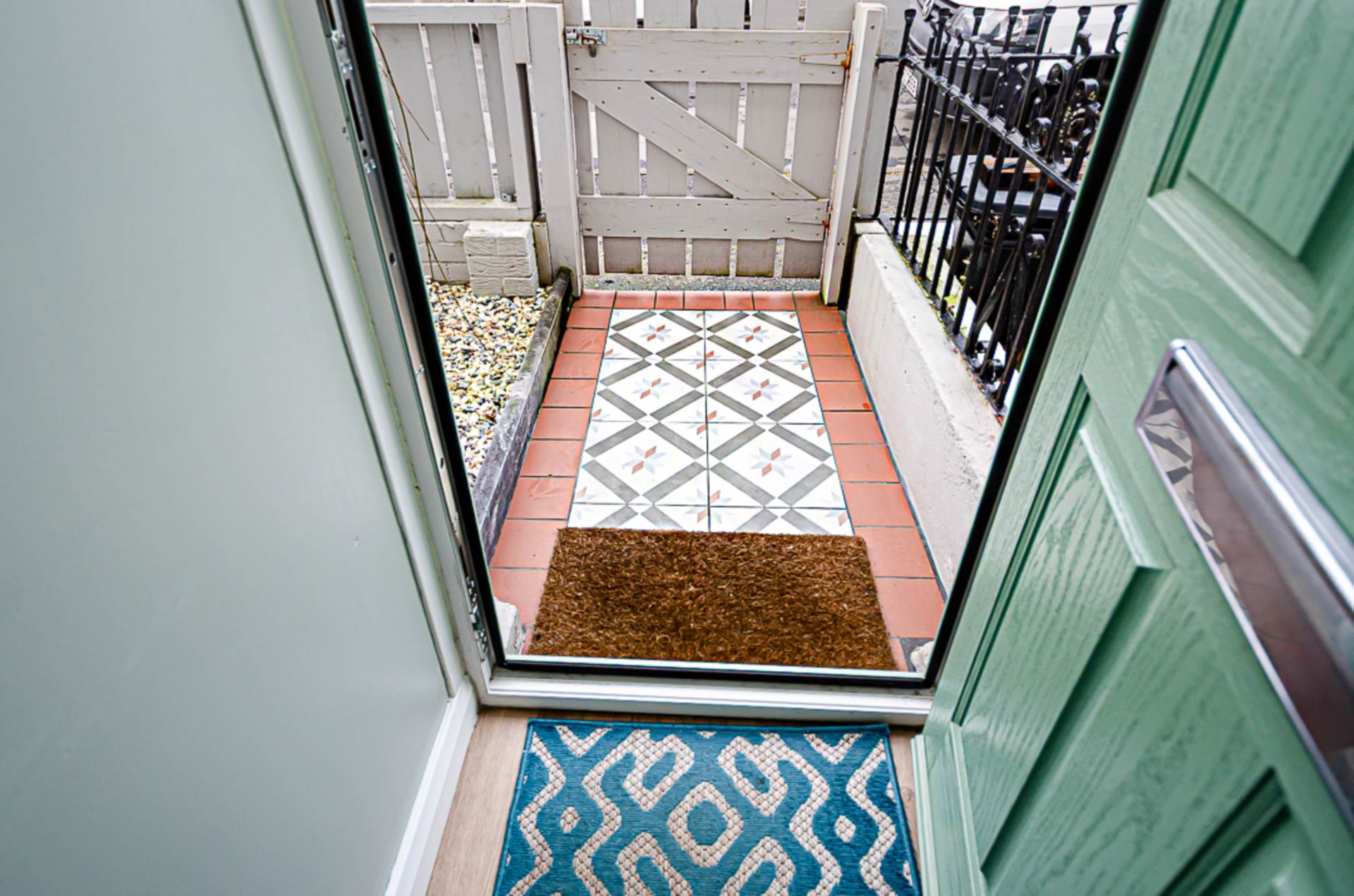 OutsideForecourt in small stones and path. Rear in yard in Terrazzo style tiling