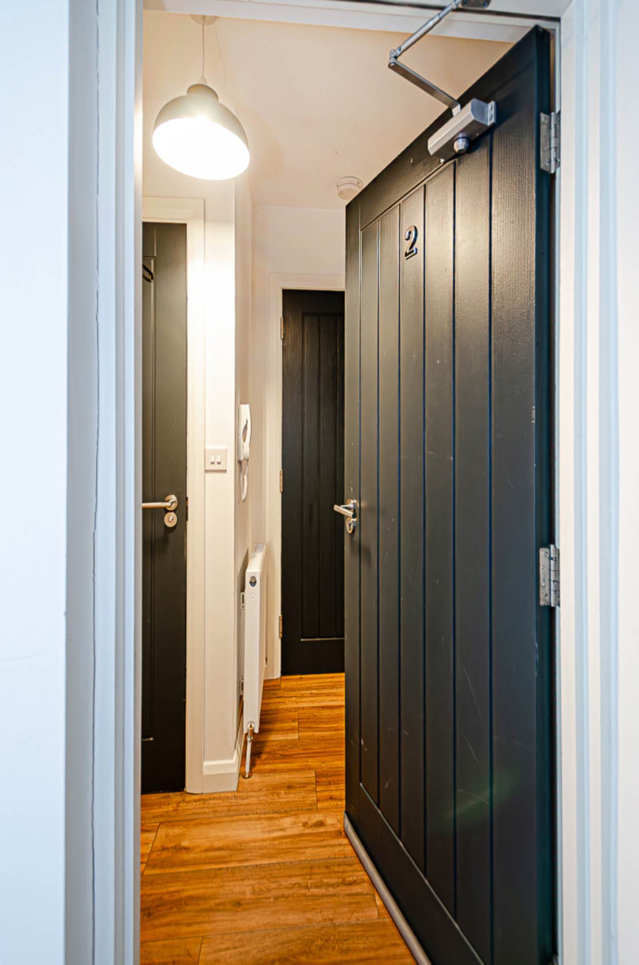 Entrance hallTimber laminate floor and intercom for entry system, large storage cupboard