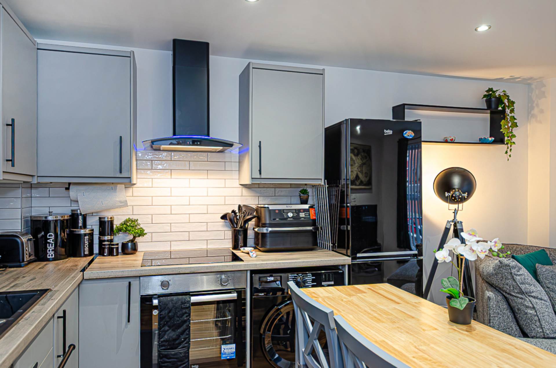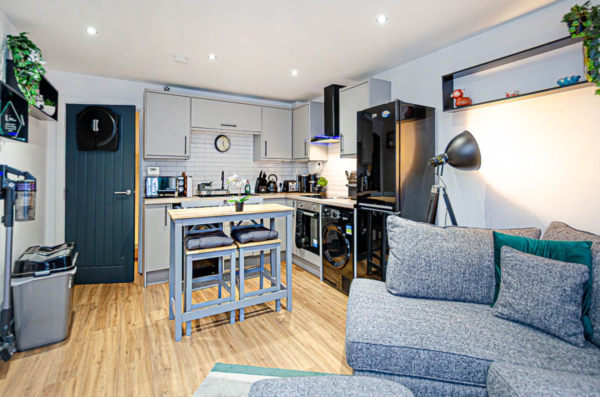 Open plan living kitchen - 18'3" (5.56m) x 13'1" (3.99m)Kitchen areaRange of high and level units, stainless oven, ceramic hob, black and glass extractor canopy with blue lighting, black sink & tap, part tiled walls, timber laminate floor, plumbing for washing machine, recess for tumble dryer and recessed spotlights