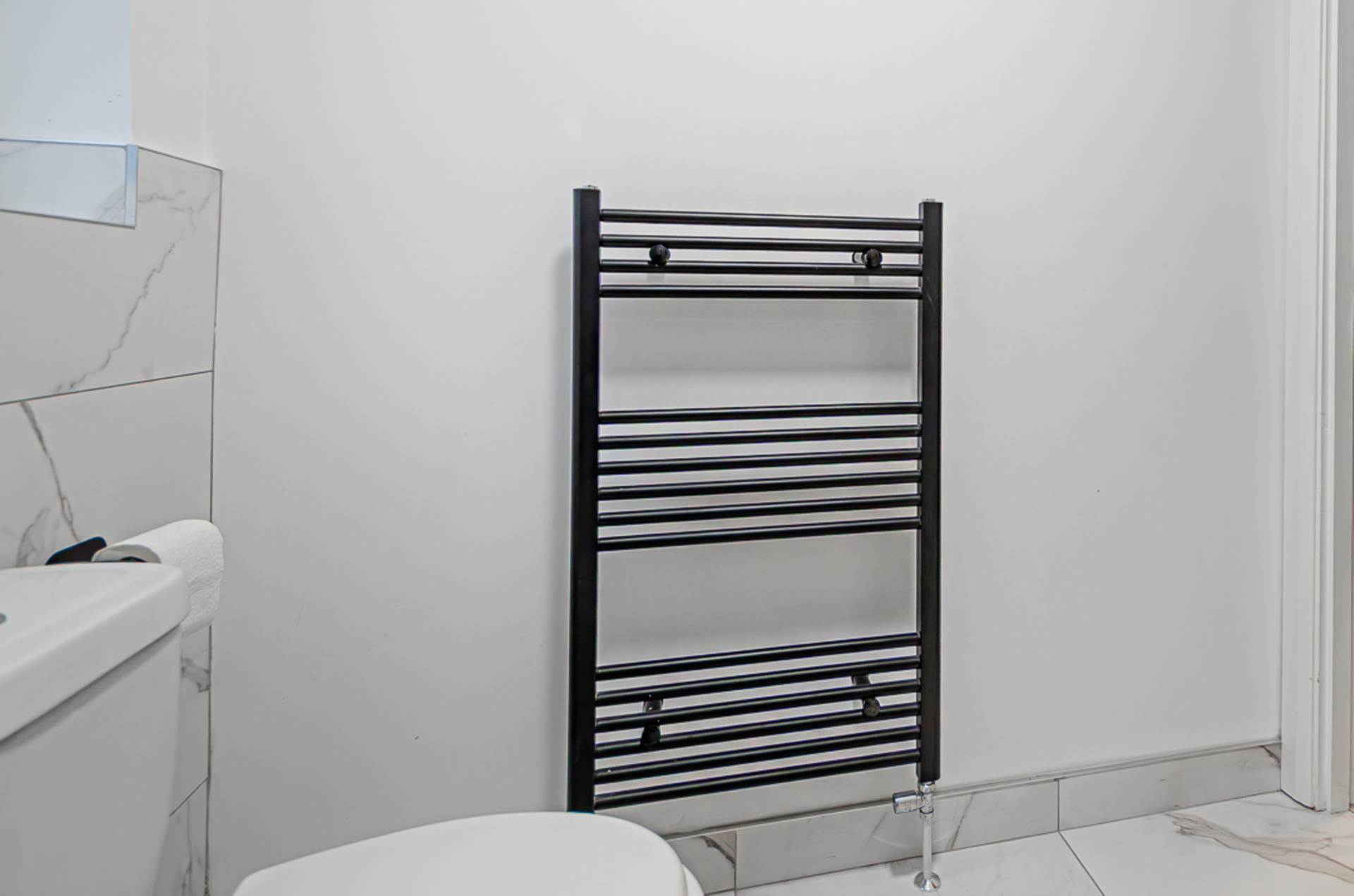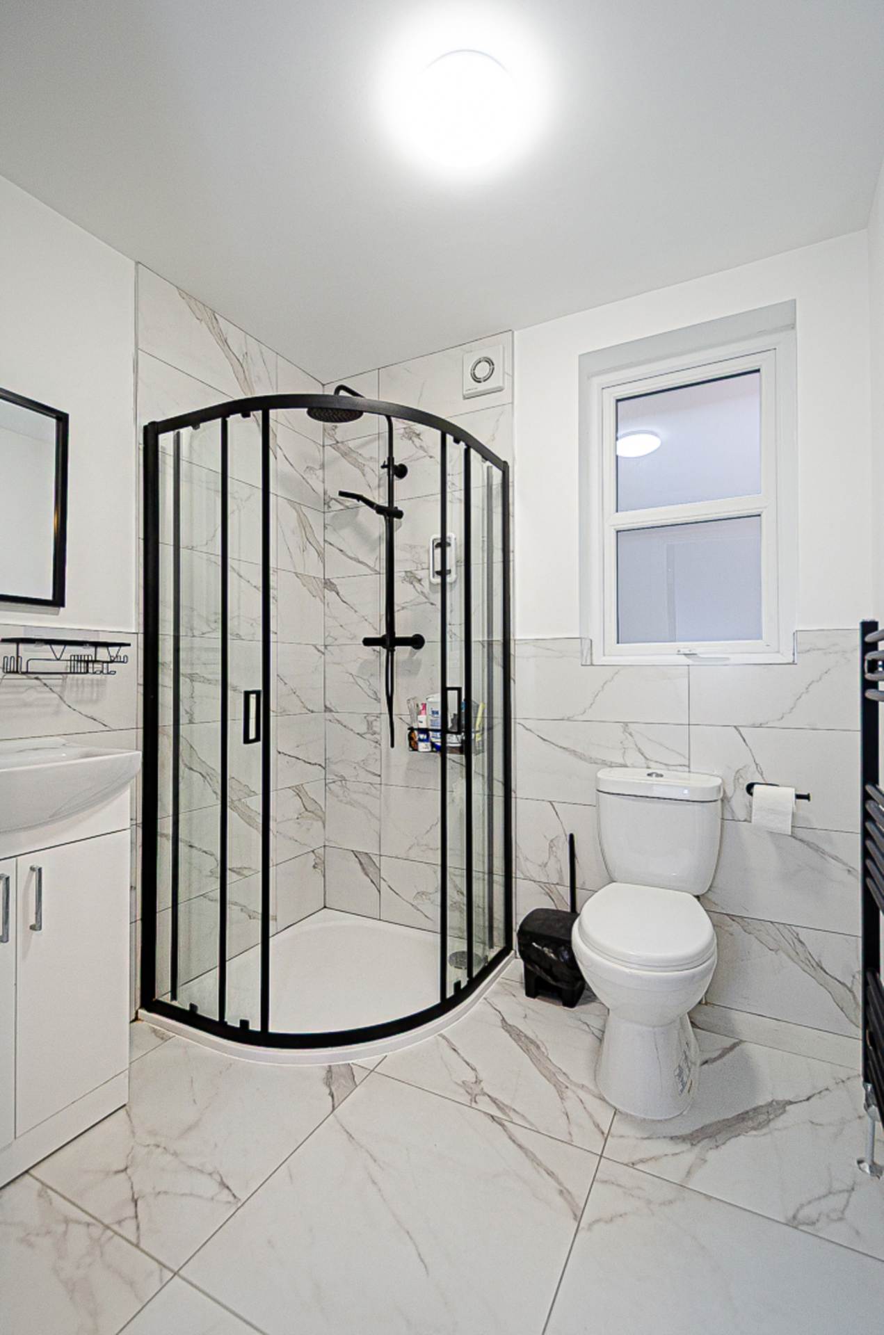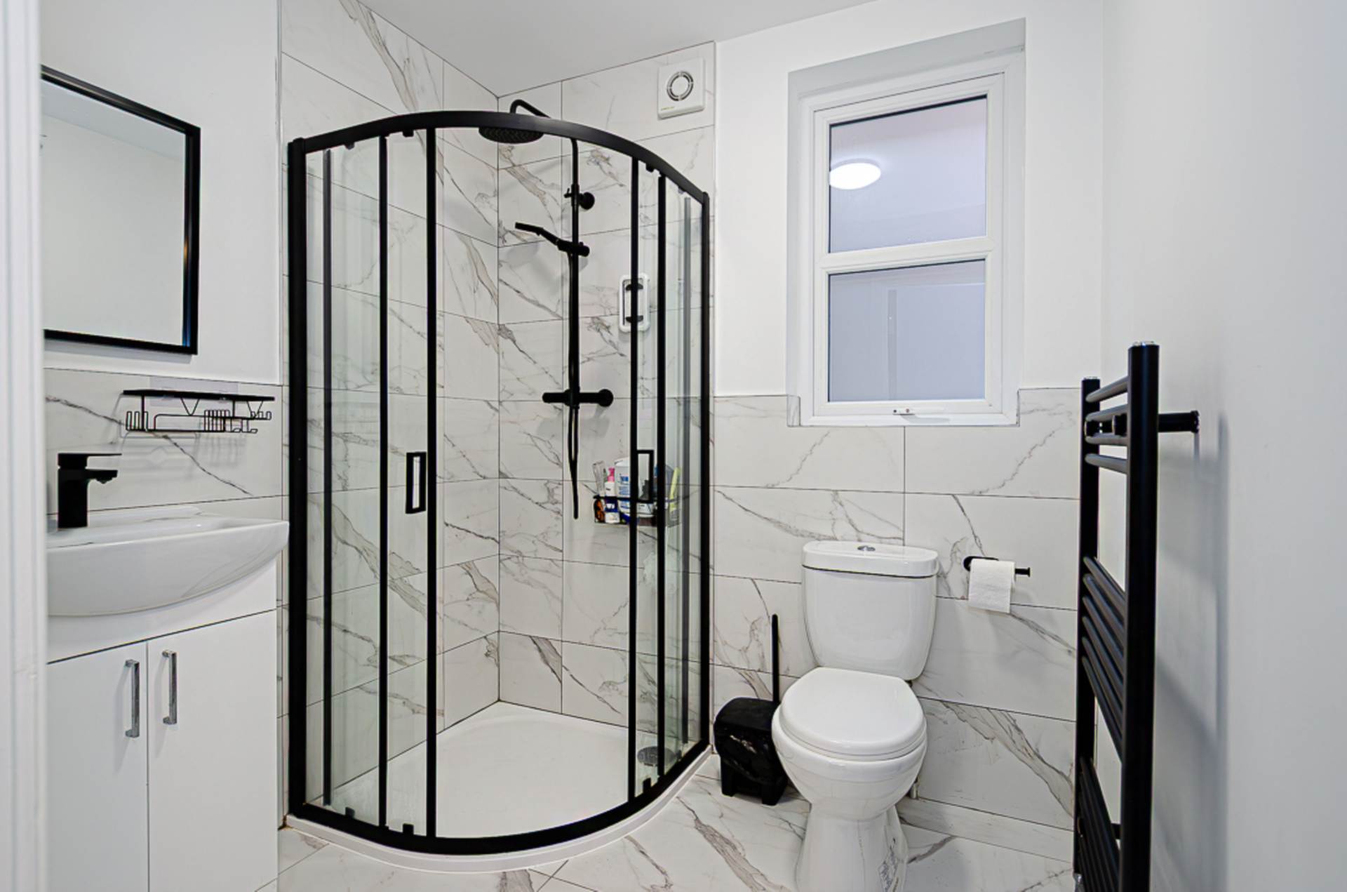 Shower room - 6'6" (1.98m) x 6'2" (1.88m)Corner shower cubicle with black thermostatic shower, dual shower heads, and sliding doors, wash hand basin in white vanity unit with black mixer tap, W.C., marble effect part tiled walls, marble effect ceramic tiled floor, black towel rail radiator, and extractor fan