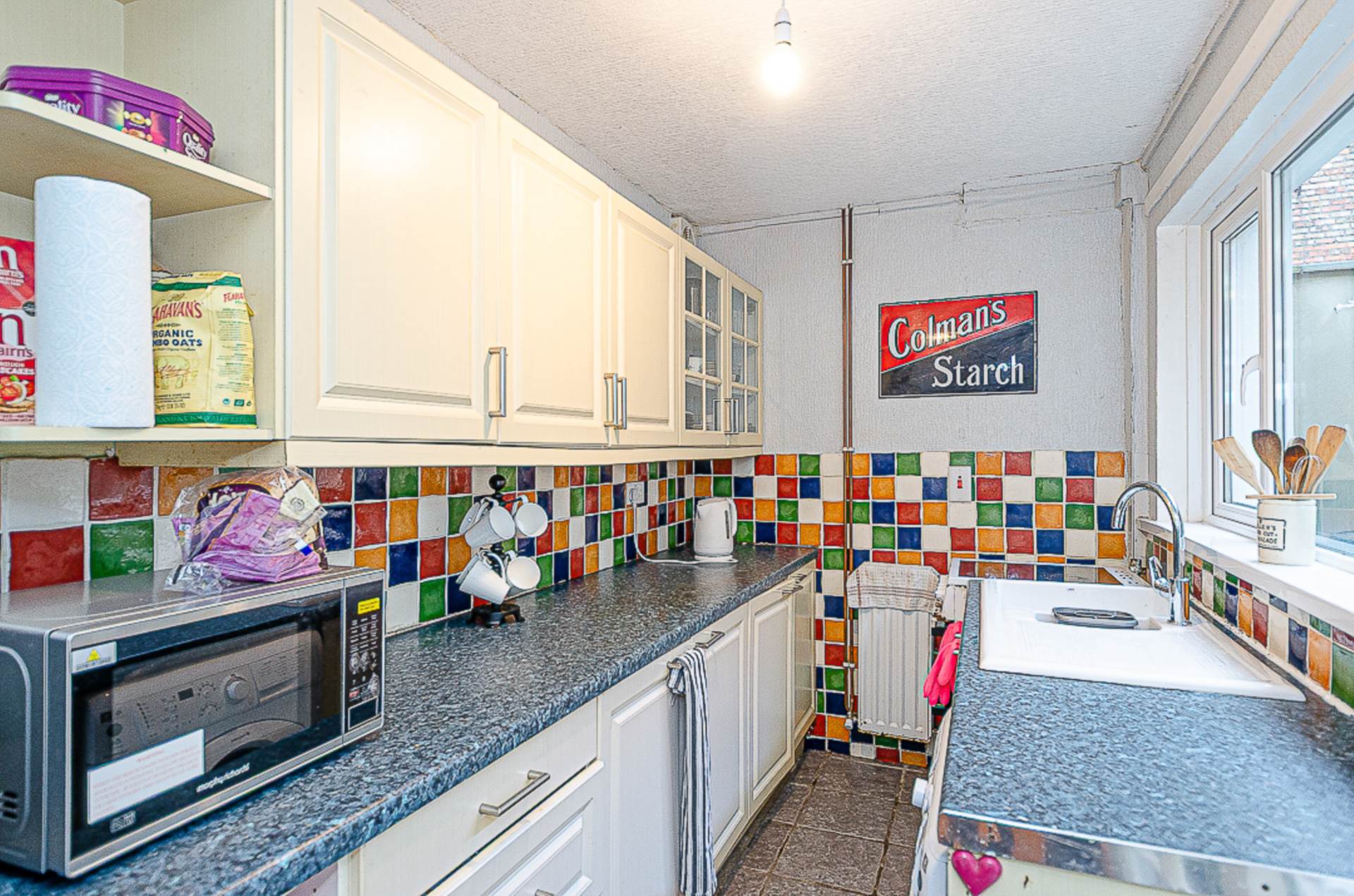 Kitchen - 11'6" (3.51m) x 5'11" (1.8m)Range of high and low level fitted units, white ceramic sink with chrome tap, glass display units, part tiled walls, ceramic tiled floor, and extractor fan