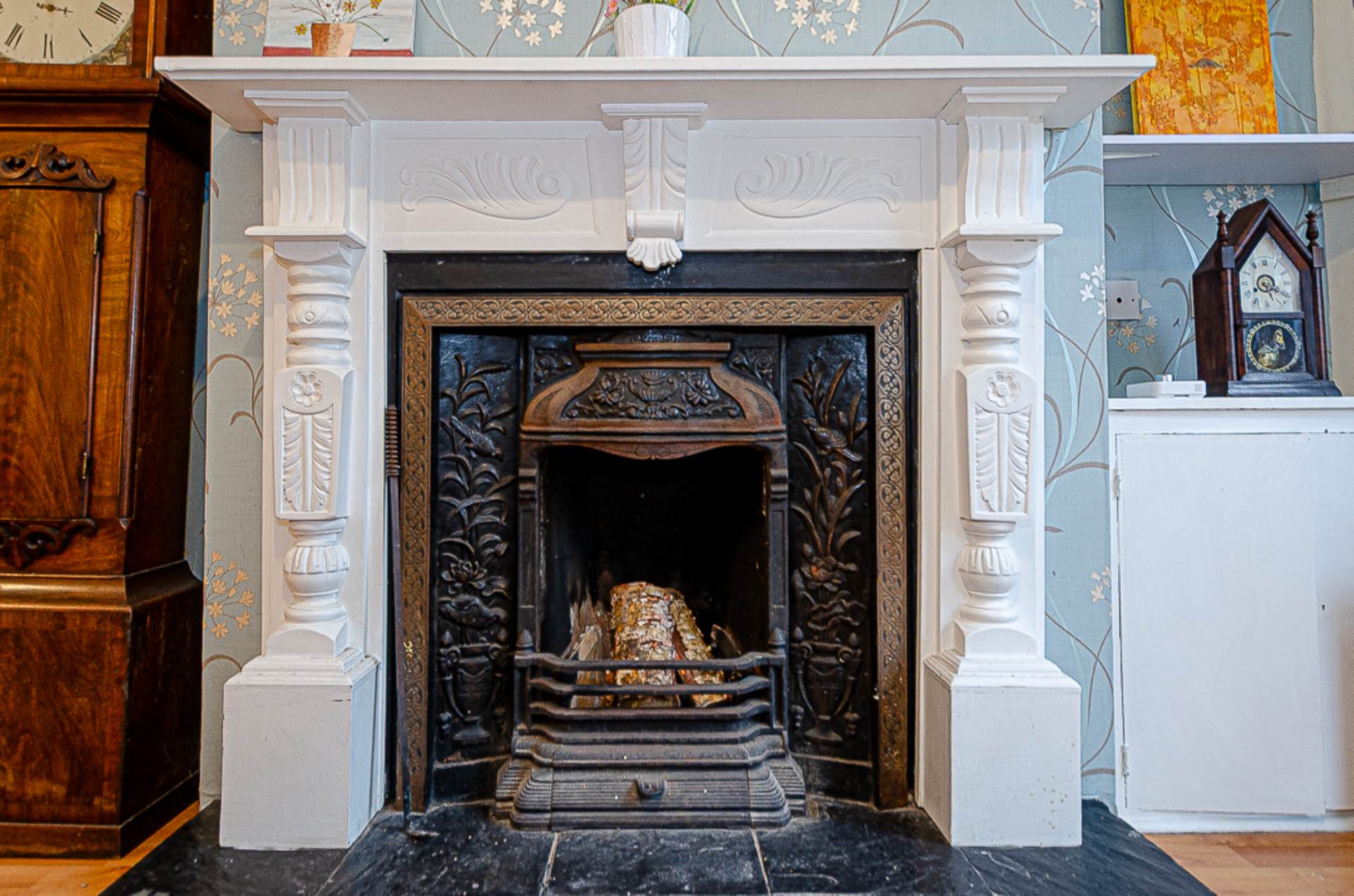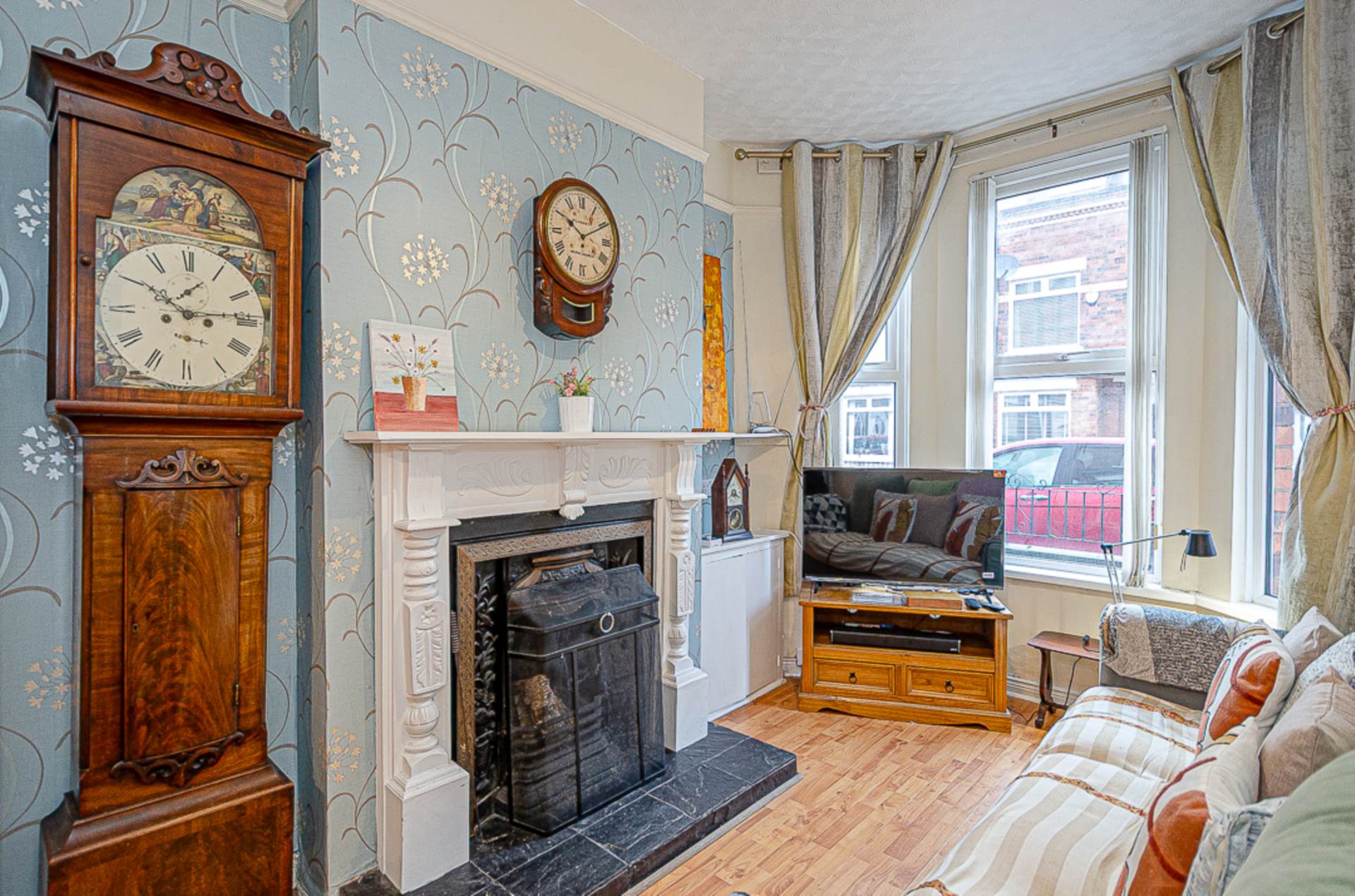 Through lounge - 22'9" (6.93m) x 9'11" (3.02m)Bay window, feature fireplace with timber surround, cast iron inset, and tiled hearth, picture rail, timber laminate floor and storage under stairs