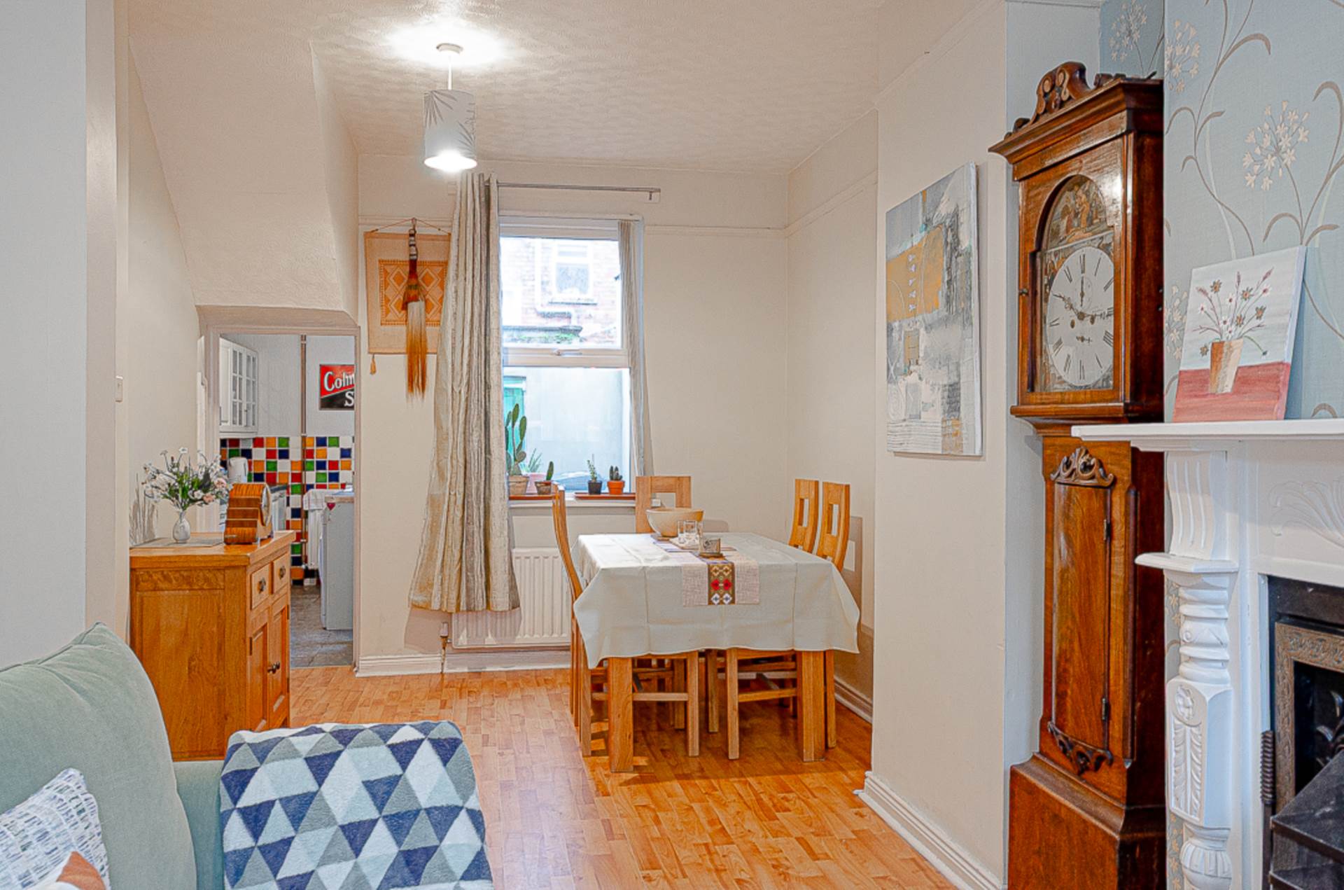 The property comprises a welcoming entrance hall finished with timber laminate flooring, leading to a bright through lounge featuring a bay window and attractive feature fireplace, creating a comfortable and inviting living and dining space. The fitted kitchen provides practical everyday functionality with direct access to the rear yard.