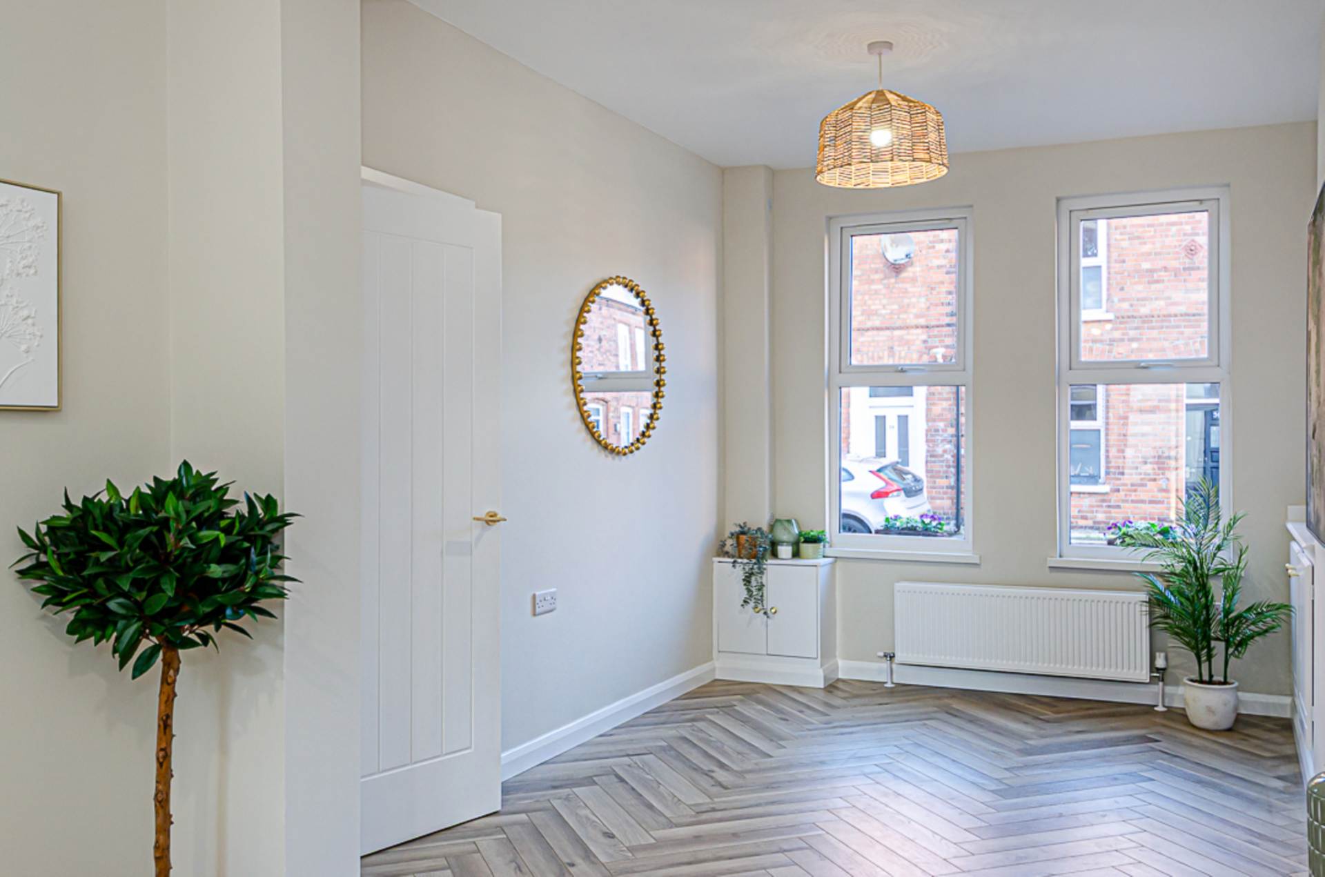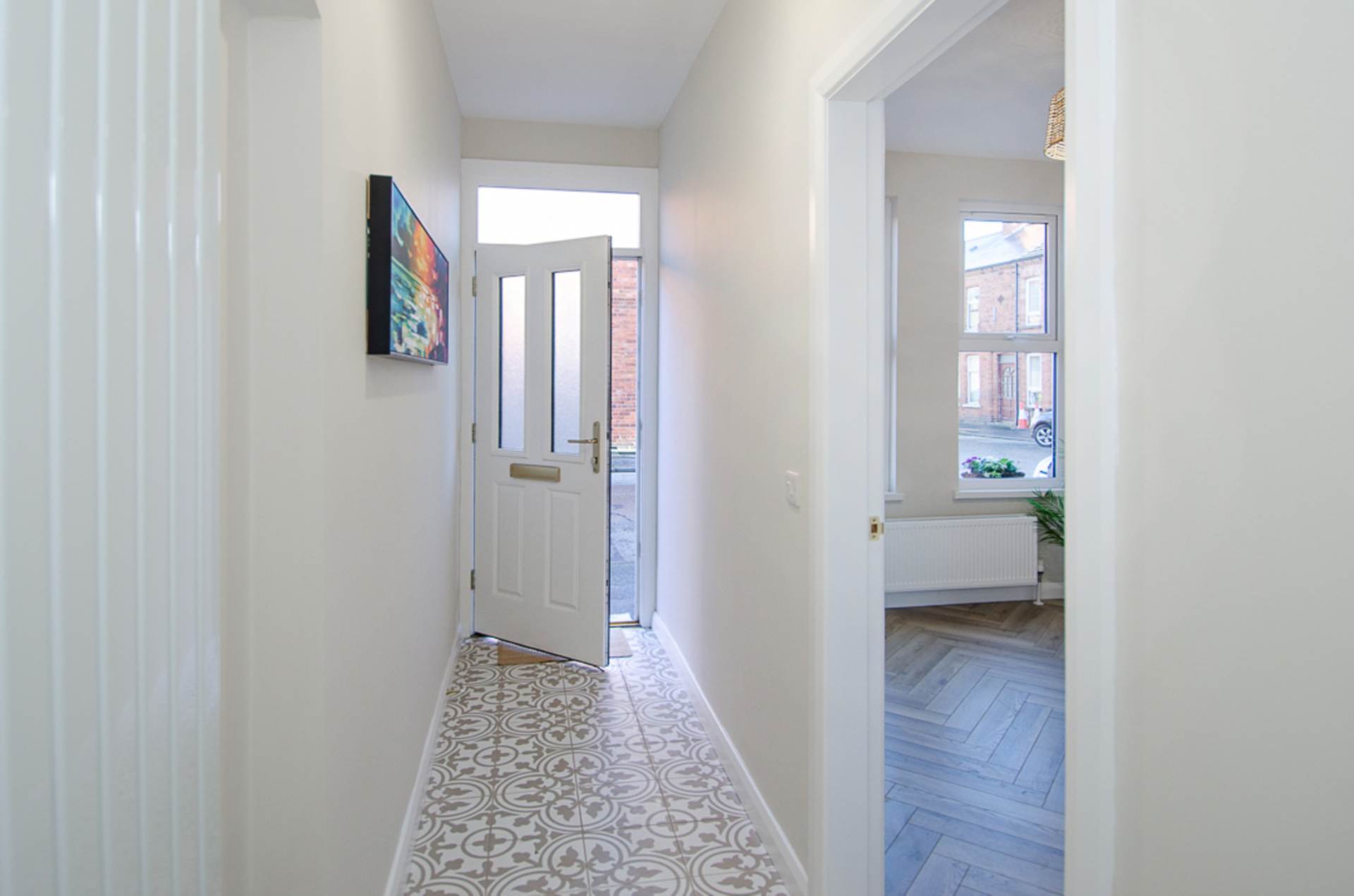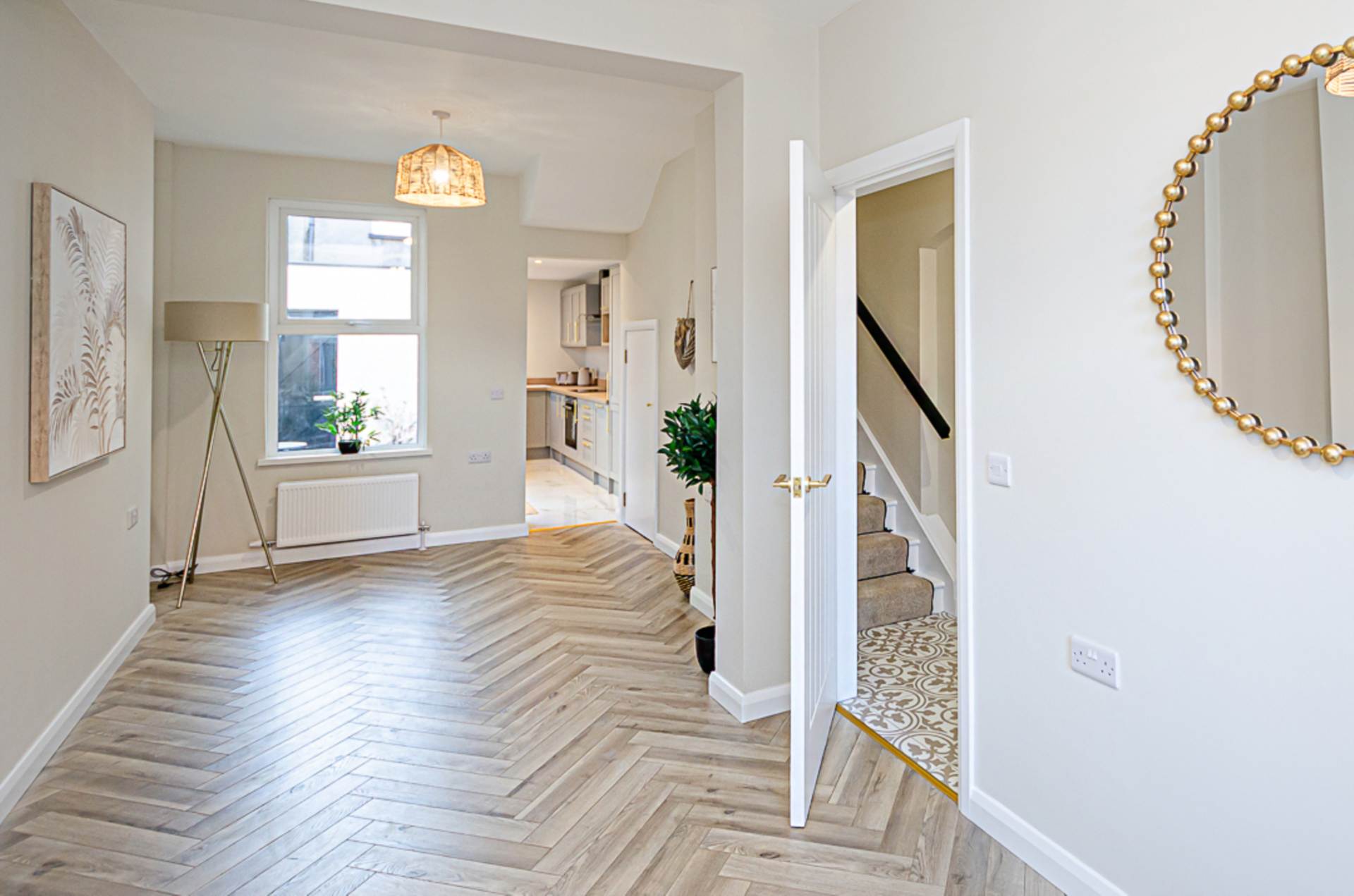 The property is accessed via a welcoming entrance hall featuring an eye-catching decorative tiled floor, immediately setting the tone for the quality and attention to detail found throughout. The bright, through lounge is flooded with natural light and provides an excellent space for both relaxing and entertaining, enhanced by a stylish herringbone timber laminate floor that adds warmth and character.
