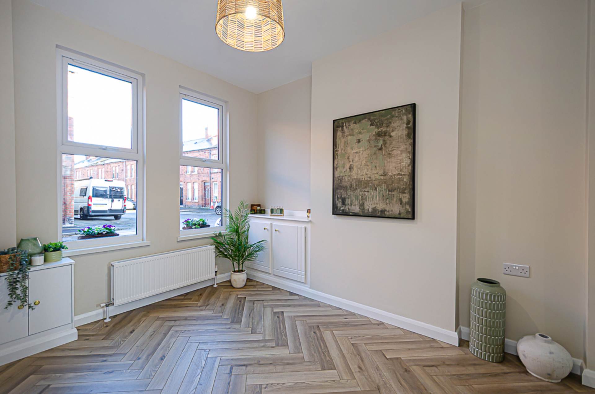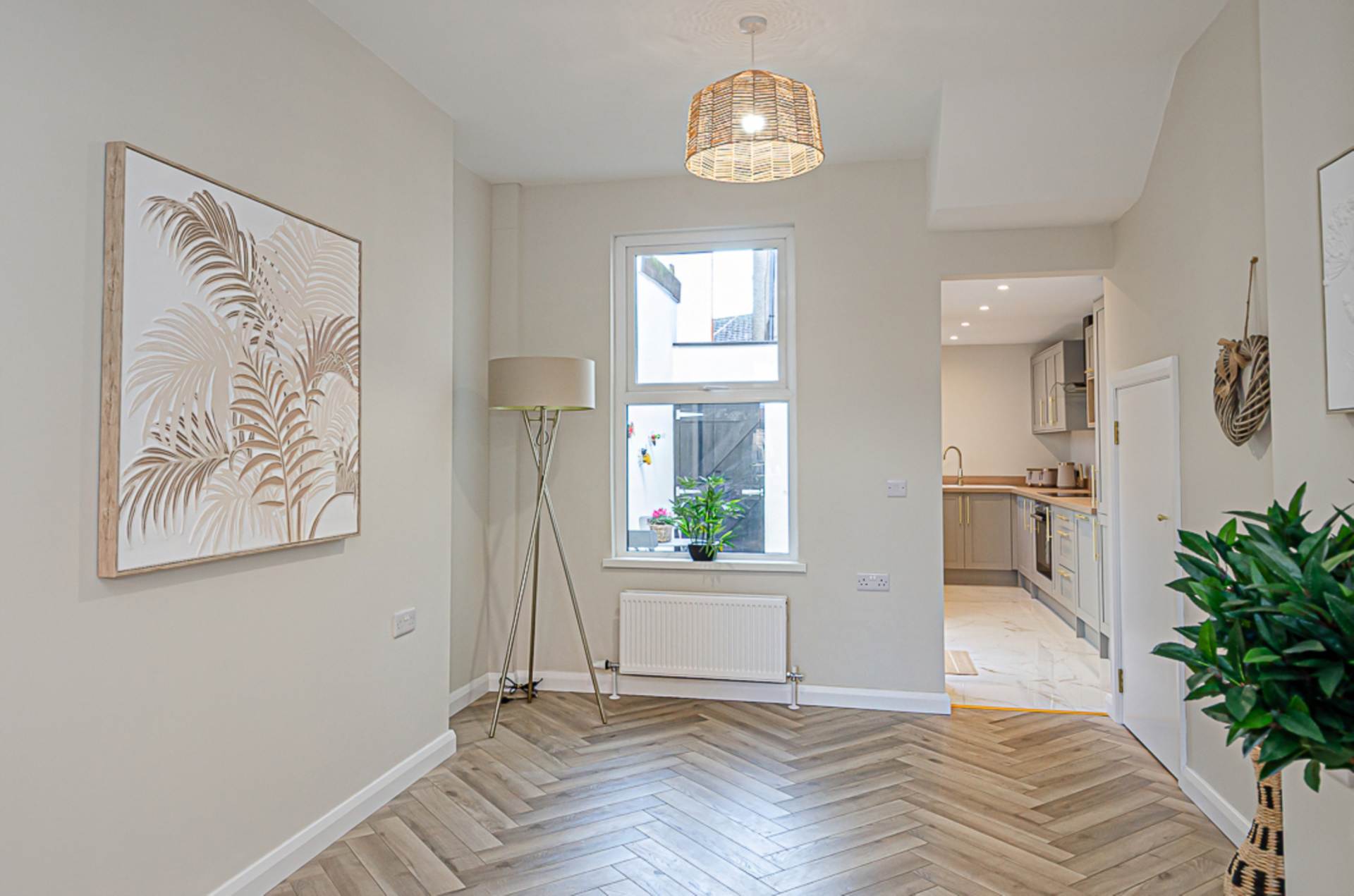 Through lounge - 22'6" (6.86m) x 9'8" (2.95m)TV point integrated into chimney breast, herringbone timber laminate floor and storage under stairs