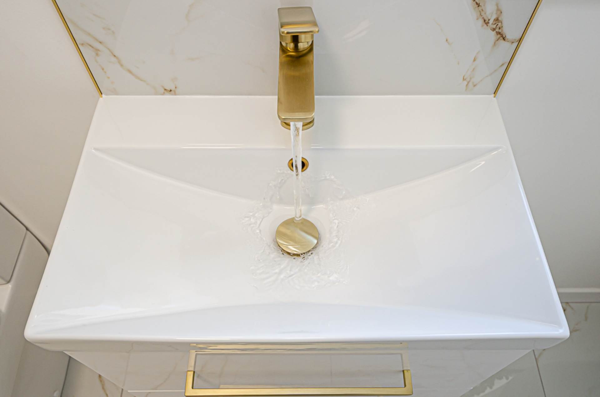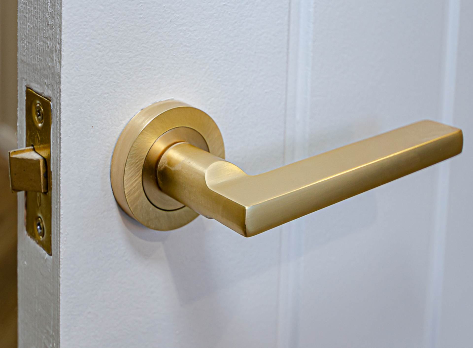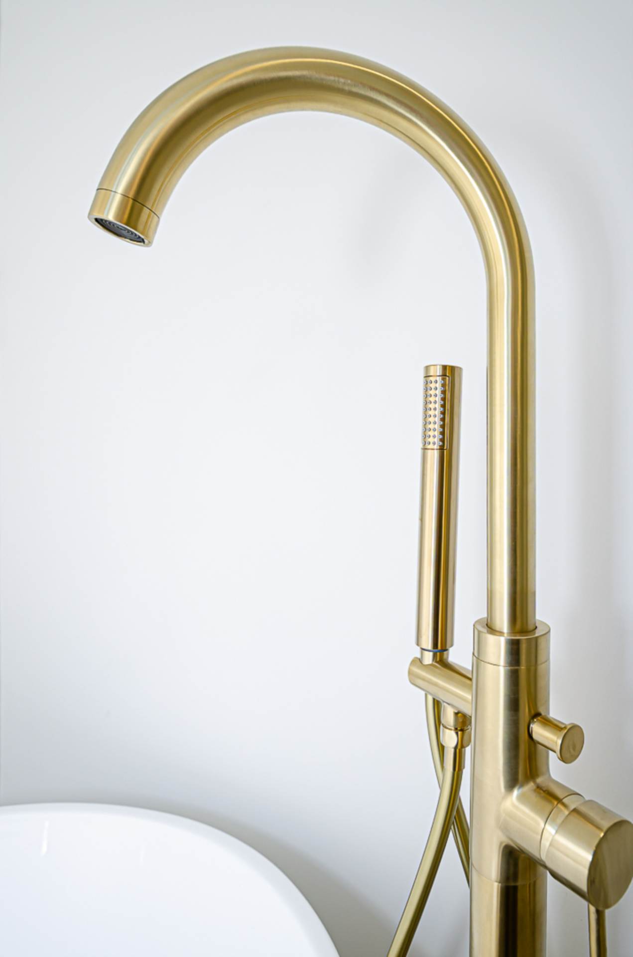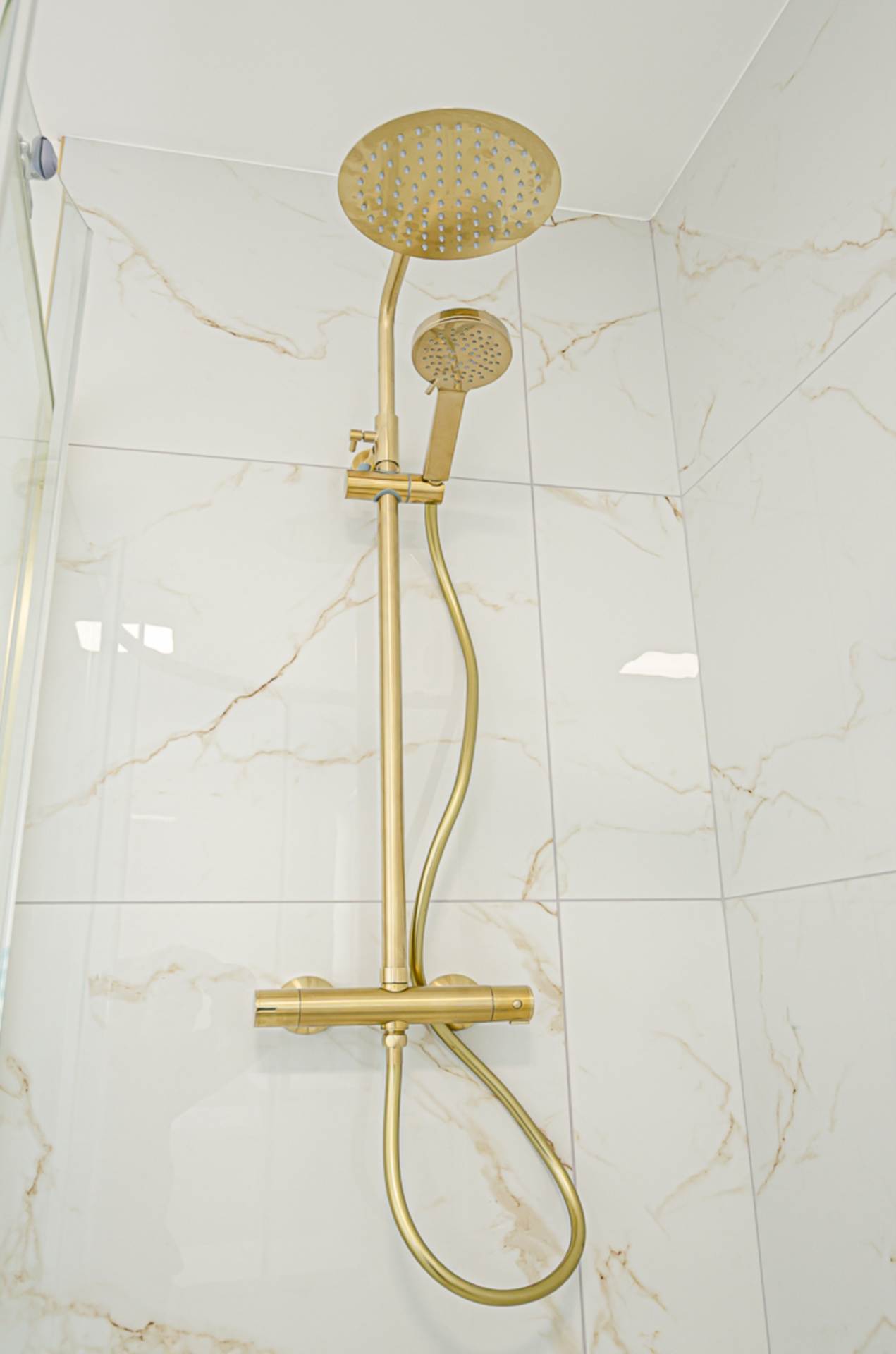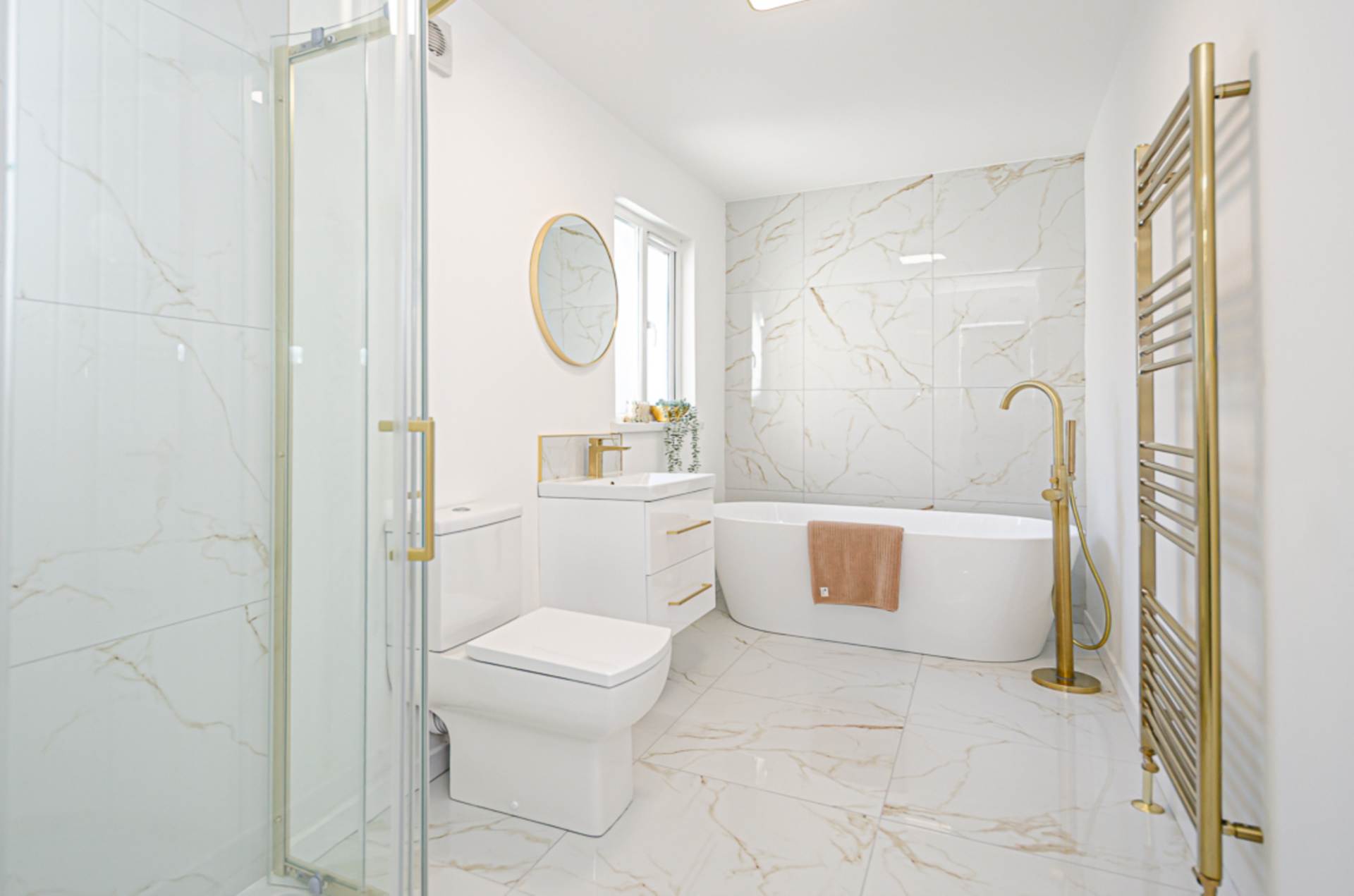 - Contemporary bathroom with separate shower cubicle and brushed brass fittings