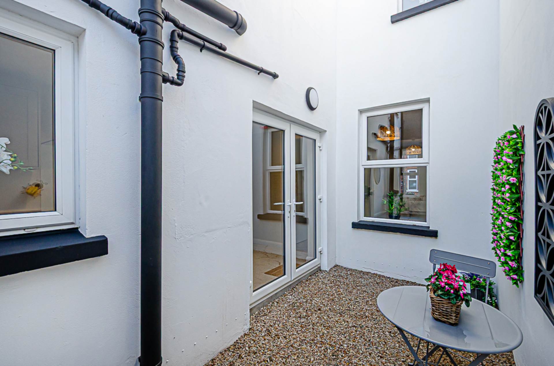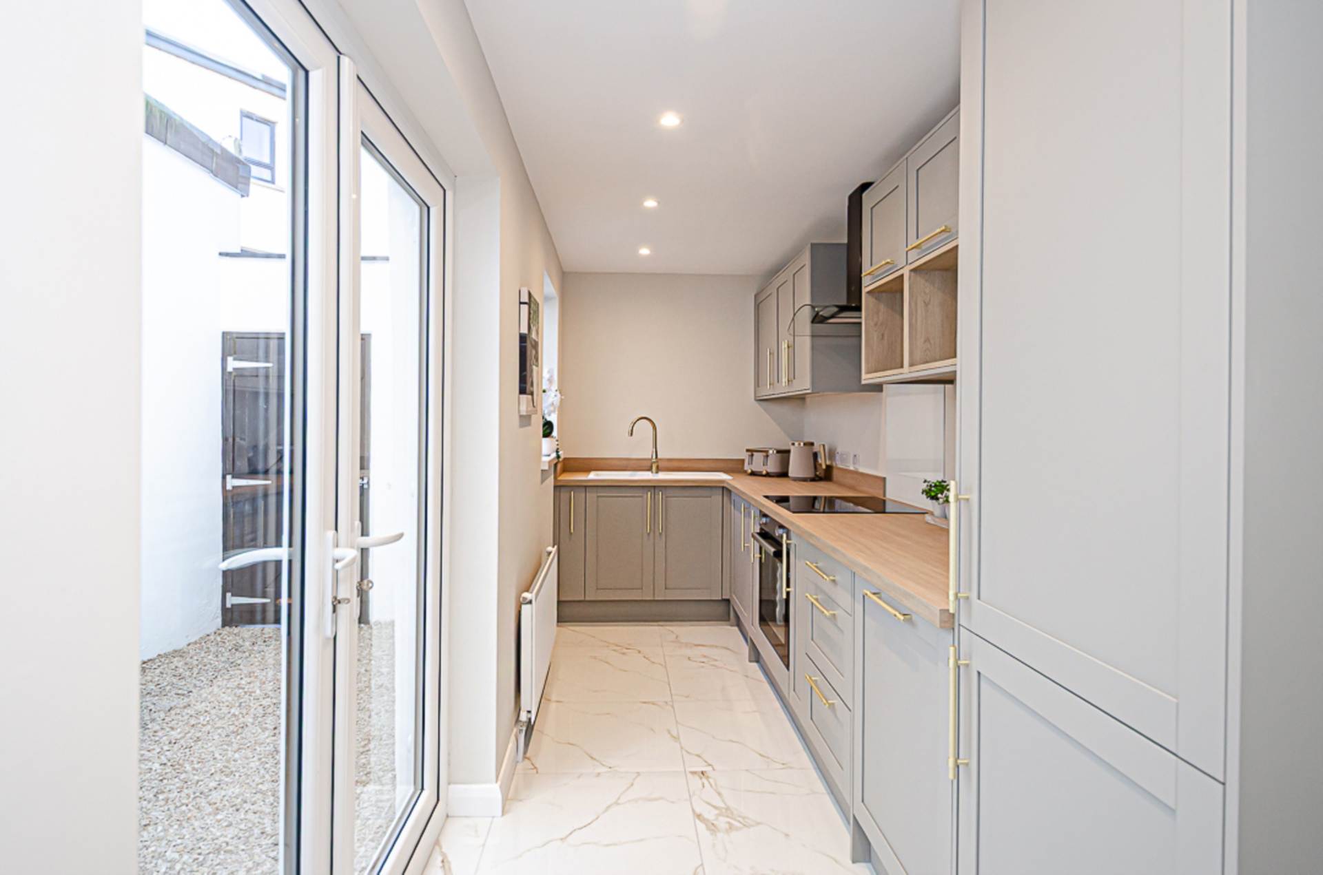 To the rear, the modern kitchen is finished in an attractive pebble-tone design, offering generous worktop space and ample storage, with recessed housing for integrated appliances to maintain a sleek, streamlined finish. French doors open onto the enclosed rear yard, creating a seamless flow between indoor and outdoor living, ideal for entertaining or everyday use.