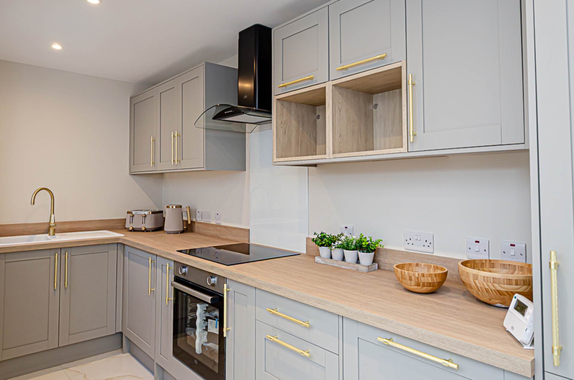 Kitchen - 15'6" (4.72m) x 5'3" (1.6m)Range of high and low level units in pebble colour finish with brushed brass handles, integrated stainless steel oven, ceramic hob with white glass splash back, black and glass extractor fan, white sink with brass tap, two open display cupboards, spaces for integrated fridge freezer, dishwasher and washing machine, marble effect porcelain floor tiling, recessed spotlights and French doors to south facing yard