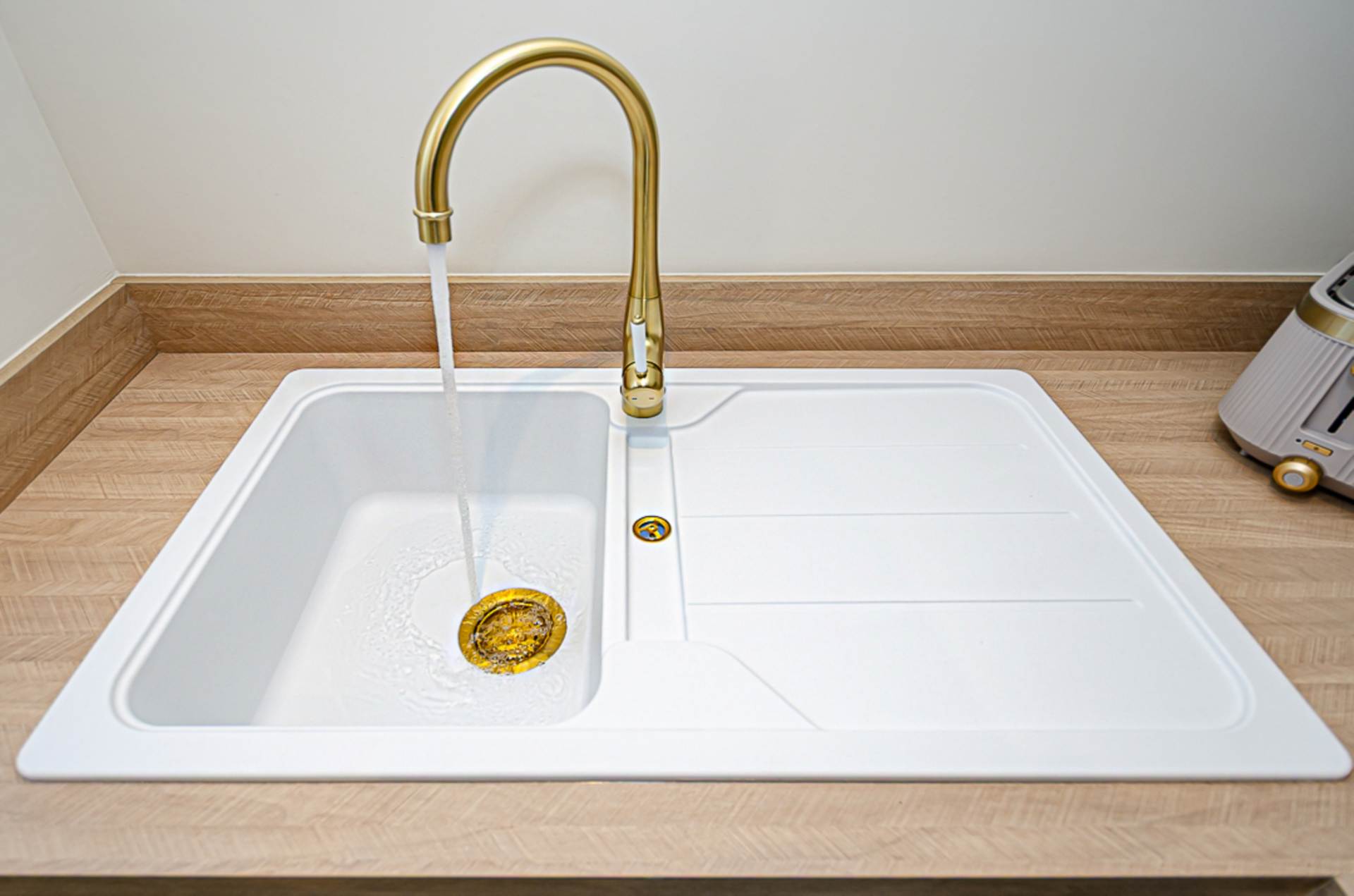 - Modern kitchen in pebble finish with French doors to yard