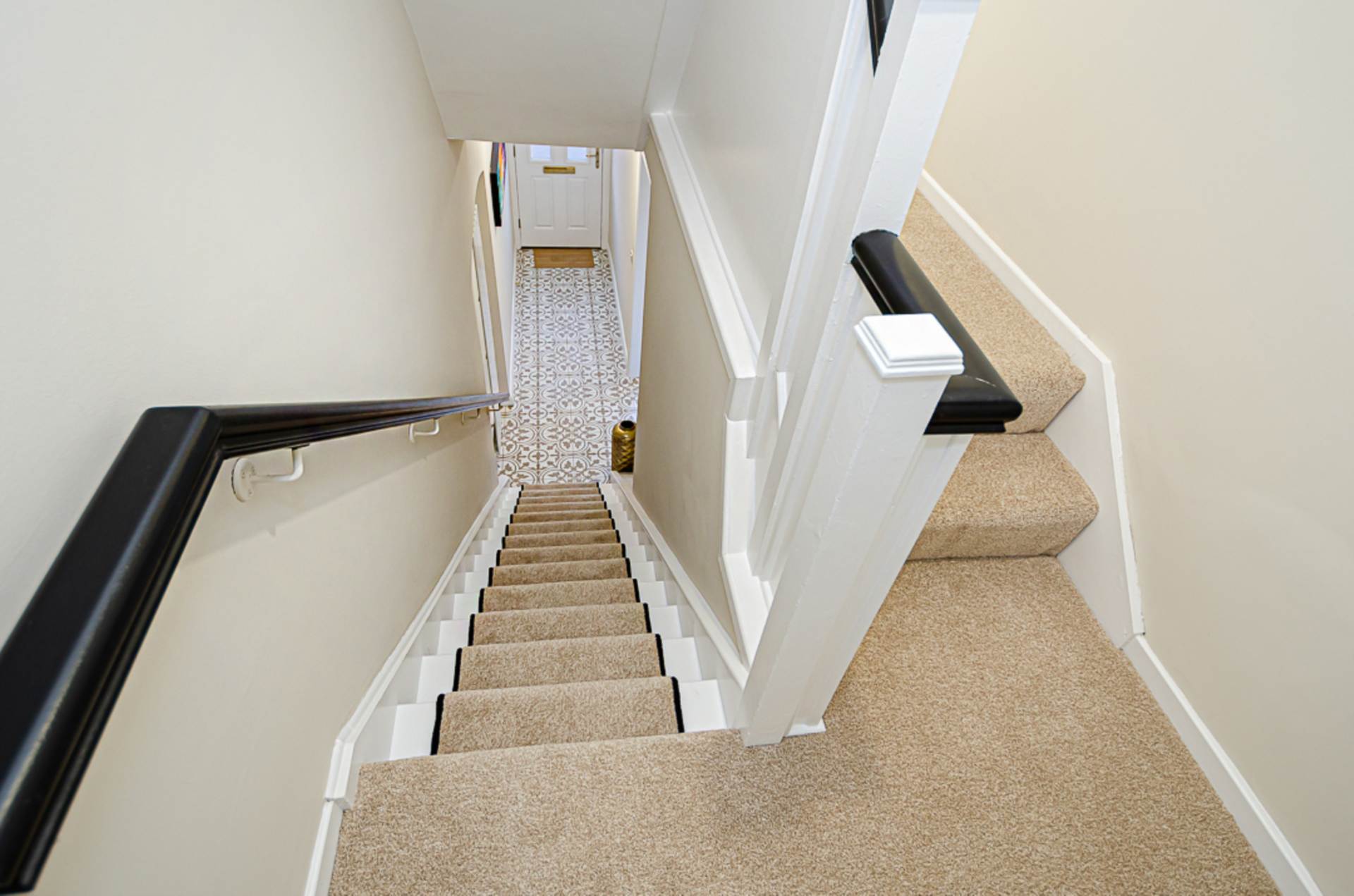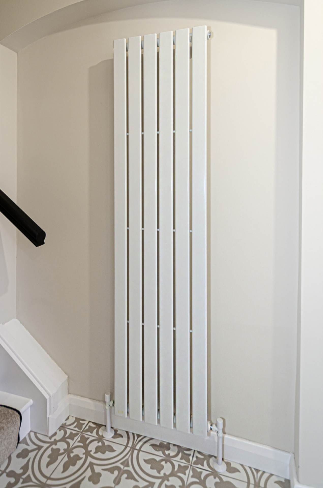 Entrance hallDecorative ceramic tiled floor, statement vertical radiator, stairs with black edged runner, black stair rods and black banister