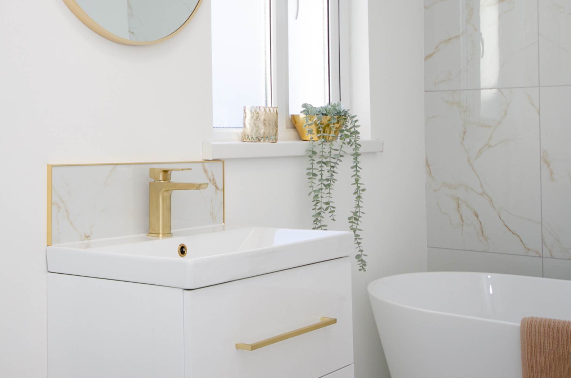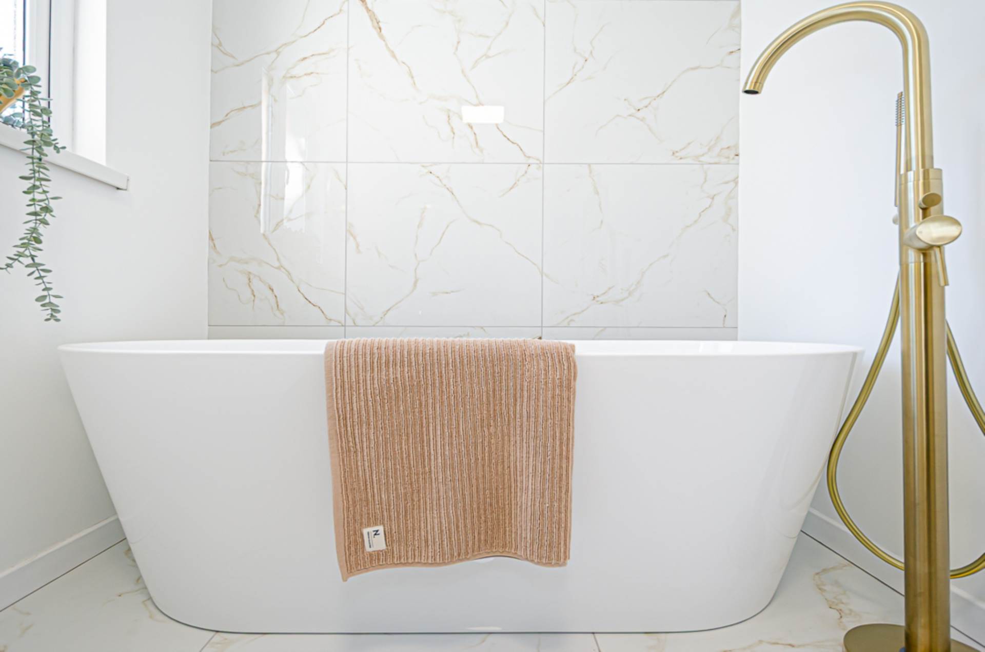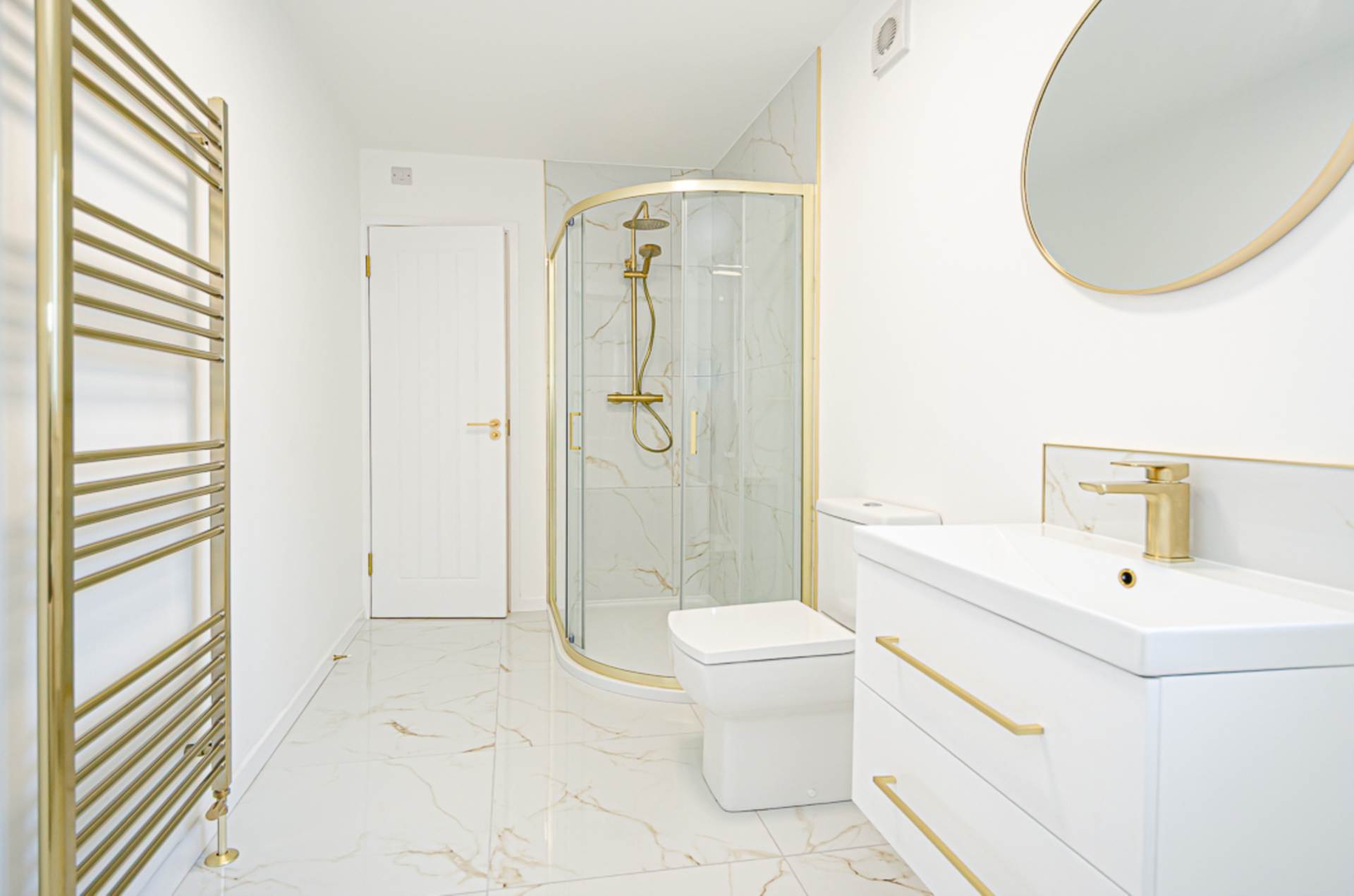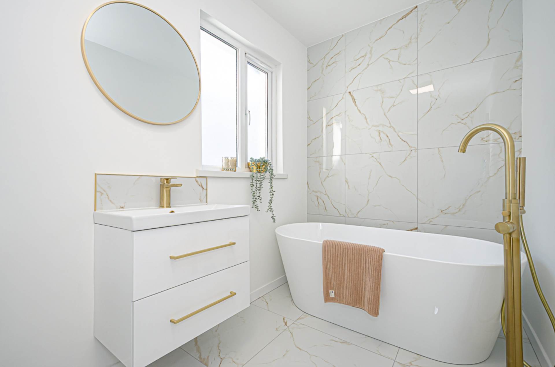 First floorBedroom 1 - 13'0" (3.96m) x 10'11" (3.33m)Bedroom 2 - 11'0" (3.35m) x 7'8" (2.34m)Bathroom - 13'5" (4.09m) x 5'5" (1.65m)White suite - freestanding bath with brushed brass freestanding tap, wash hand basin in wall mounted, two drawer vanity unit with brushed brass mixer tap and handles, tiled splash back, W.C., large shower cubicle with marble effect tiling, brushed brass thermostatic shower, dual shower heads, and sliding doors, marble effect porcelain floor tiling, brushed brass towel rail radiator and extractor fan