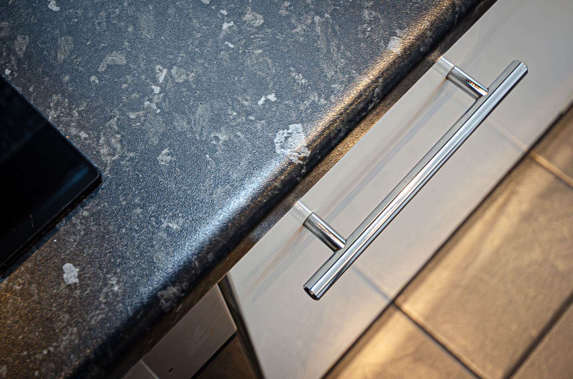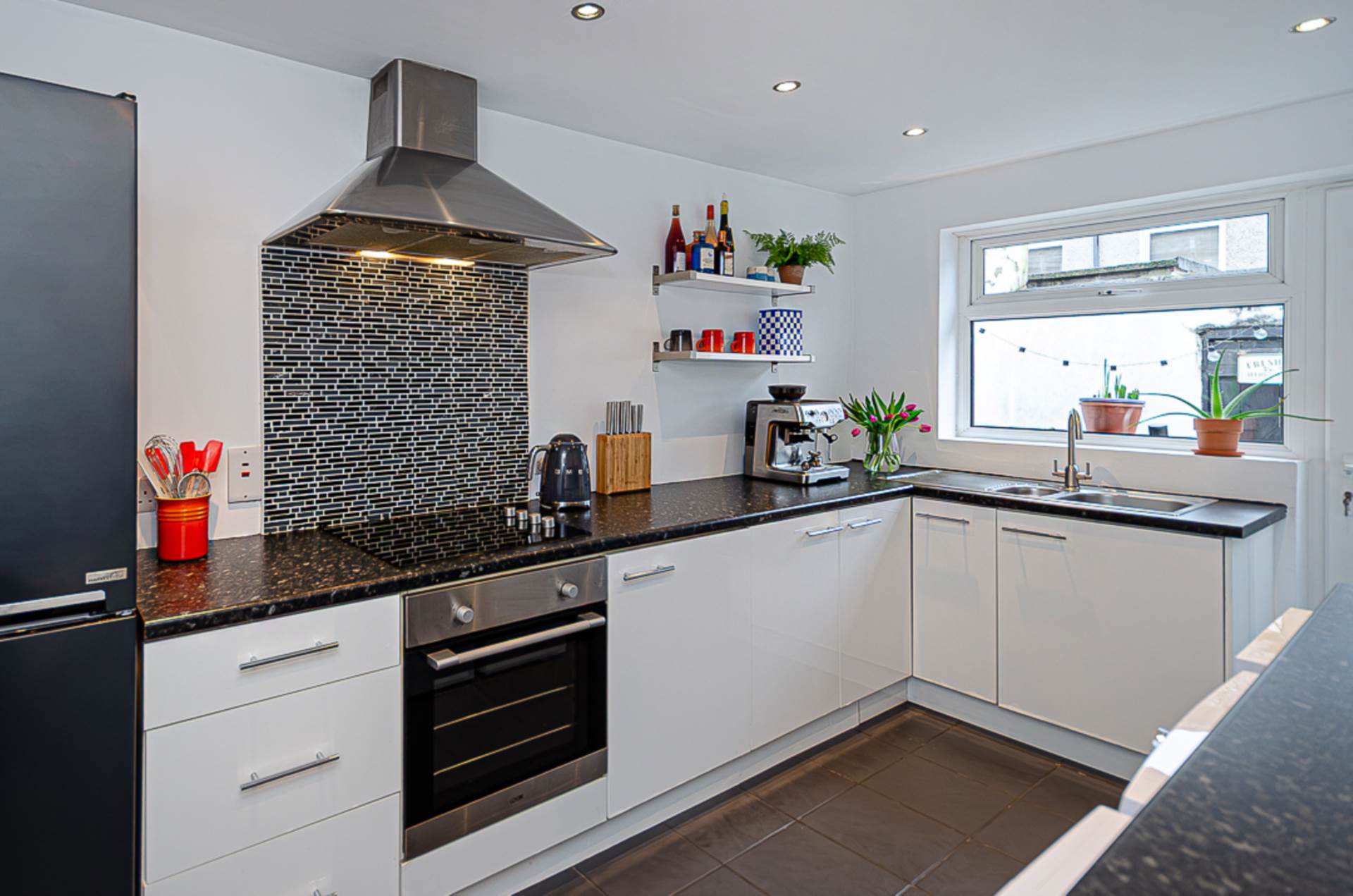 Kitchen - 12'10" (3.91m) x 7'11" (2.41m)Modern range of high and low level units, stainless steel oven, ceramic hob, wide stainless steel extractor canopy, tiled splash back, stainless steel bowl and a half sink, plumbing for washing machine, plumbing for dishwasher, space for tumble dryer, ceramic tiled floor, and recessed spotlights