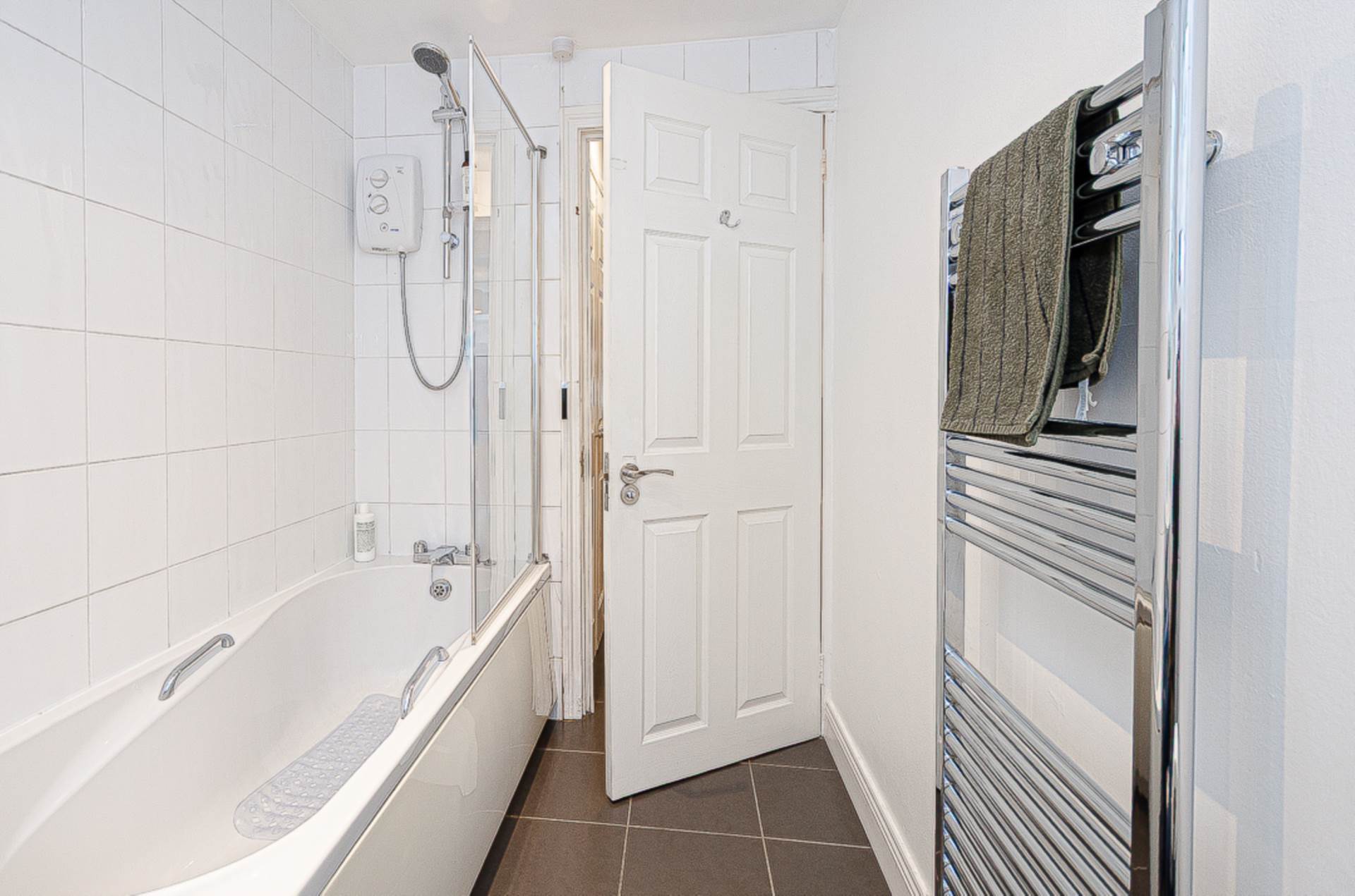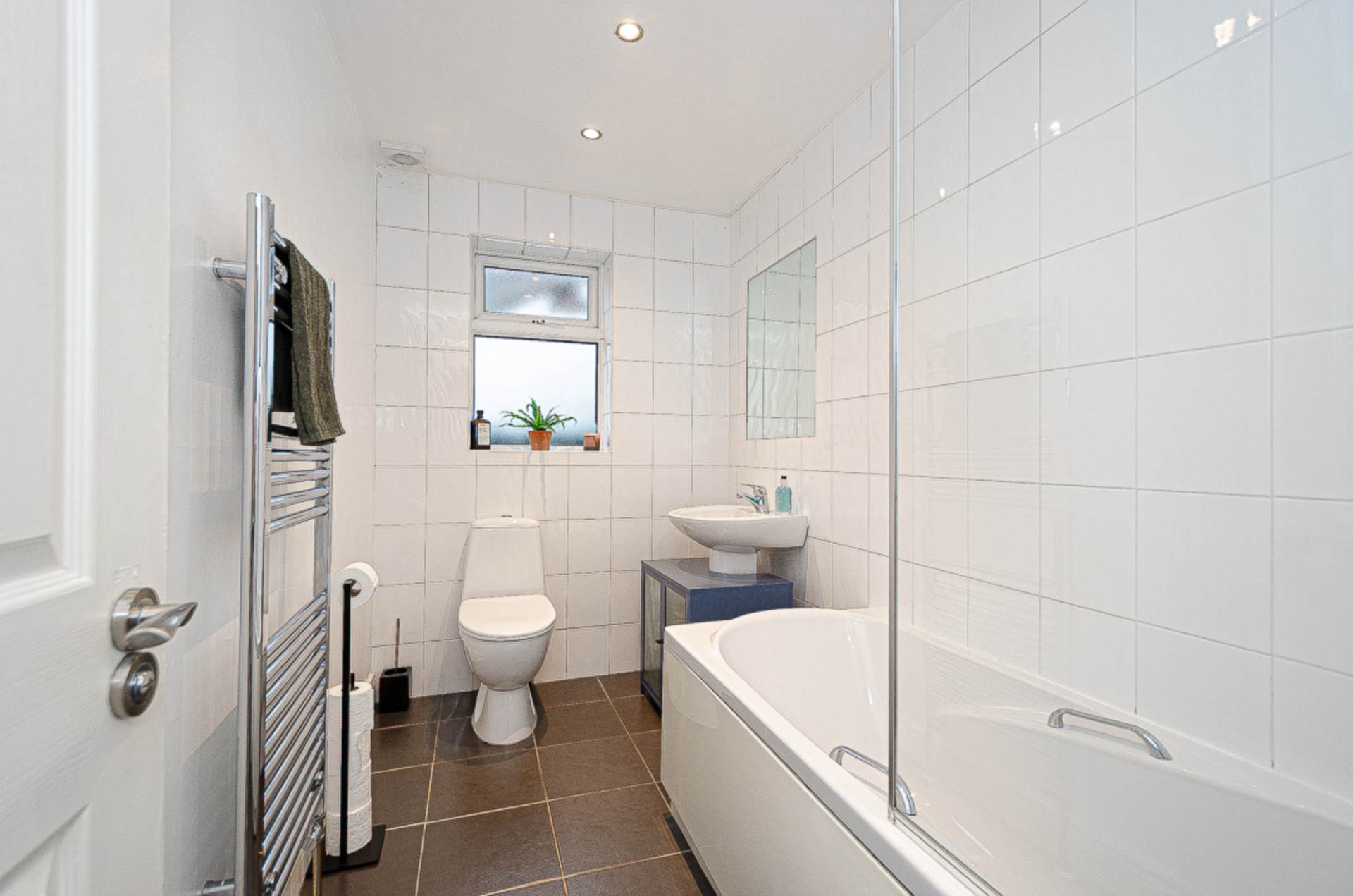 Bathroom - 9'2" (2.79m) x 5'3" (1.6m)White suite with electric shower and screen over bath, wash hand basin, W.C., tiled walls, ceramic tiled floor, recessed spotlights and extractor fan