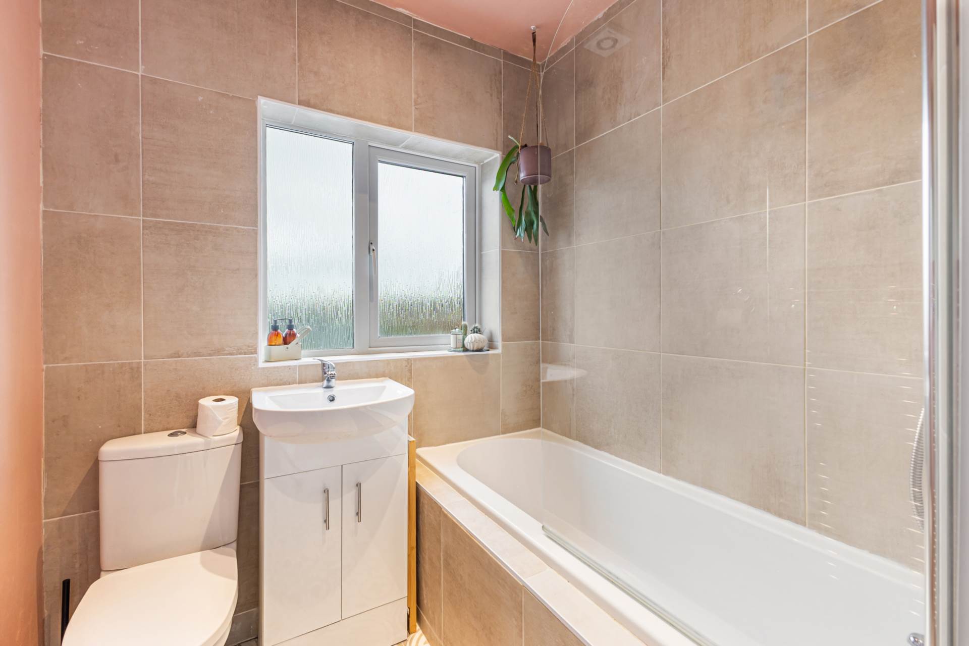 Bathroom - 6'9" (2.06m) x 5'11" (1.8m)White suite with thermostatic shower and screen over bath, wash hand basin in vanity unit, W.C., modern tiled walls, decorative ceramic tiled floor, chrome towel rail radiator, recessed spotlights and extractor fan