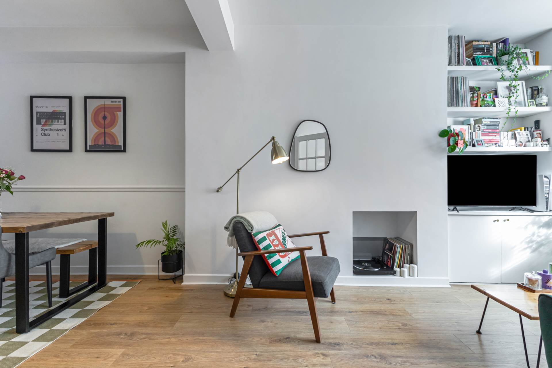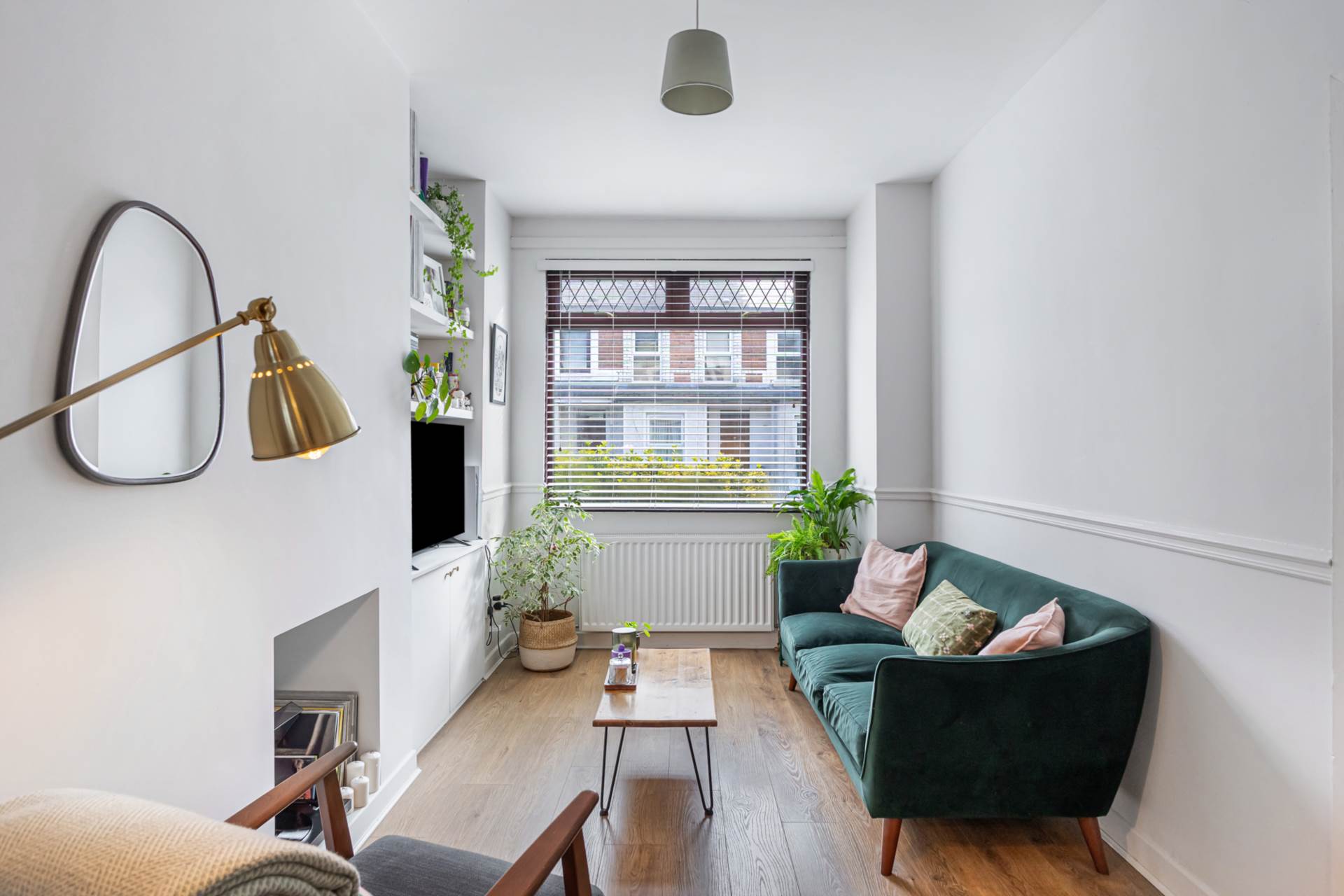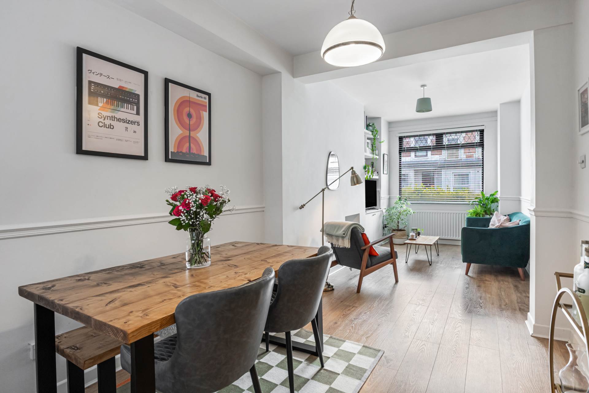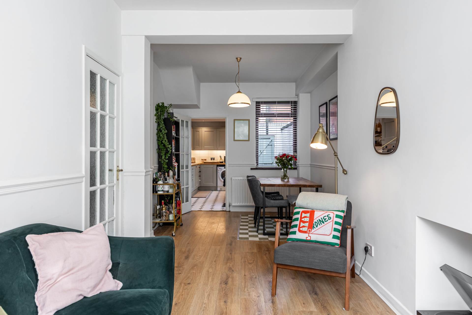 Through lounge - 24'6" (7.47m) x 9'4" (2.84m)Bay window, hole in the wall fireplace, dado rail, timber laminate floor and storage under stairs