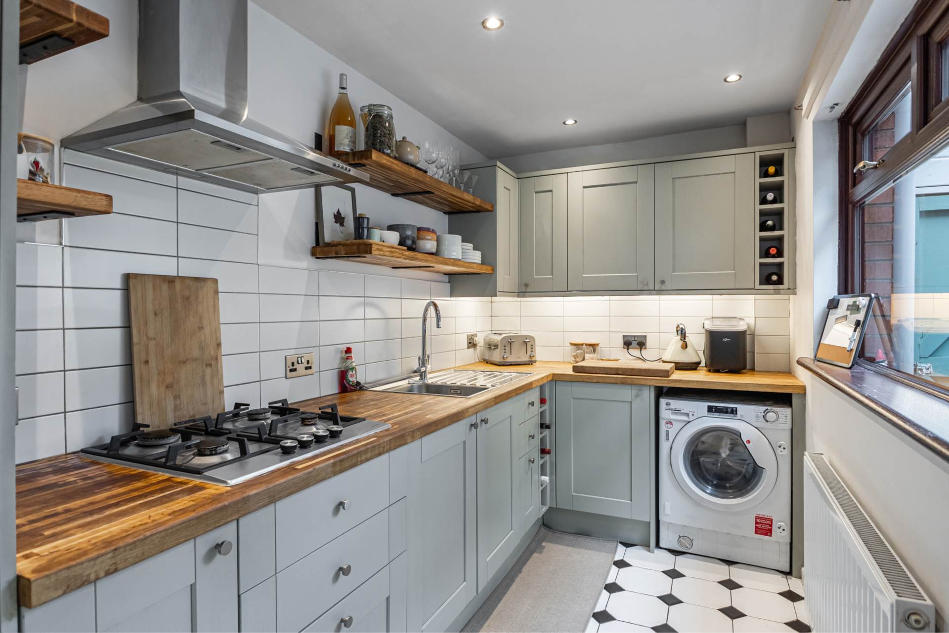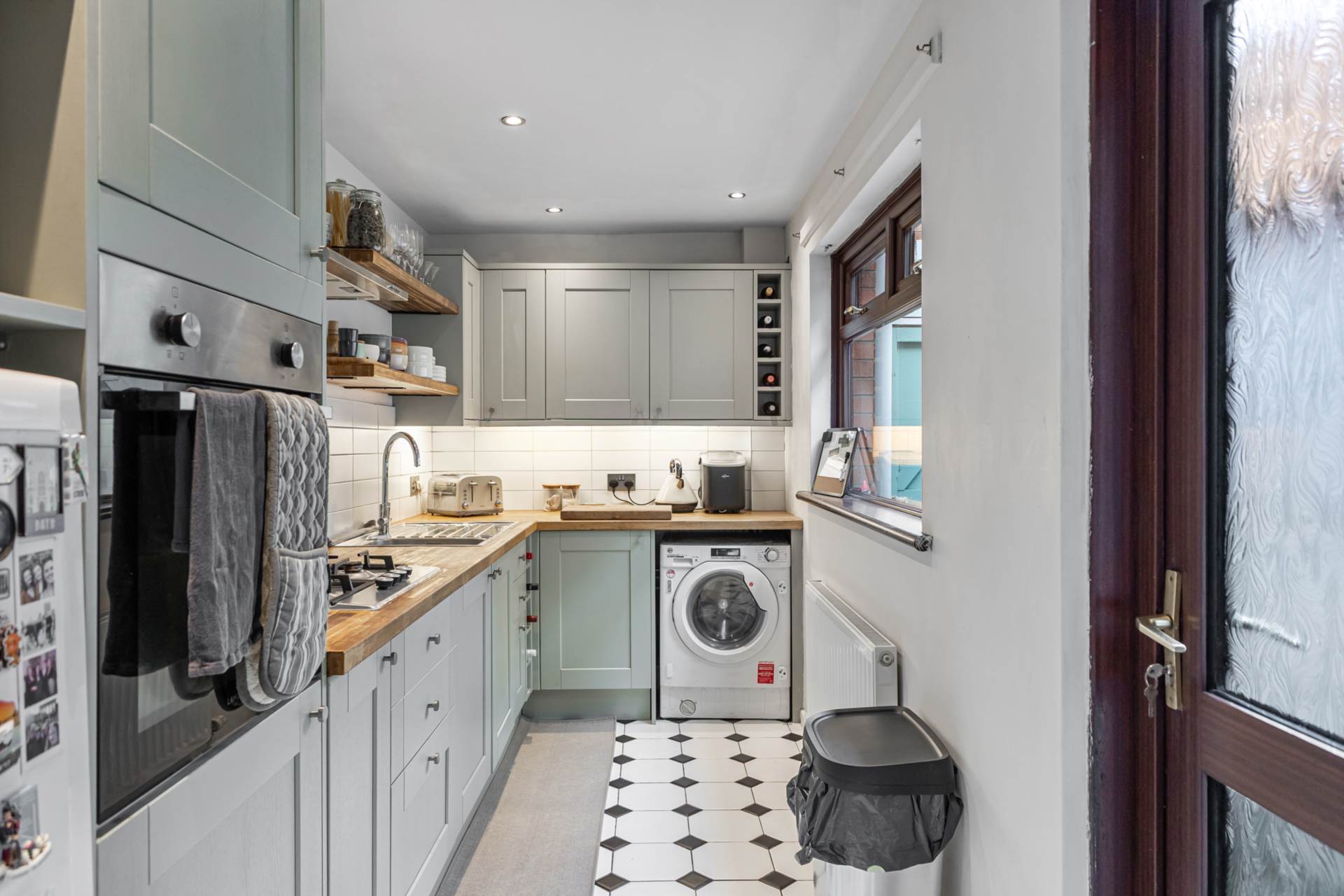 To the rear, the recently installed kitchen forms a stylish and practical heart of the home. It is fitted with a modern range of high and low-level sage green units, complemented by an integrated stainless steel oven, gas hob and matching extractor canopy. Additional features include a stainless steel sink unit, built-in wine rack, open shelving, part-tiled walls, ceramic tiled flooring and recessed spotlights offering excellent storage and generous workspace within a contemporary setting.