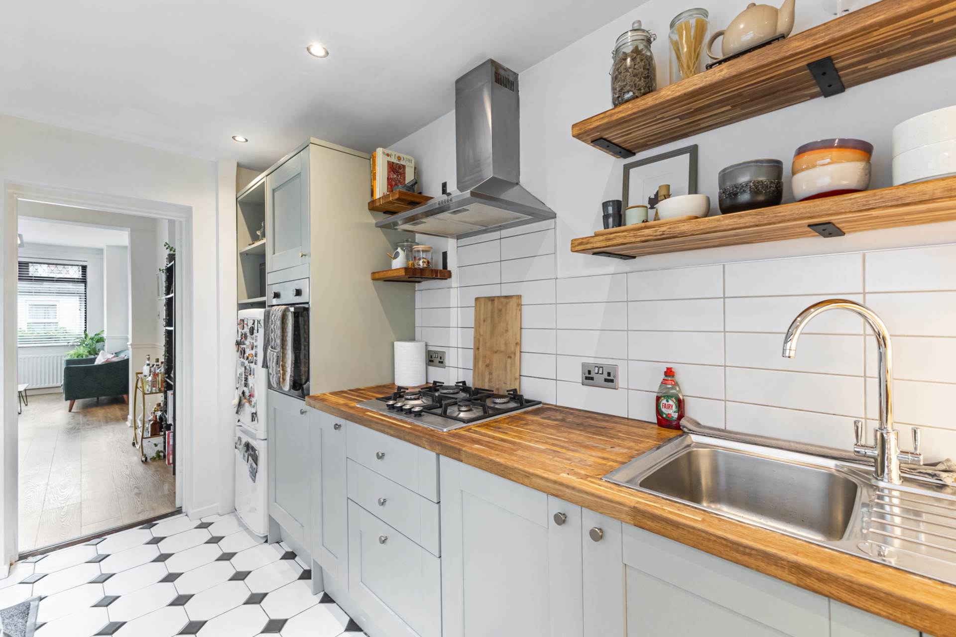 Kitchen - 14'1" (4.29m) x 5'11" (1.8m)Range of high and low level fitted units in safe green units, integrated stainless steel oven, gas hob, stainless steel extractor canopy, stainless steel sink, wine rack, part tiled walls, ceramic tiled floor, shelving and recessed spotlights