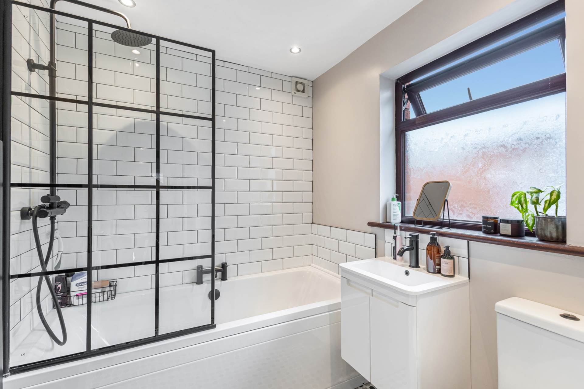 Bathroom - 6'10" (2.08m) x 5'11" (1.8m)White suite - Bath with side mounted black mixer taps, thermostatic shower, dual shower heads, black framed bath screen, wash hand basin in wall mounted vanity unit, black mixer taps, W.C., part tiled walls, decorative ceramic tiled floor, recessed spotlights and extractor canopy