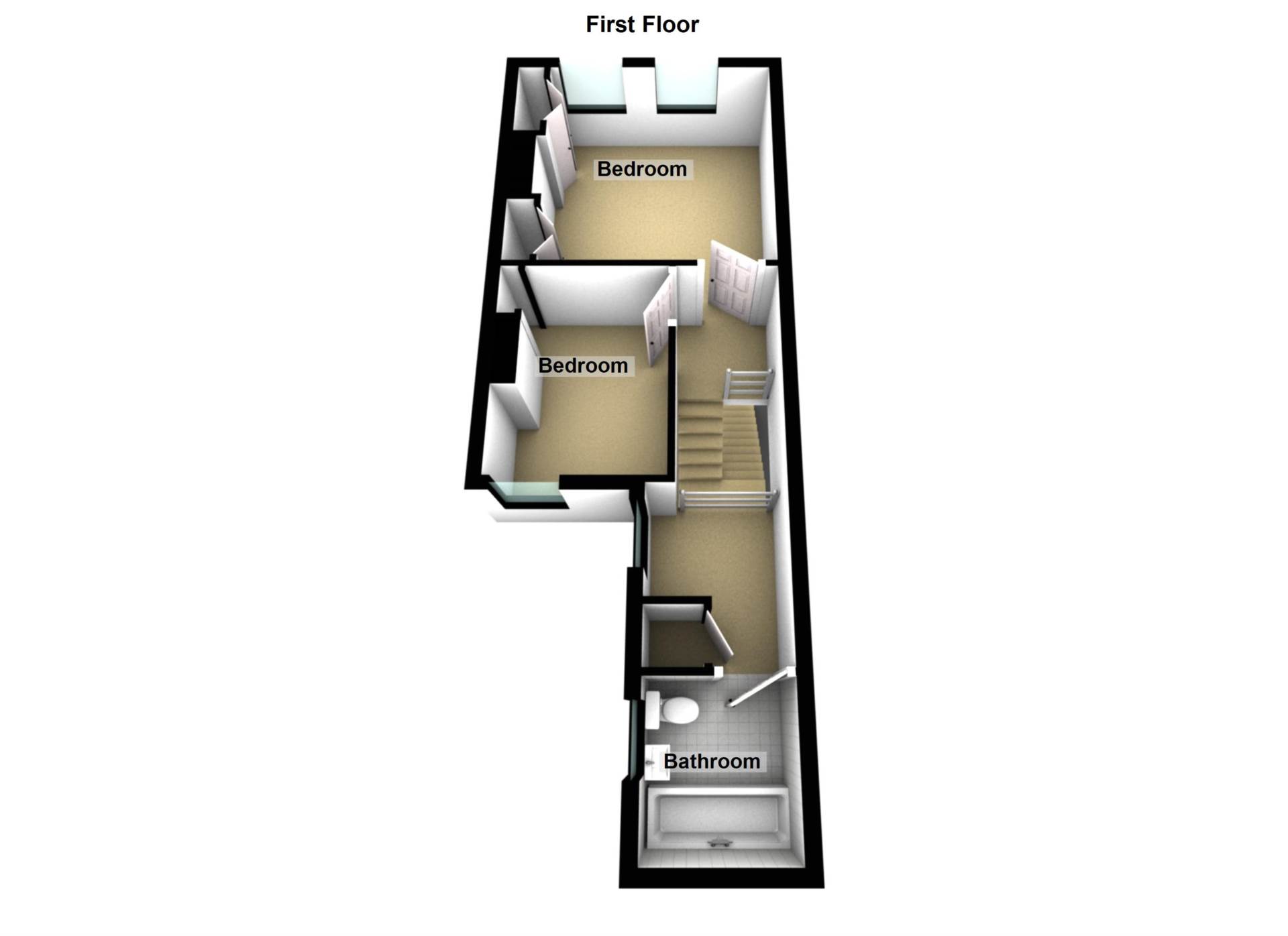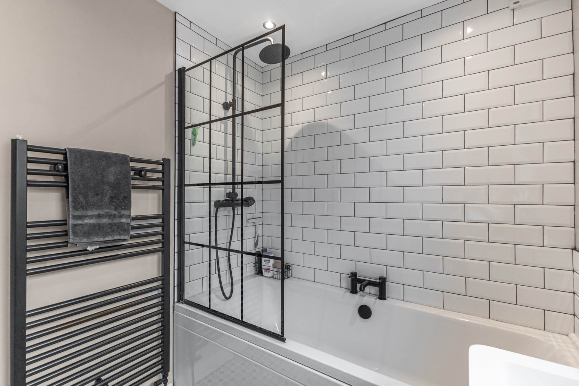 Upstairs, the property continues to impress with two well-proportioned bedrooms and a newly fitted bathroom finished to a high standard. The bathroom comprises a contemporary white suite including a panelled bath with side-mounted black mixer taps, a thermostatic shower with dual shower heads and a sleek black-framed glass screen. A wash hand basin is set within a modern wall-mounted vanity unit with matching black mixer tap, alongside a low flush W.C. Decorative ceramic tiled flooring, part-tiled walls, recessed spotlights and extractor fan complete the space, creating a striking monochrome finish.