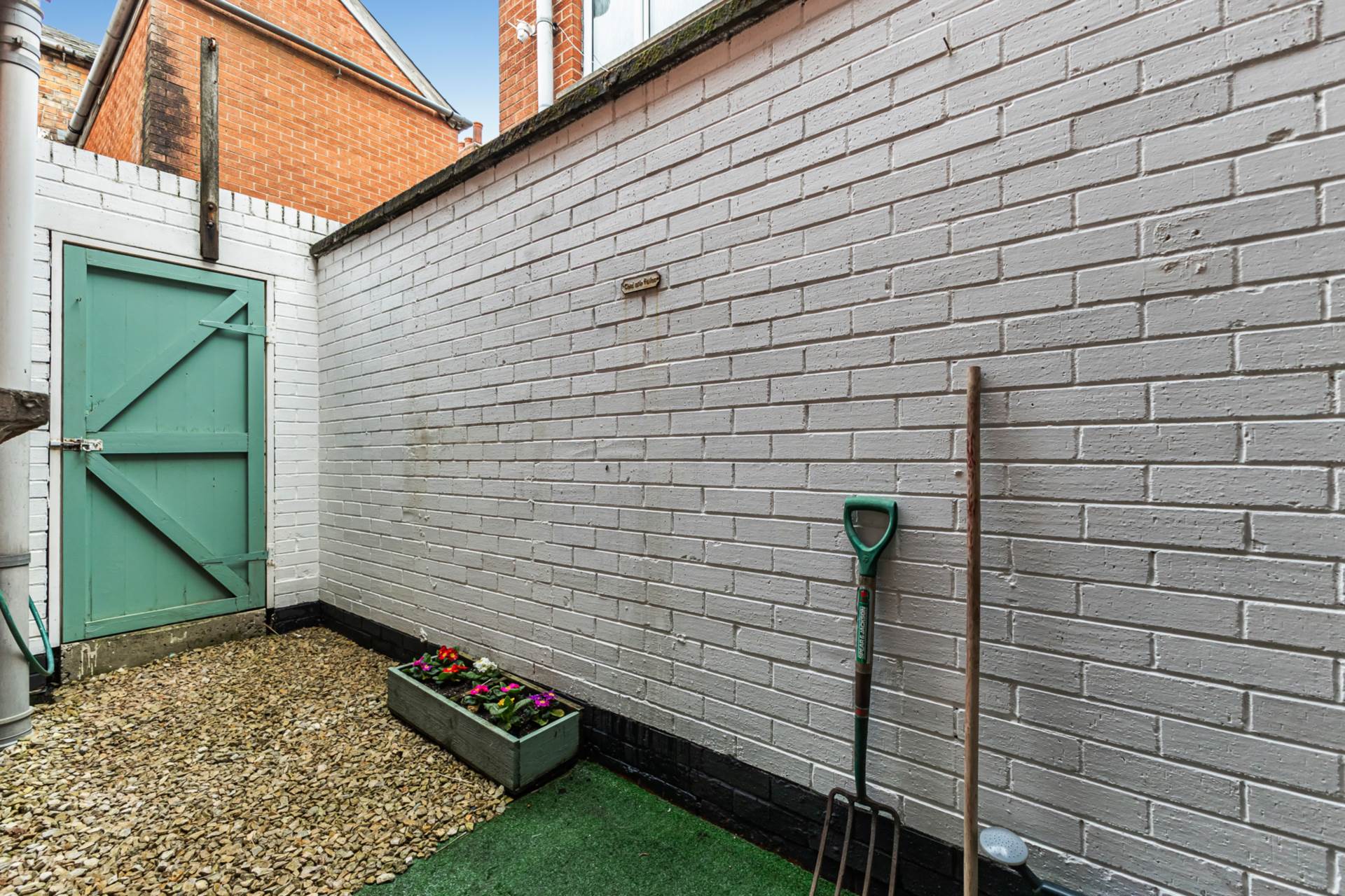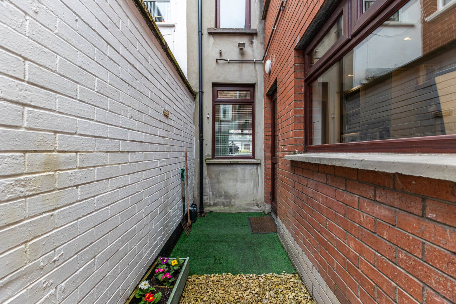 OutsideForecourt in small stones and path, and enclosed rear yard in artificial grass and small stones