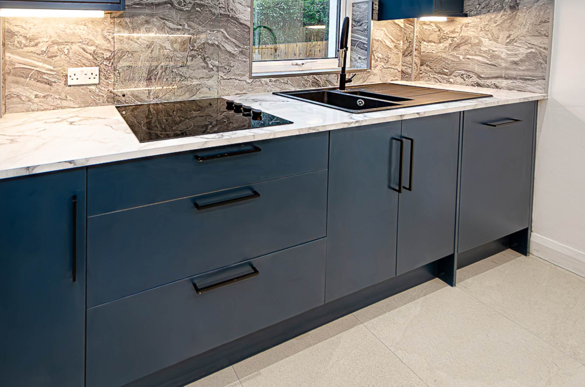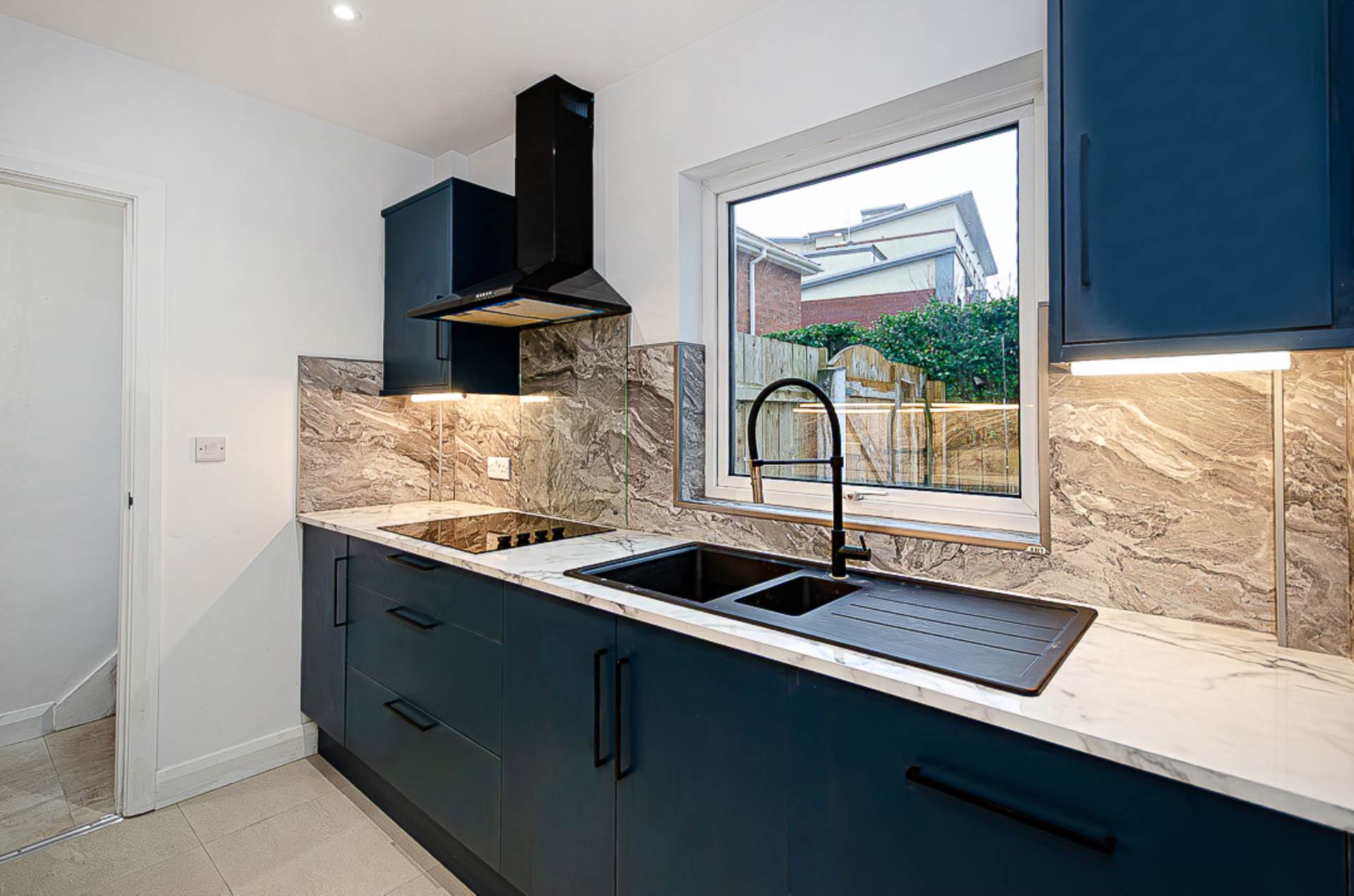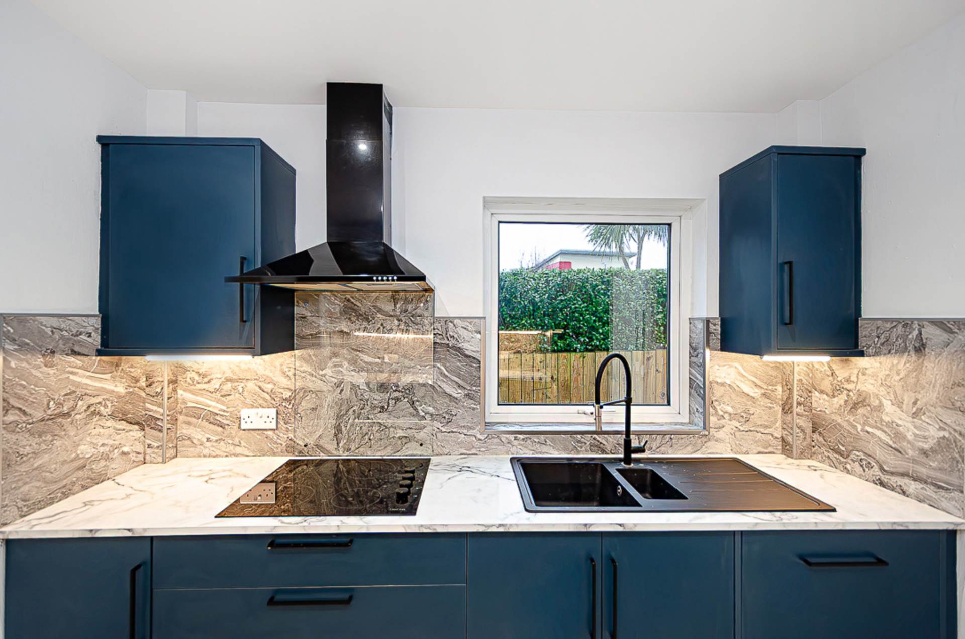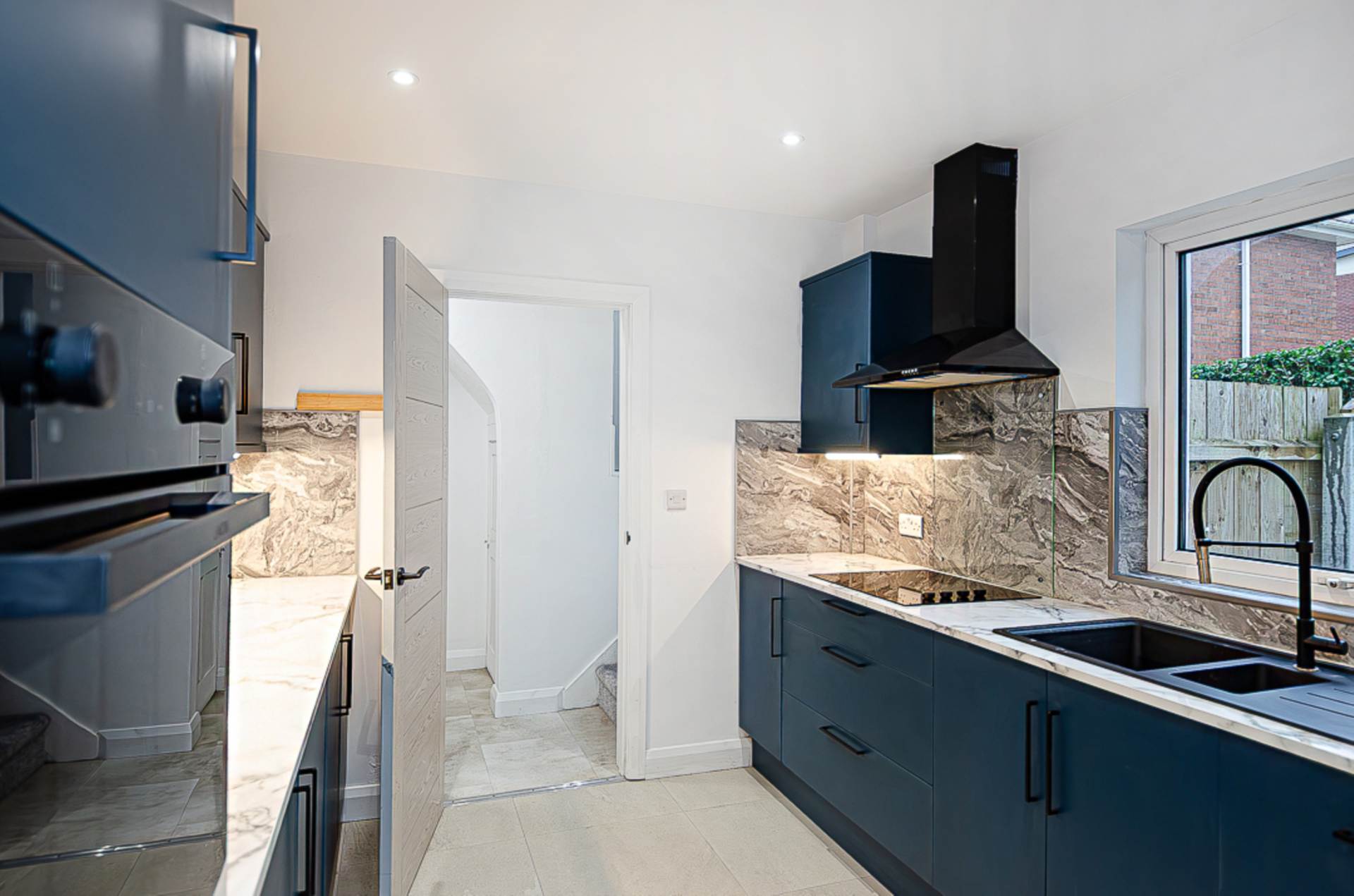 The contemporary kitchen is finished in a striking navy design and comes complete with integrated appliances, offering both practicality and modern style.