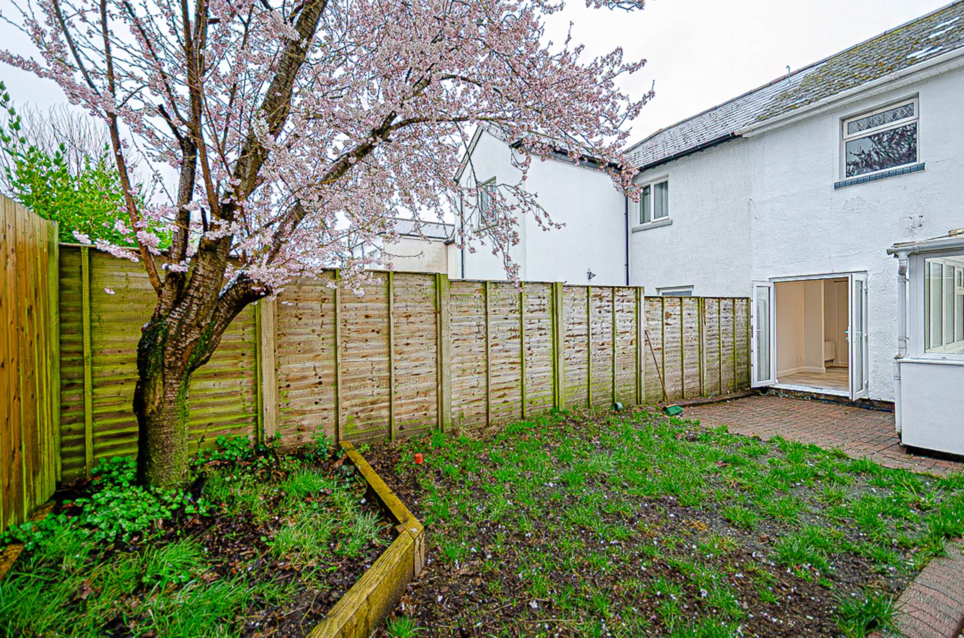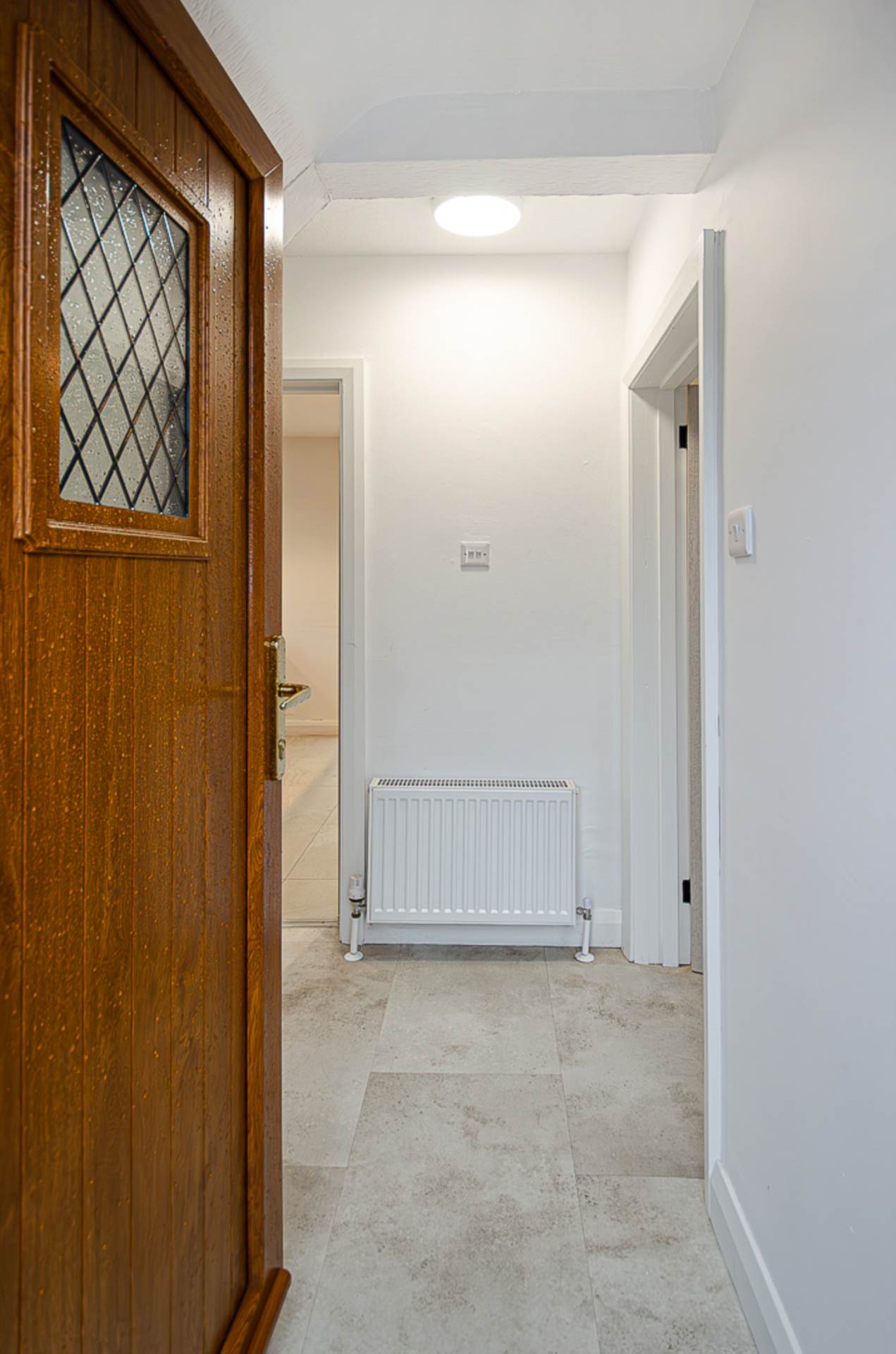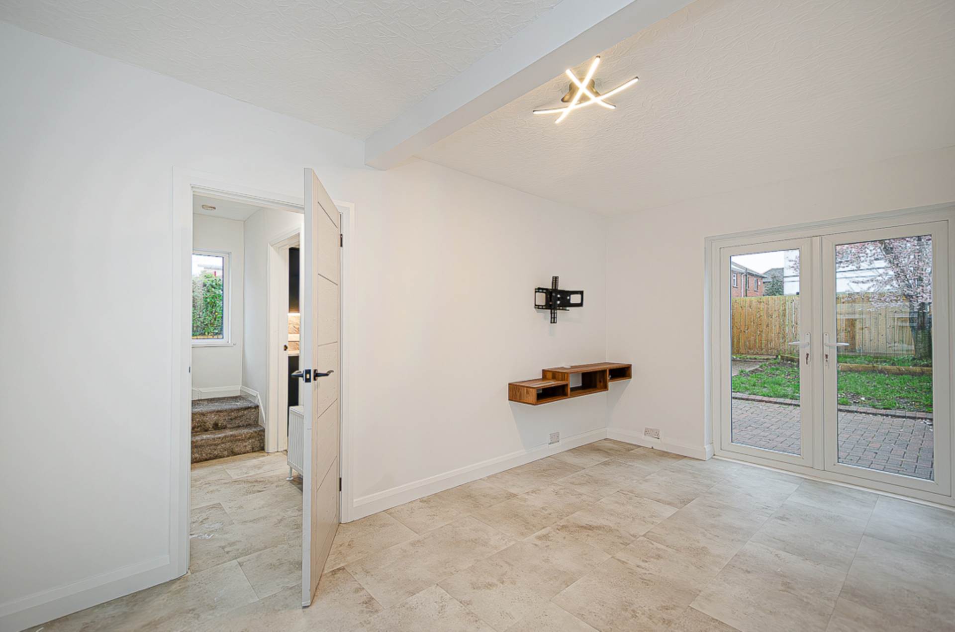 The property is entered via an entrance hall with stylish laminate flooring, leading through to a comfortable living room featuring French doors that open directly onto the garden, creating a bright and welcoming living space.