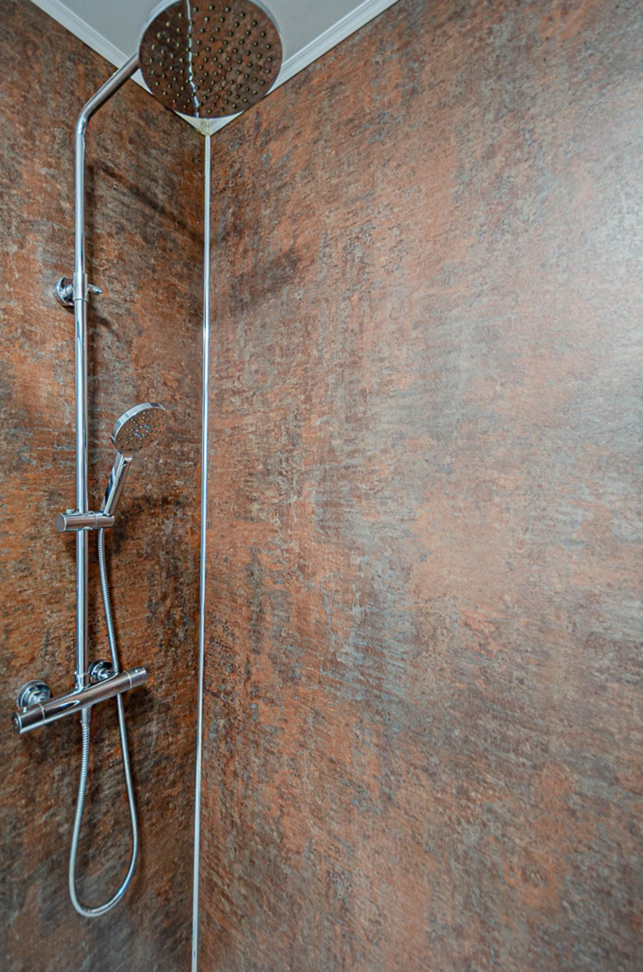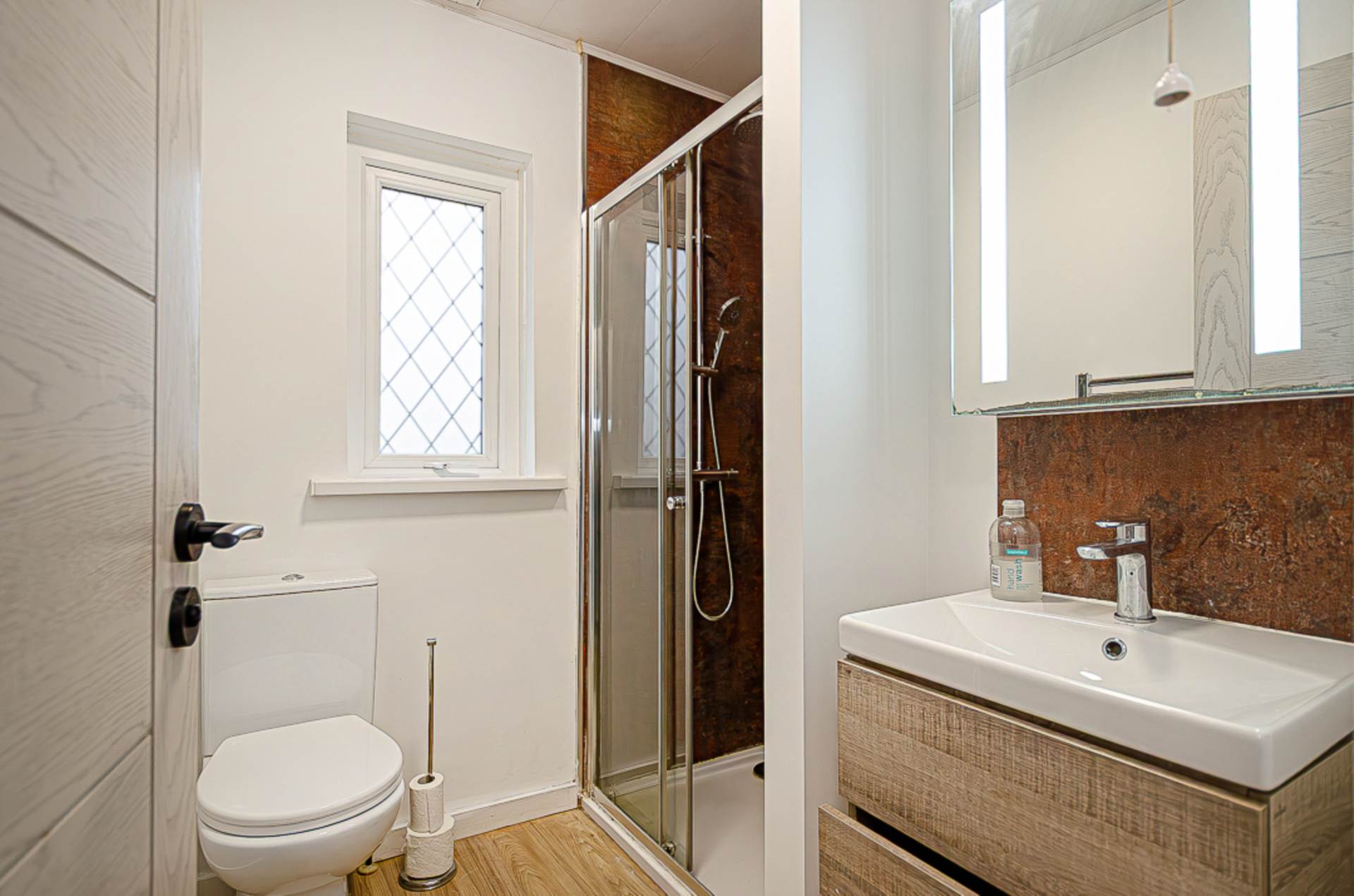 Shower room - 6'3" (1.91m) Max x 6'2" (1.88m)Shower cubicle with thermostatic shower and sliding door, wash hand basin in vanity unit, W.C., timber laminate floor, chrome towel rail radiator, P.V.C. panelled ceiling and extractor fan