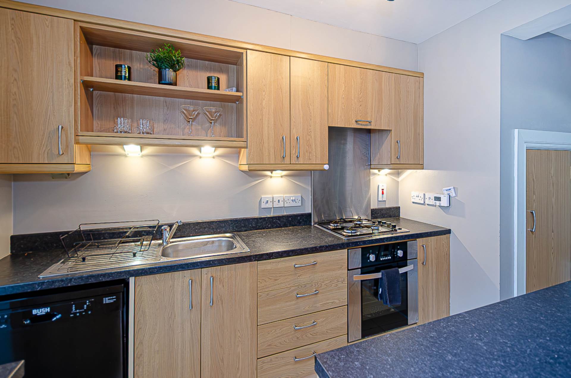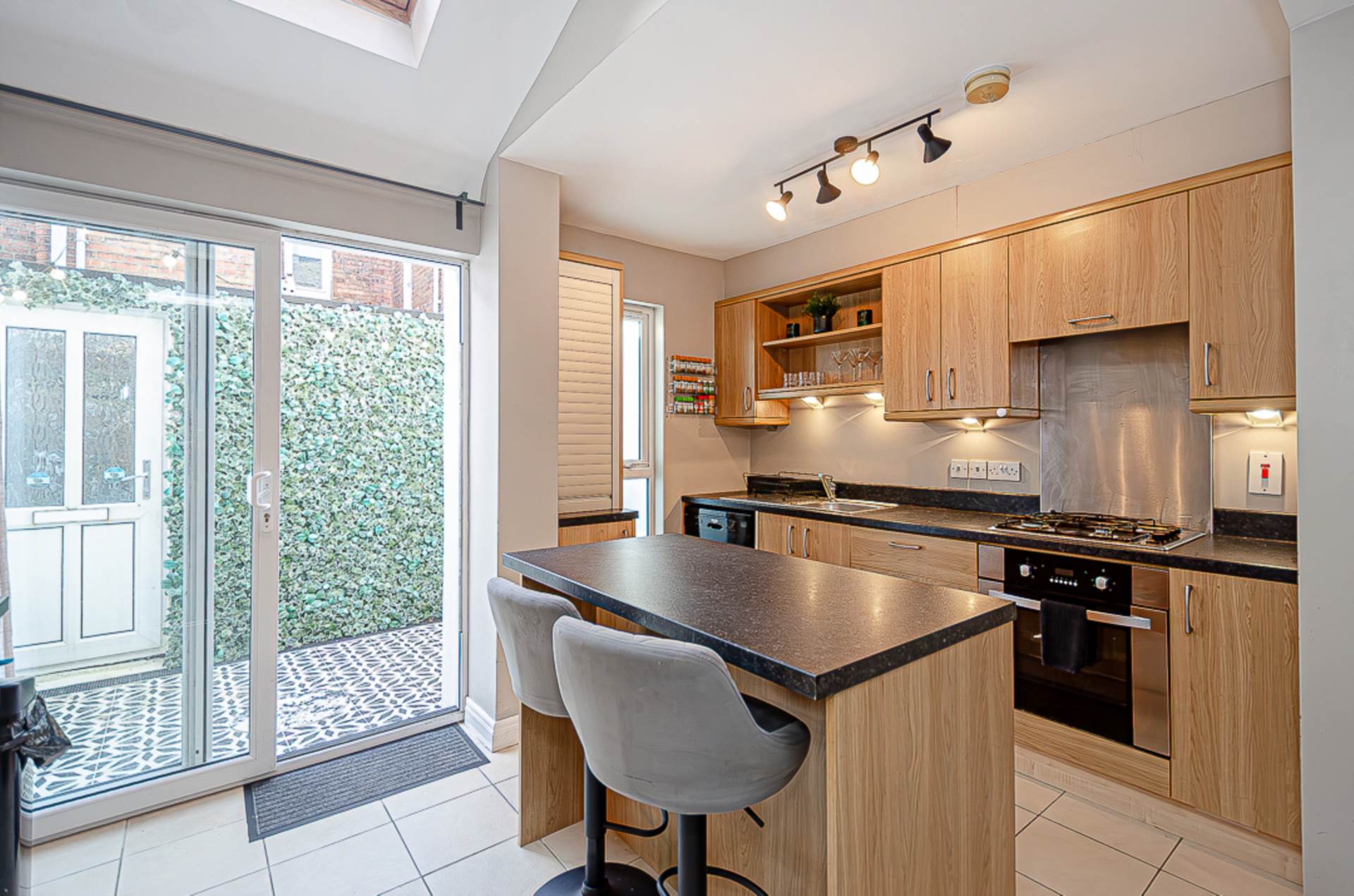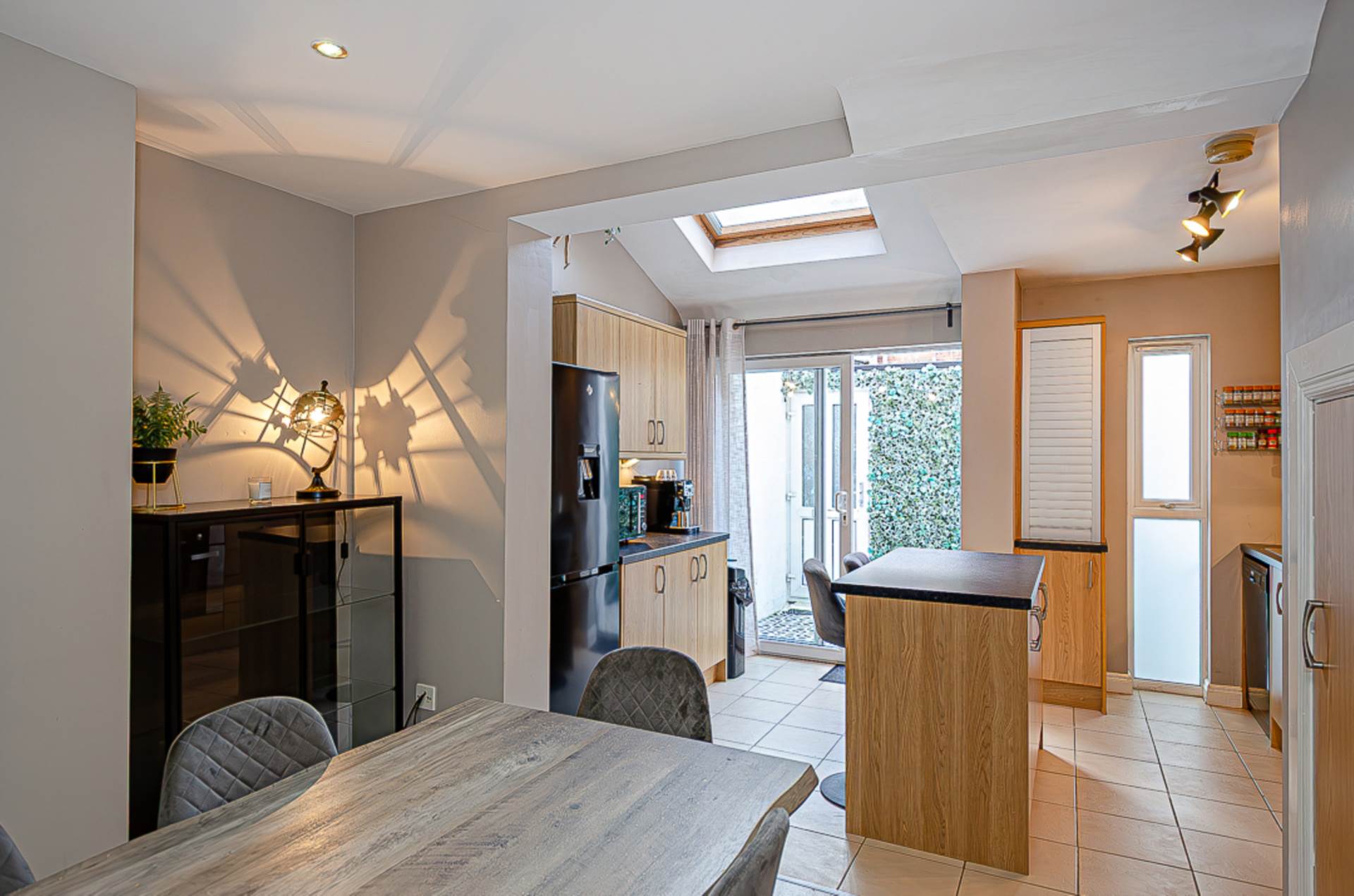 Open plan kitchen/dining room - 21'1" (6.43m) x 12'8" (3.86m)KitchenRange of high and low level fitted units, stainless steel oven, gas hob, stainless steel splashback, concealed extractor canopy, stainless steel sink, down lighting, island unit with space for seating, large Velux window in vaulted ceiling, spotlights, ceramic tiled floor and plumbing for washing machine