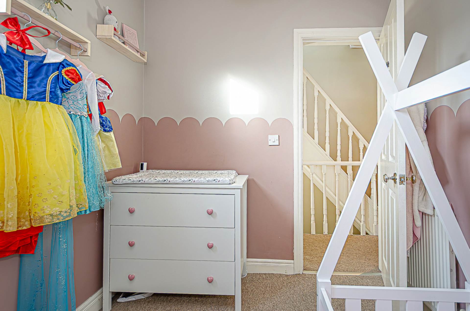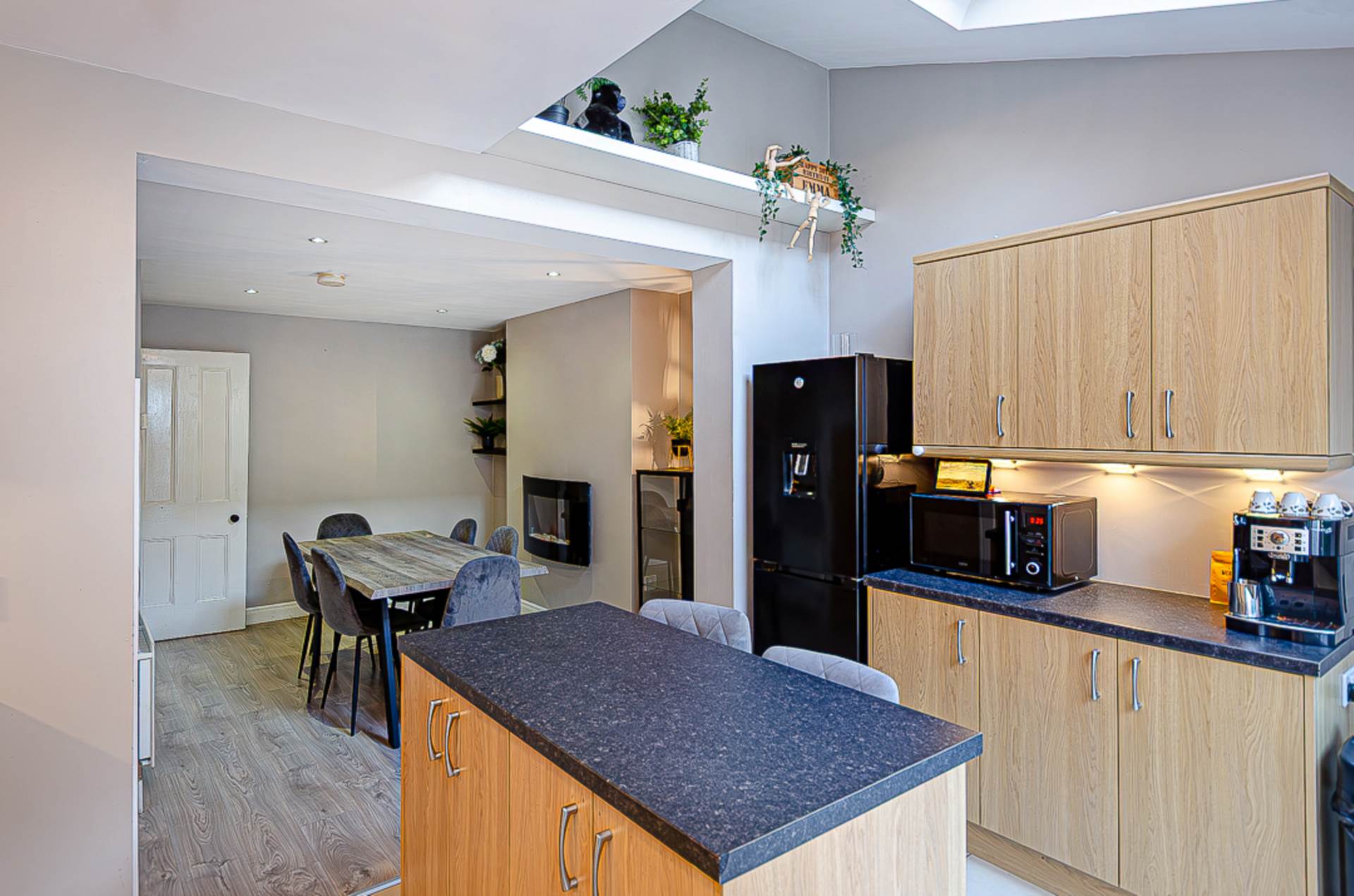 The welcoming entrance hall, finished with a timber laminate floor, sets the tone for the home. The bright living room features a charming bay window and a feature fireplace, creating a warm and inviting focal point. The extended kitchen, complete with a vaulted ceiling, flows seamlessly into the dining area, which benefits from a wall-hung electric fire an ideal space for family life and entertaining.