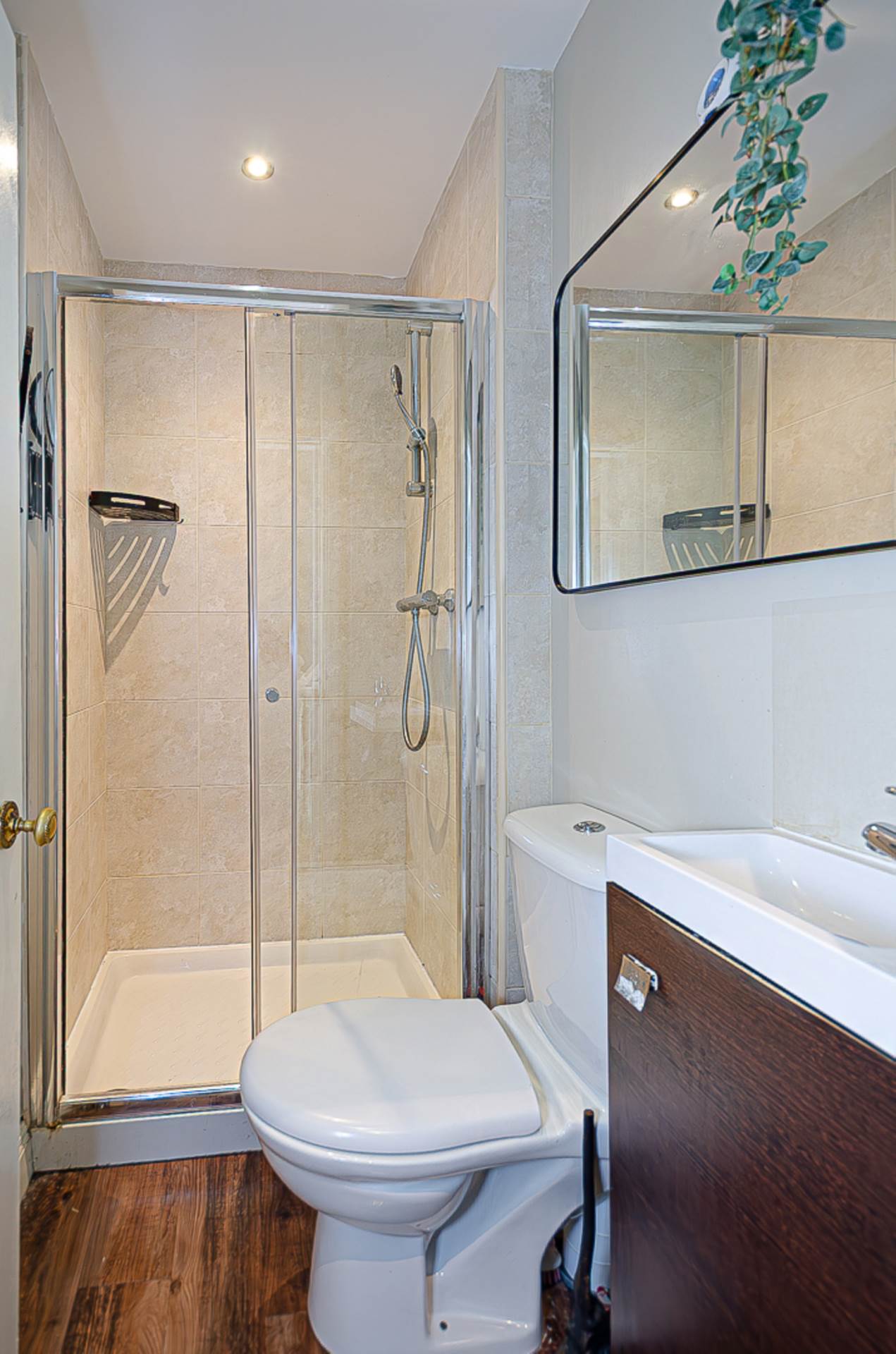 Shower room - 6'4" (1.93m) x 3'7" (1.09m)Shower cubicle with thermostatic shower and sliding door, wash hand basin in vanity unit, W.C., timber laminate floor, recessed spotlights and extractor fan